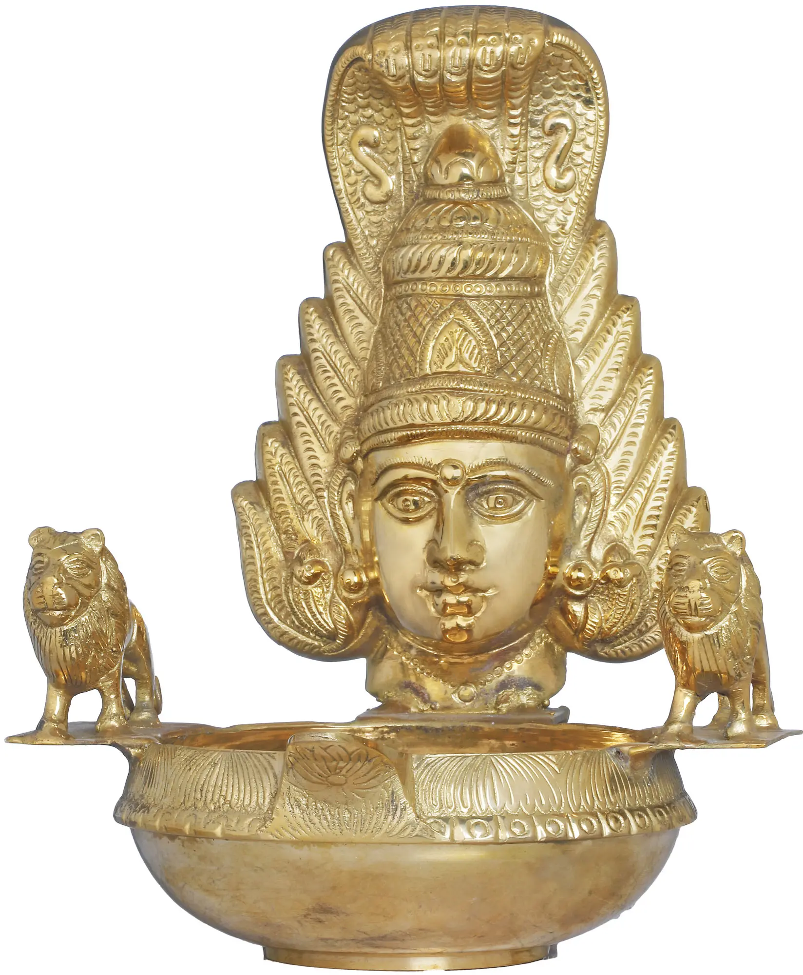 Immerse yourself in the radiance of spirituality with the Large Diya with Goddess Mask from South India. Handcrafted with devotion and precision in India, this diya is more than just a source of light; it's a homage to the divine. The goddess mask, a symbol of grace and power, adorns this brass masterpiece. As you light the diya, it transforms into a beacon of spirituality, illuminating your sacred space with a sense of serenity and reverence. This diya is a testament to the fusion of Indian craftsmanship and devotion, an embodiment of the timeless beauty of South Indian traditions and artistry.