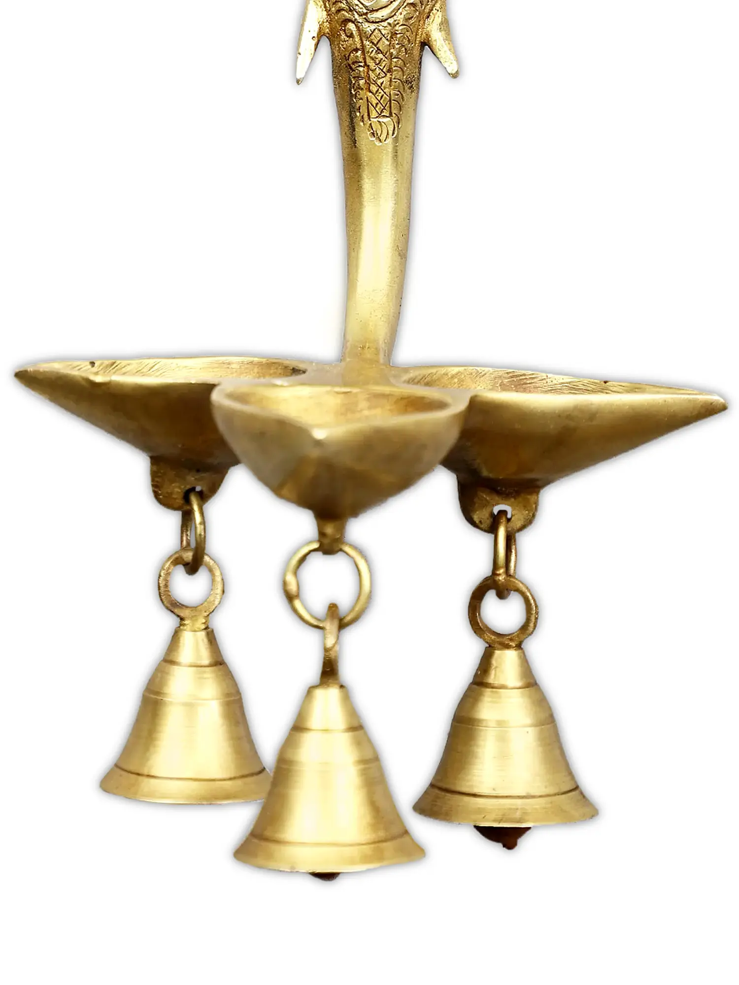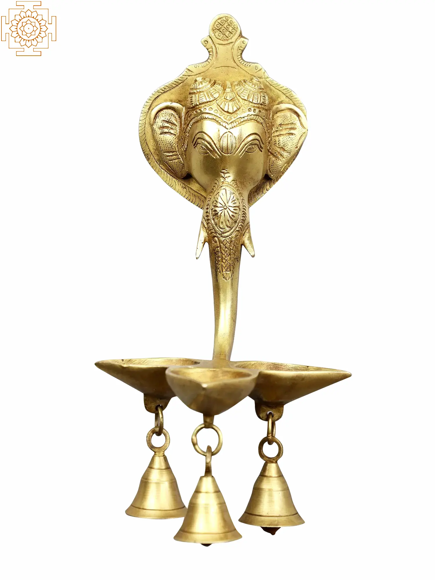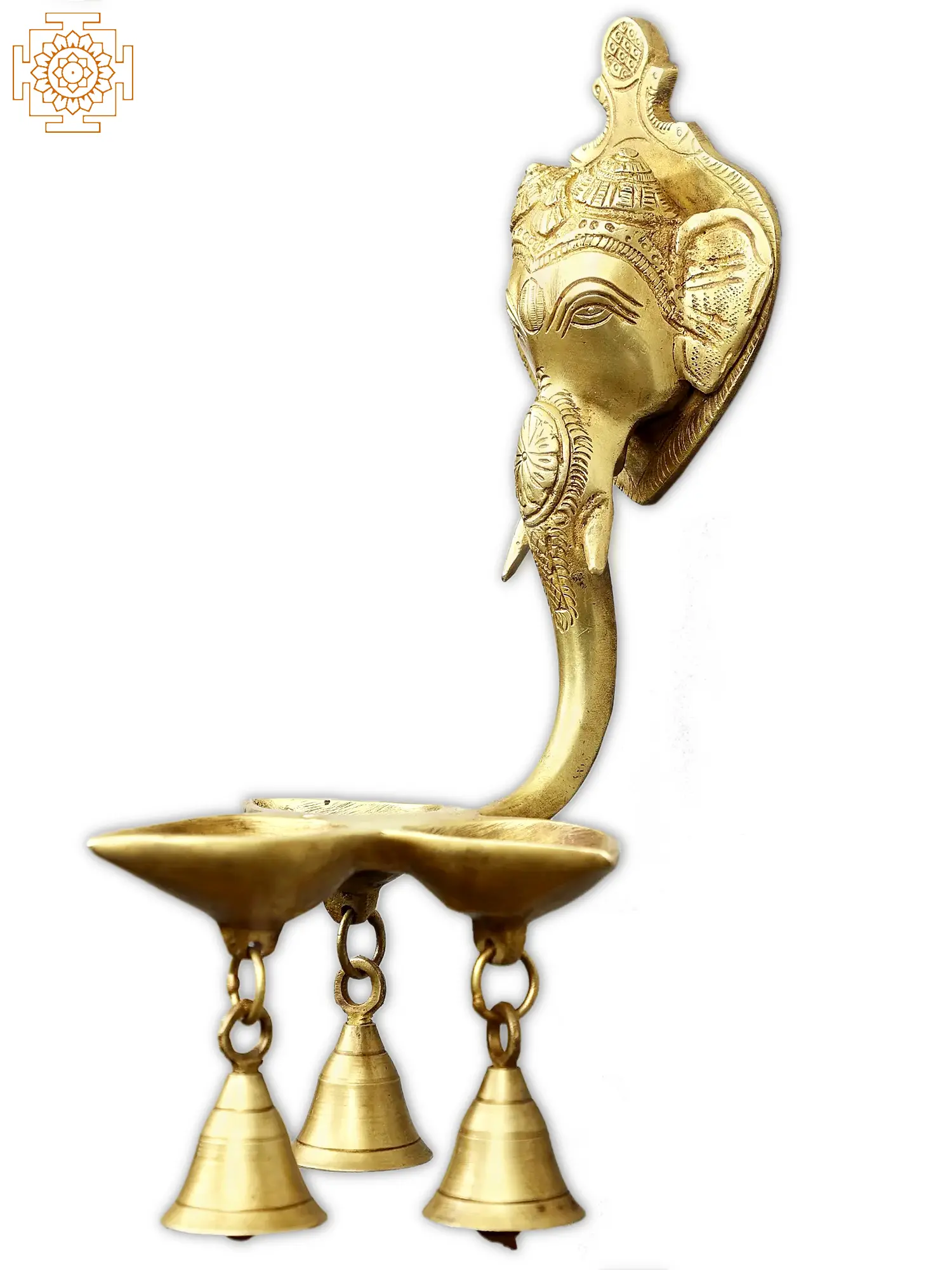 This brass lamp with a Ganesha head pays homage to Lord Ganesha, the creator of all things in the universe. Ganesha, the Lord of the Universe, is shown magnificently, looking compassionately at his devotees. This piece of art incorporates everything religious, whether it's the figure of Lord Ganesha or the presence of the lights, which aid the image. The bells beneath the lamp represent the cosmic vibrations that produce happiness. The art is highly original. The warm blessings of the deities, as well as the holy sound and patronage of Lord Ganesha, are provided by lighting this lamp.