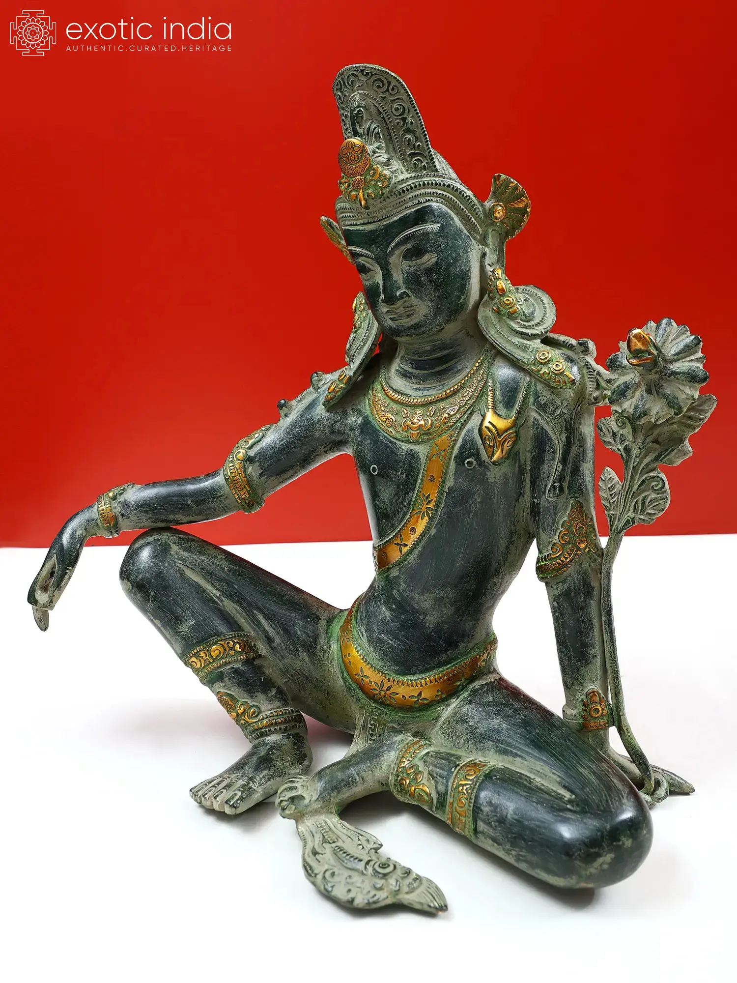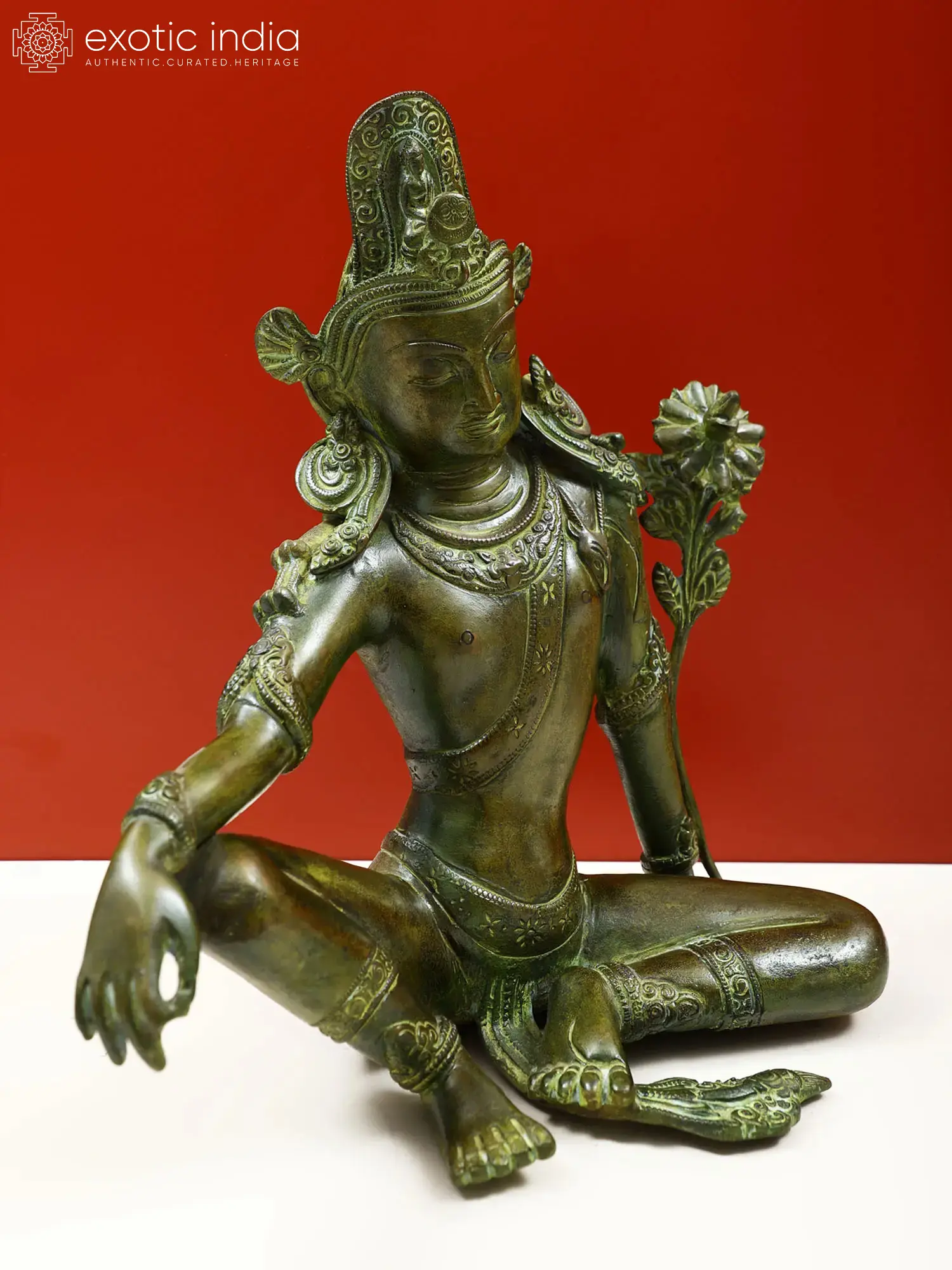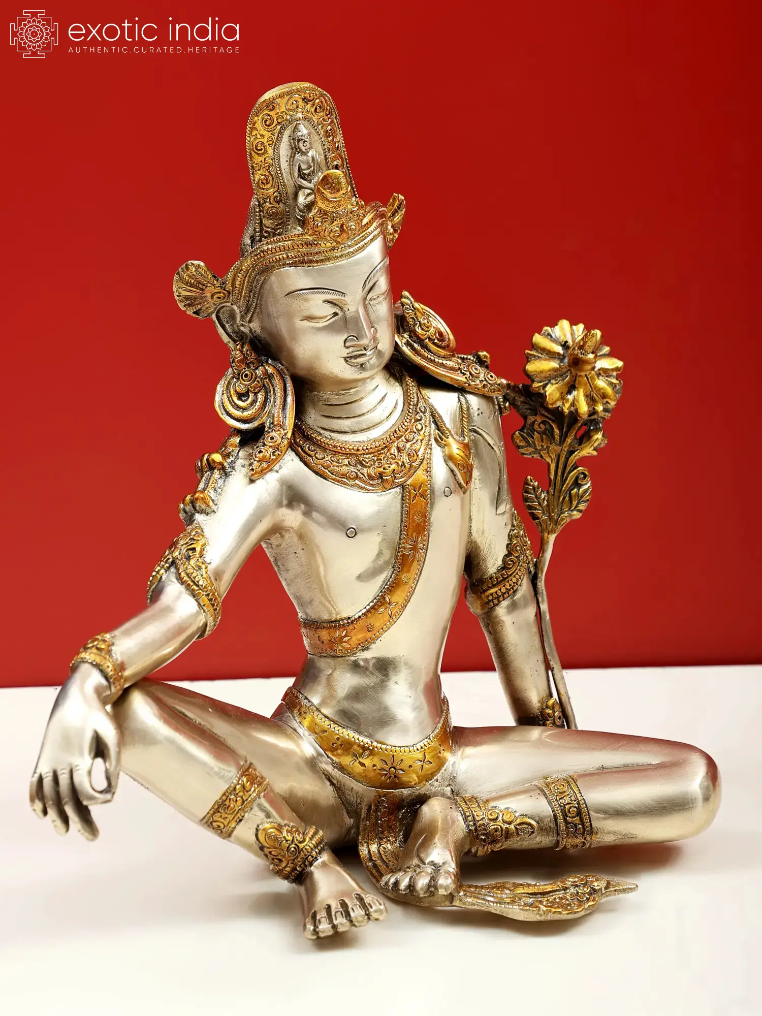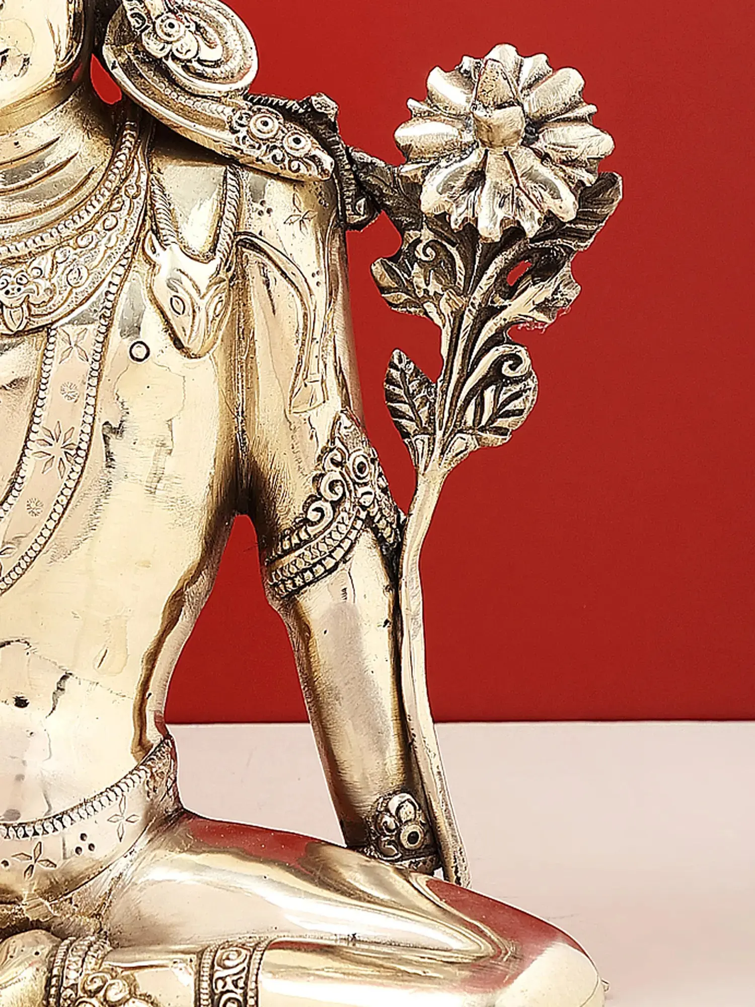 This exquisite brass sculpture captures the regal essence of Lord Indra, the king of the gods in Hindu mythology, and a significant figure in Buddhist traditions as well. Crafted with remarkable detail, the deity is depicted in a serene yet powerful seated posture, exuding an aura of divine authority and tranquil wisdom. The rich patina of the brass lends an antique charm, suggesting centuries of veneration and spiritual significance. The intricate ornamentation adorning the figure, from the elaborate crown to the delicate bangles and anklets, speaks to the opulence and majesty associated with Indra, often described as ruling over Svarga, the heavenly kingdom. ––––––––––