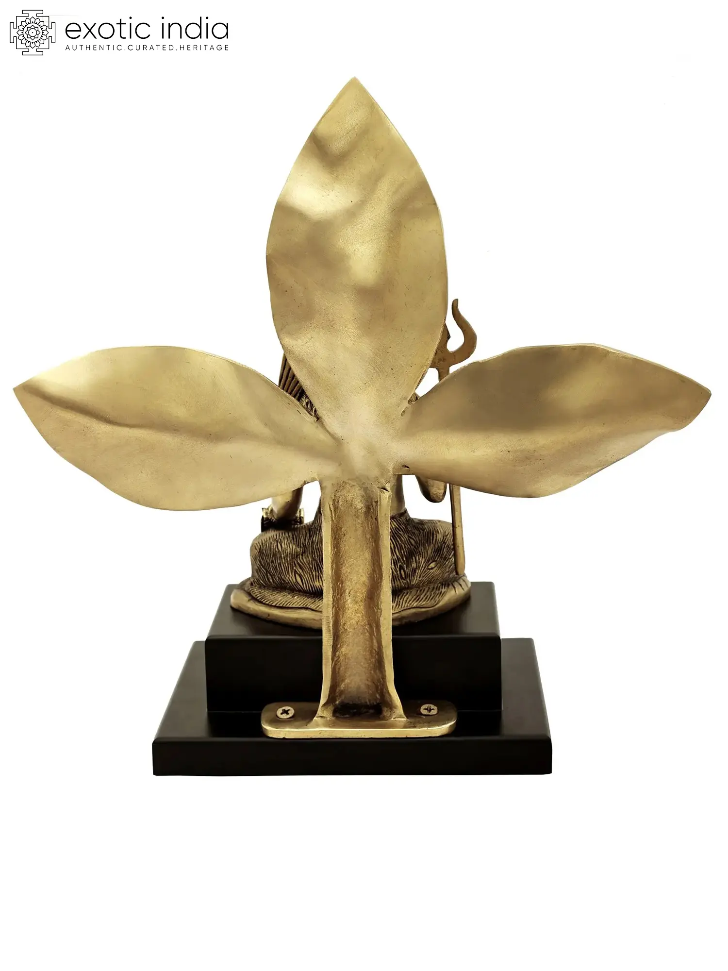 The wooden stand adds an earthy touch, enhancing the spiritual ambiance. This brass masterpiece not only honors the symbolism of Bael Patra in Shiva worship but also serves as a sublime focal point for devotees, fostering a connection with the sacred trinity and Lord Shiva's blessings.