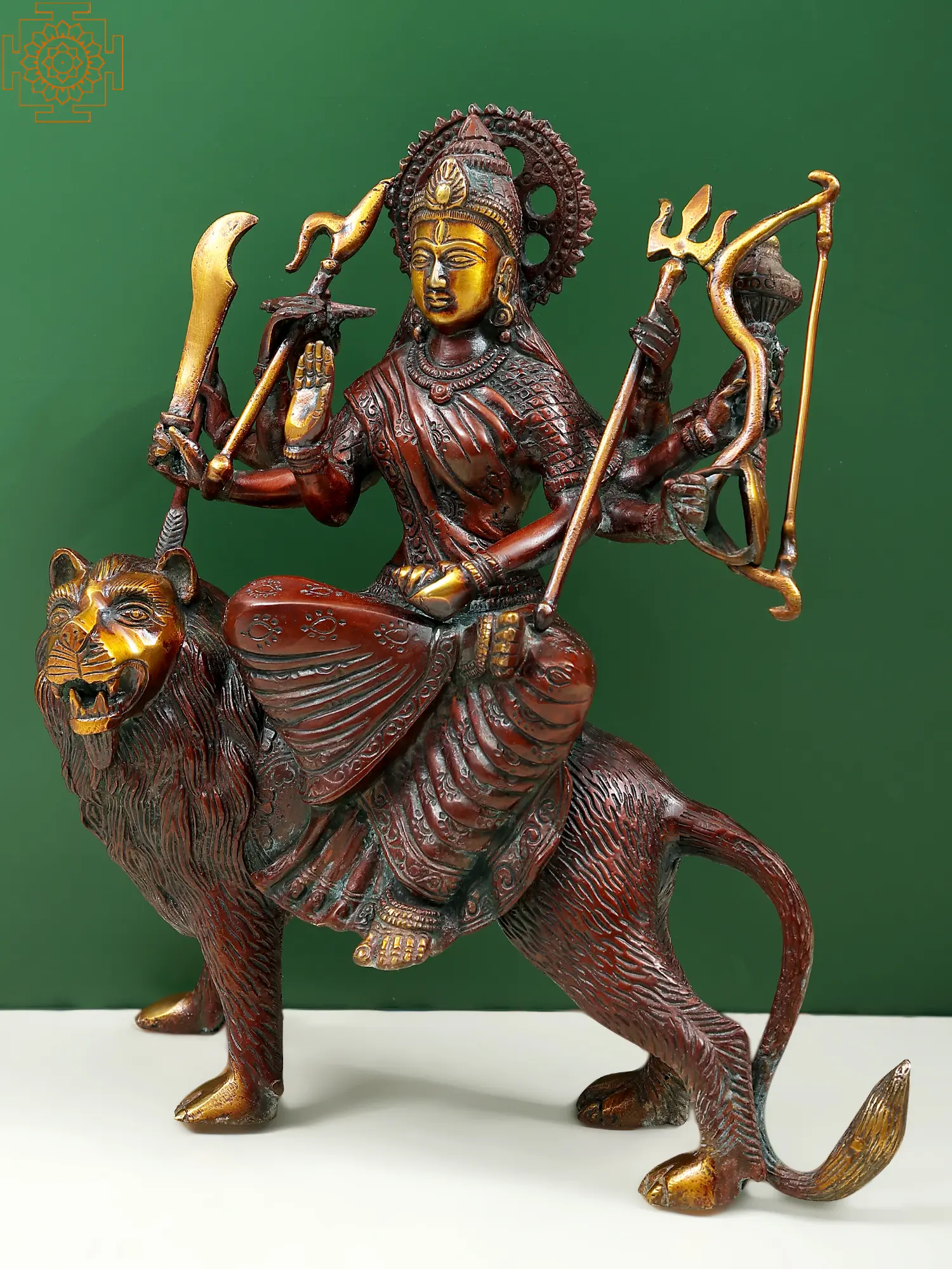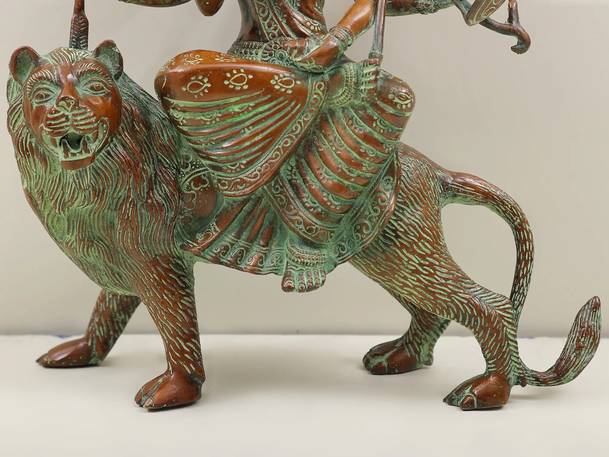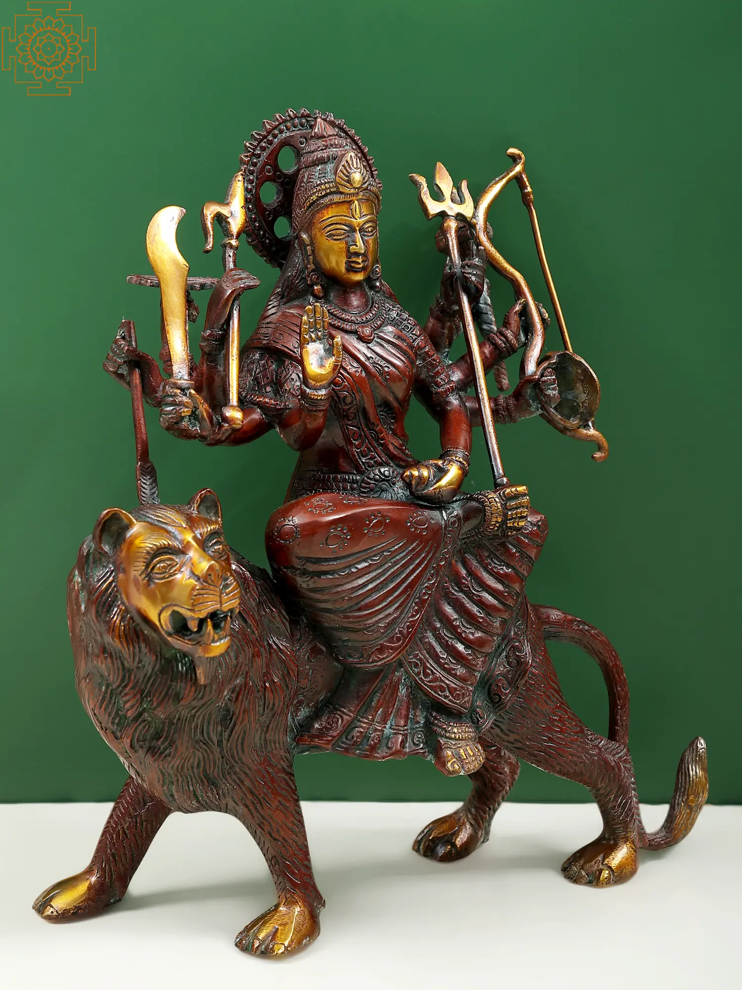 Explore the divine grace of Mother Goddess Durga as she sits atop her fearless lion, beautifully depicted in brass. Durga, the warrior goddess, represents the power of the divine feminine, embodying strength, courage, and protection. Durga's presence signifies the victory of good over evil and the limitless potential of the feminine energy. This idol pays homage to the nurturing aspect of the Devi. Place it in your home to invoke the protective and nurturing energy of Mother Goddess Durga.