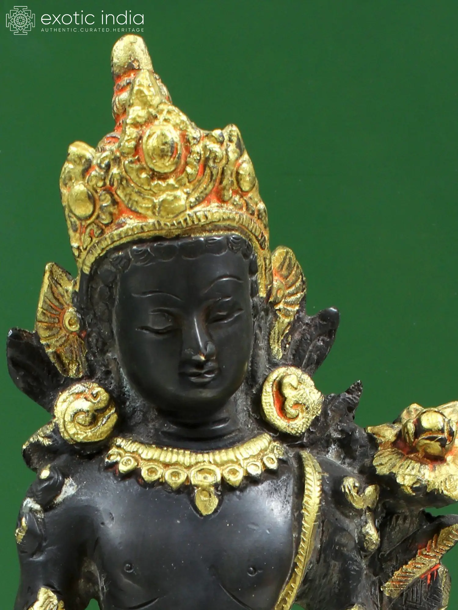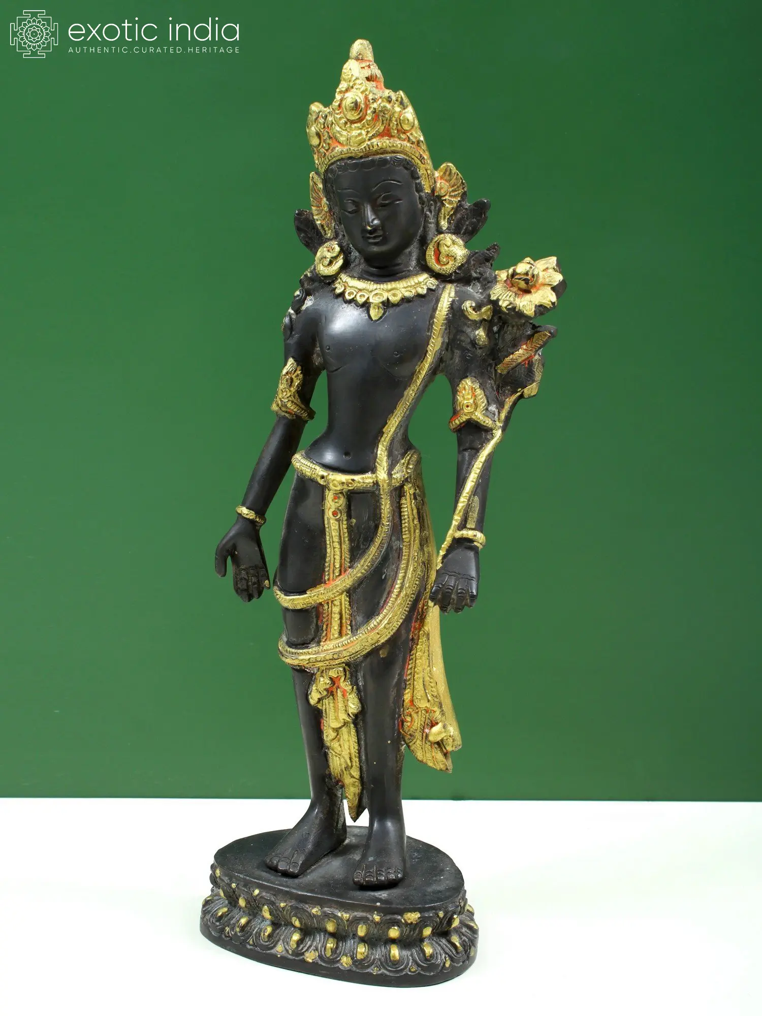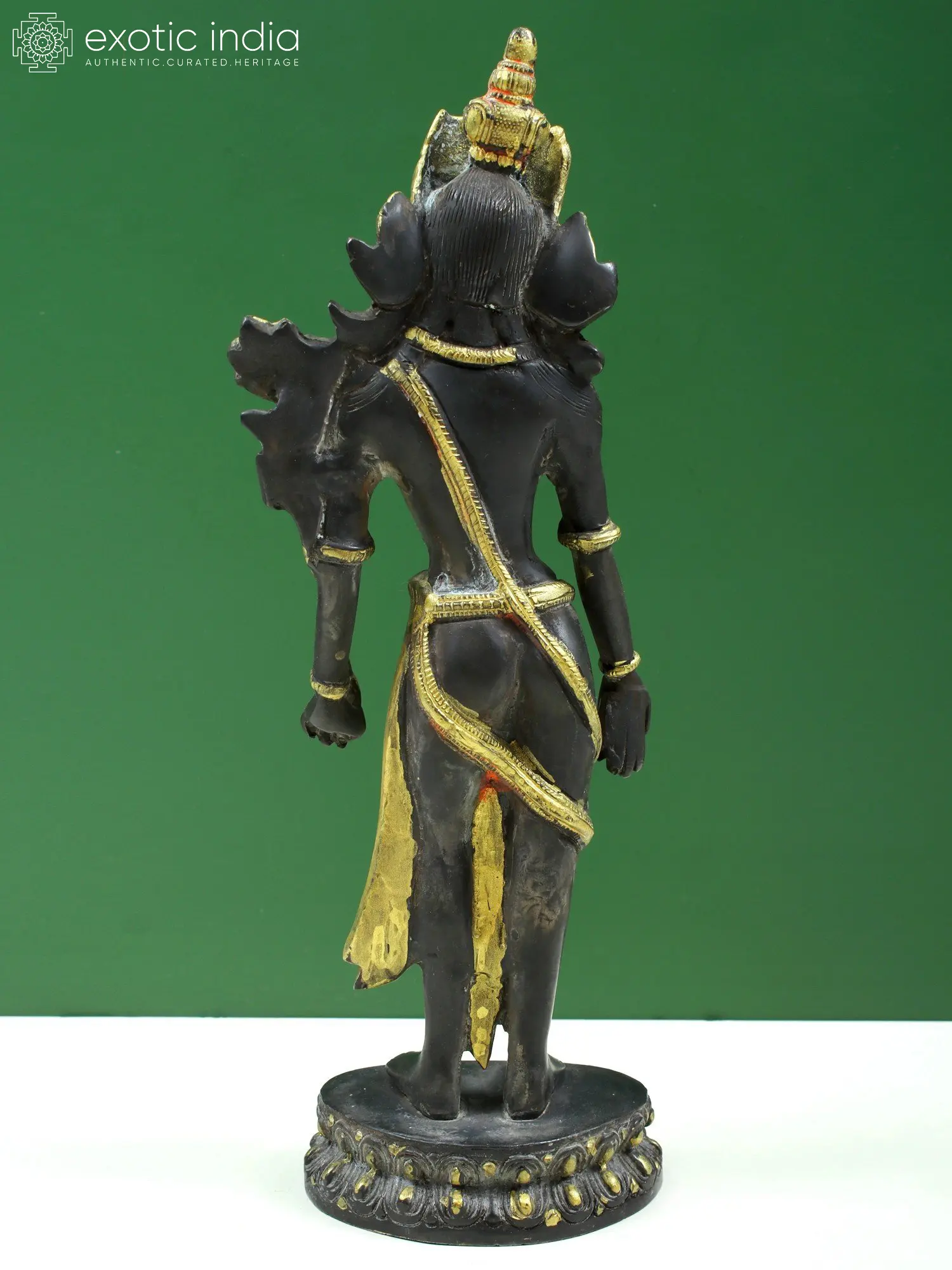 This exquisite brass statue captures the serene and compassionate essence of Padmapani Avalokiteshvara, the Bodhisattva of Compassion. In Buddhist traditions, Avalokiteshvara is revered as the embodiment of the mercy of all Buddhas, a being who has vowed to delay their own enlightenment until all sentient beings are liberated from suffering. The epithet "Padmapani" translates to "lotus-bearer," referencing the celestial lotus flower, a symbol of purity and enlightenment, often depicted in the deity's hand, though here it is gracefully represented blooming on his shoulder. The craftsmanship of this piece is remarkable, showcasing the rich artistic heritage associated with Buddhist iconography. The deep, almost midnight black patina of the brass forms a striking contrast with the intricate gold leaf embellishments that adorn the figure. These gilded details highlight the divine nature of Avalokiteshvara, accentuating his regal crown, ornate jewelry, and the flowing sashes that drape his form. The serene facial expression, with downcast eyes and a gentle smile, invites contemplation and embodies the profound peace that comes with spiritual awakening.
