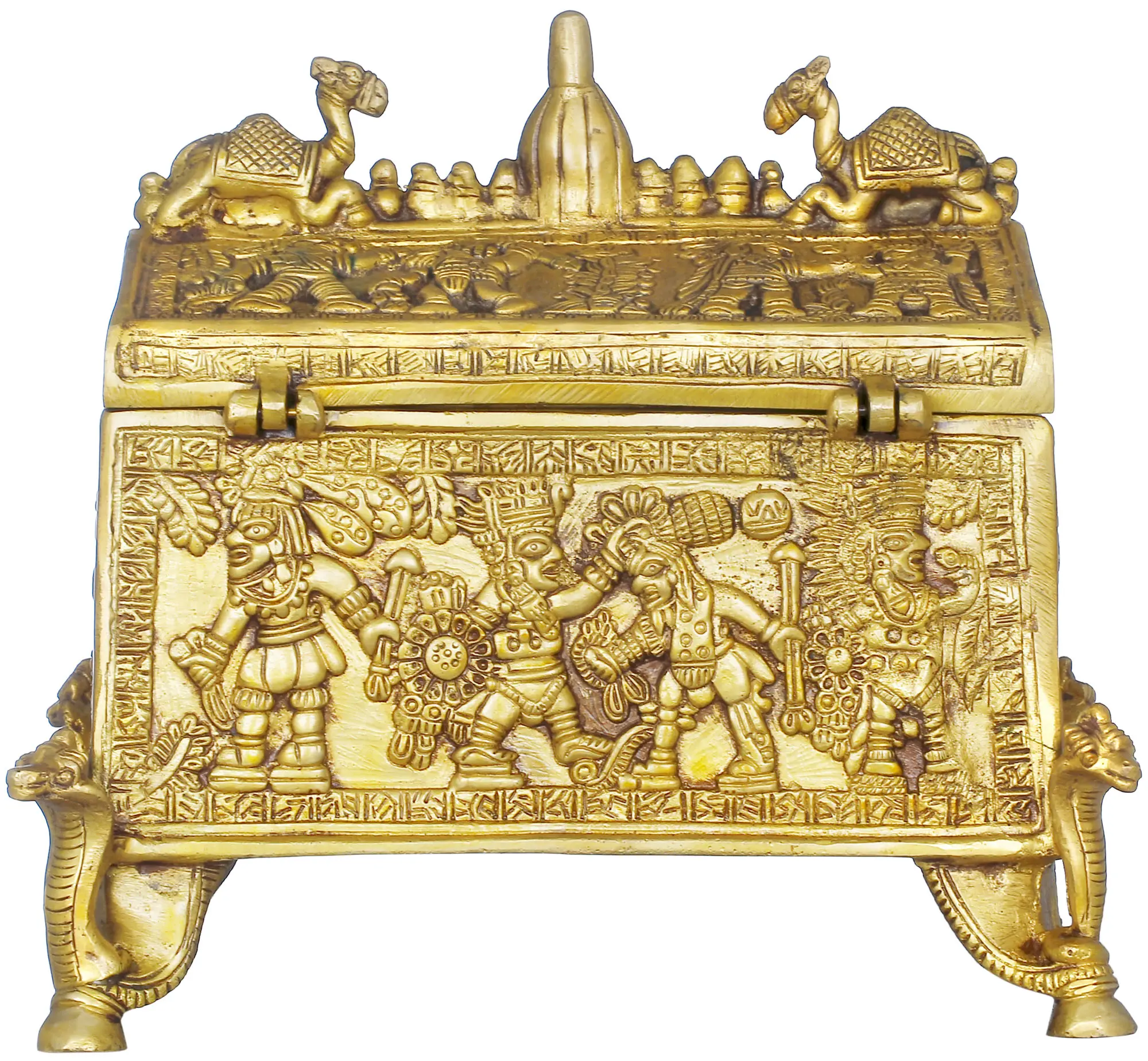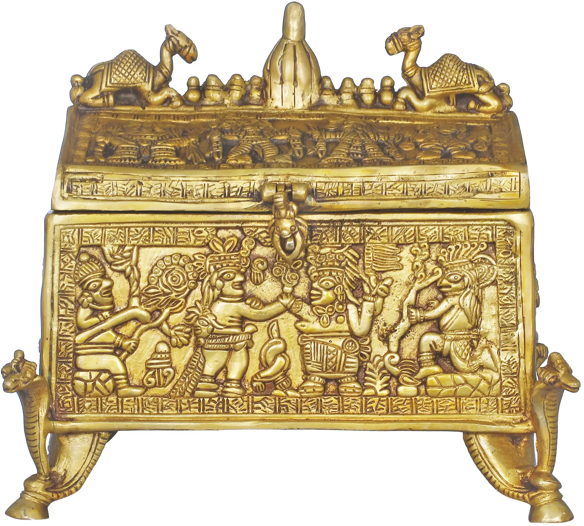 Unearth the treasure of tradition and artistry with the brass Tribal Treasure Box Decorated with Various Figures. This is no ordinary box, it's a journey into the heart of India's rich cultural heritage. Handcrafted with meticulous care, it's not just a container, it's a tapestry of artistic expression and symbolism. Adorned with various figures, it tells a story of the subcontinent's diverse traditions. As you open it to reveal your most cherished items, it becomes a vessel for your own stories, enriching your space with the essence of Indian craftsmanship and cultural diversity. This Tribal Treasure Box is a living testament to the enduring beauty of Indian art and tradition.