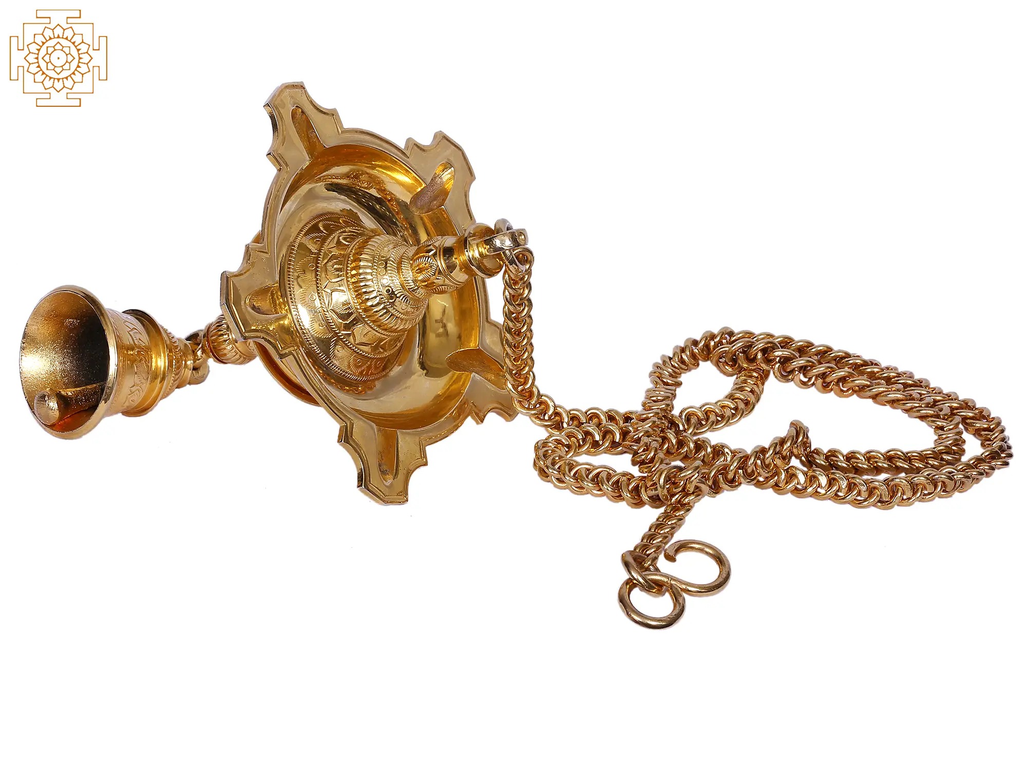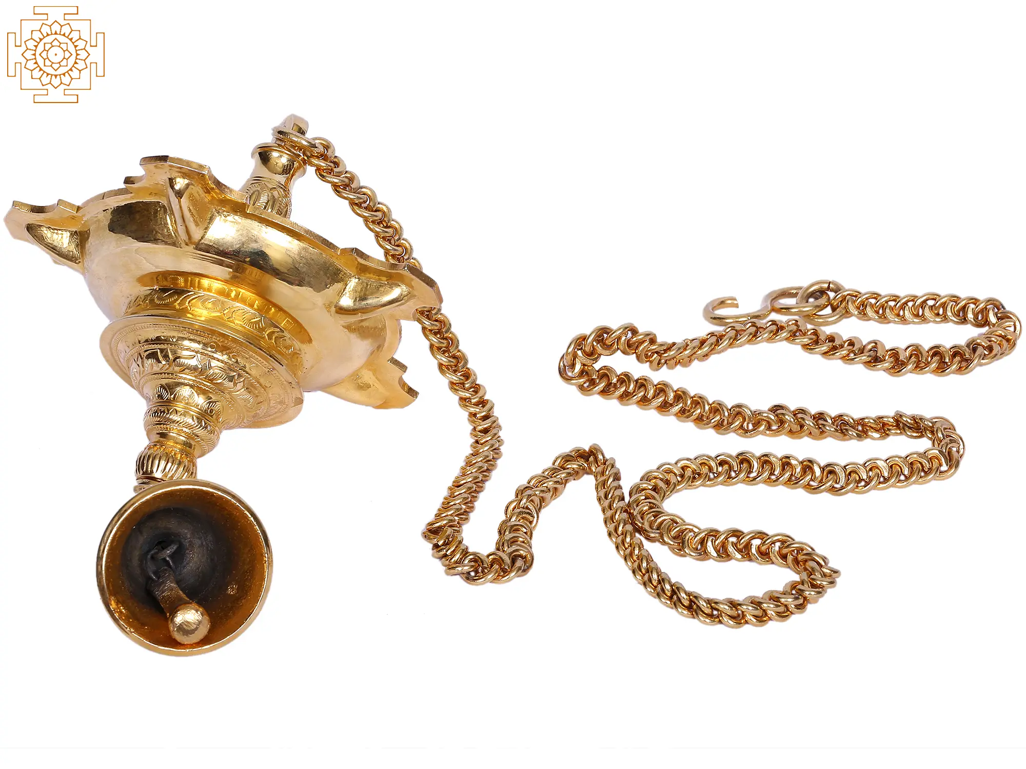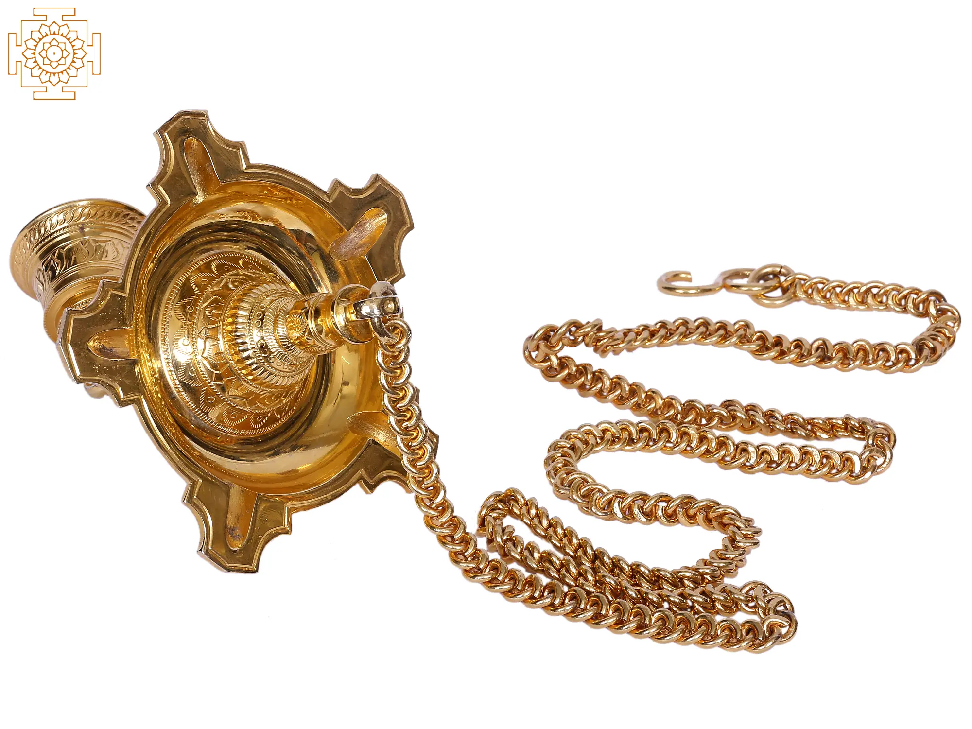 A lamp is usually considered fortunate as a symbol of Surya (sun) and Agni (fire). This five-wicked hanging lamp is a wonderful depiction of the light's status as the supplier of wisdom and Marga Darkshak (pathfinder). This lamp is made of high-quality bronze and has a gorgeous shining golden color. There is also a strong chain to hold the weight of the light when it is hanging. As ceremonial artifacts used for illuminating a room, these lamps are particularly important in temple design and ceremonies.