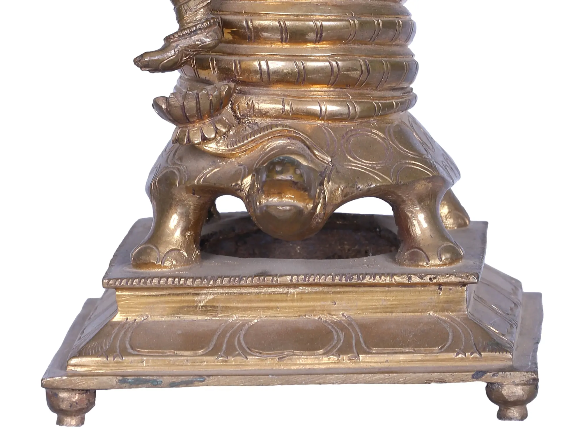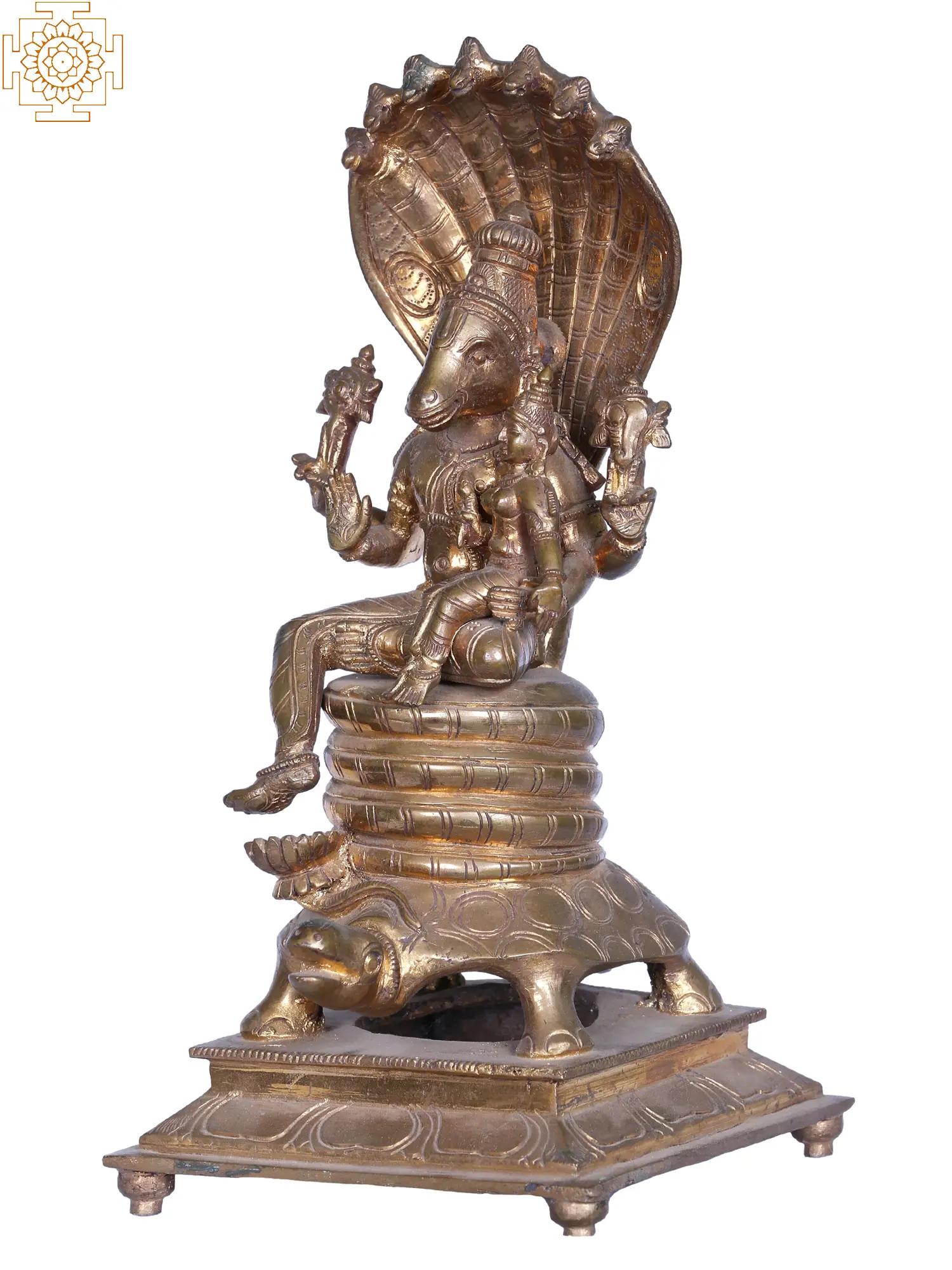 The entire divine ensemble is supported by a majestic tortoise, representing the Kurma Avatar of Lord Vishnu, the divine foundation upon which the universe rests. The tortoise, a symbol of stability, endurance, and cosmic order, provides a stable and grounding presence to the divine figures. Above them, the protective hood of Sheshnag, the celestial serpent king, unfurls, signifying eternal vigilance and the endless cosmic cycle. Sheshnag is often depicted as the couch upon which Lord Vishnu reclines, representing the boundless expanse of divine consciousness.