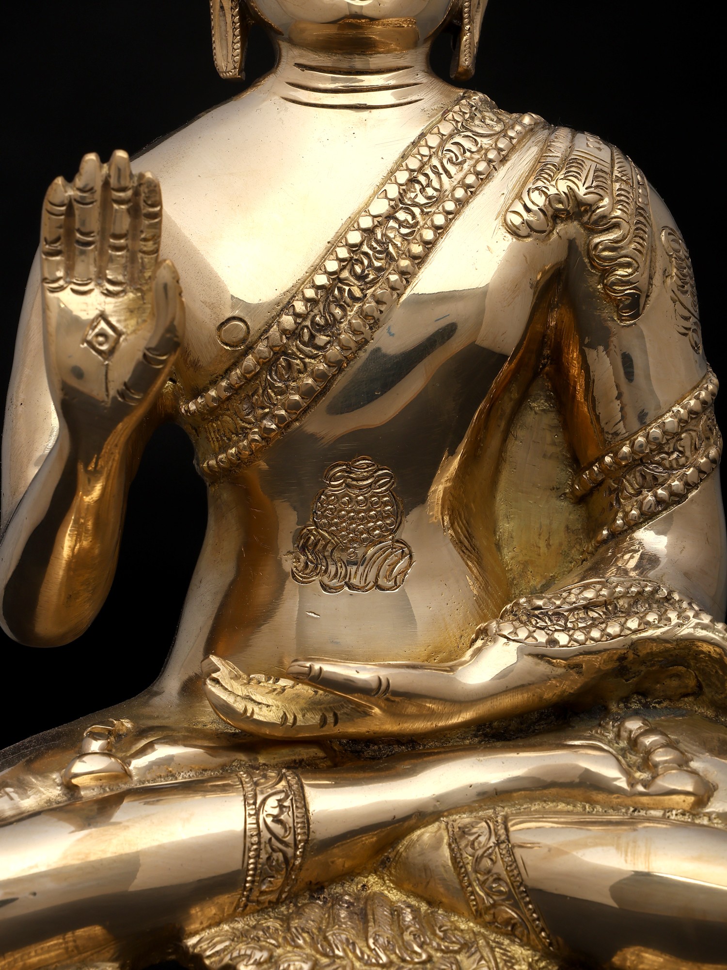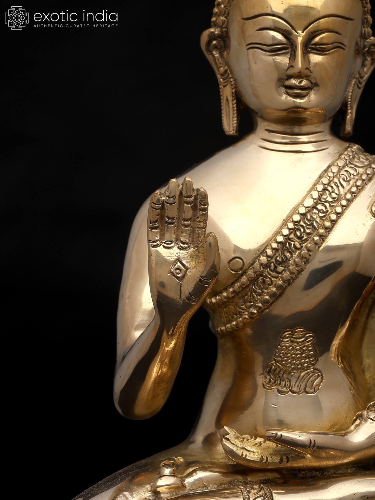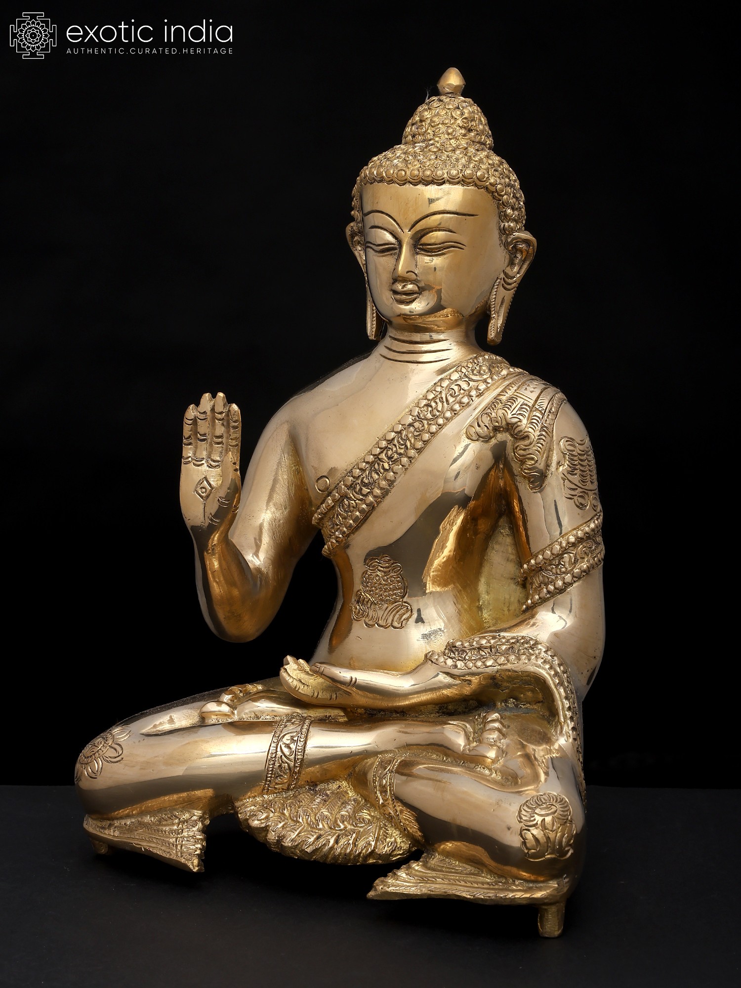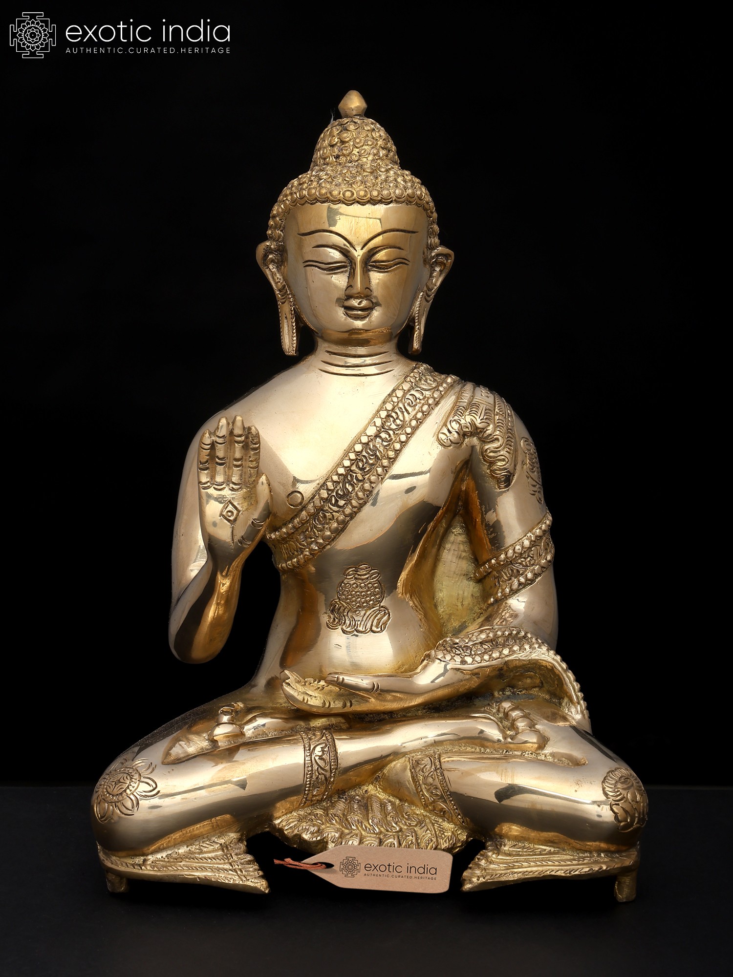 A brass sculpture depicting Buddha in the Abhaya and Dhyana Mudras is a powerful representation of the enlightened one. In this depiction, Buddha is shown seated in a meditative posture, with crossed legs and a serene countenance. His right hand is raised in the Abhaya Mudra, a gesture of fearlessness and protection, symbolizing the dispelling of fear and granting of assurance to his devotees. His left-hand rests on his lap in the Dhyana Mudra, signifying deep meditation and spiritual concentration. The intricate details of the brass sculpture bring out the tranquility and spiritual presence of the Buddha. This portrayal serves as a reminder of the Buddha's profound teachings on inner peace, fearlessness, and the path to enlightenment, making it a cherished representation of Buddhist philosophy and practice.