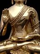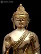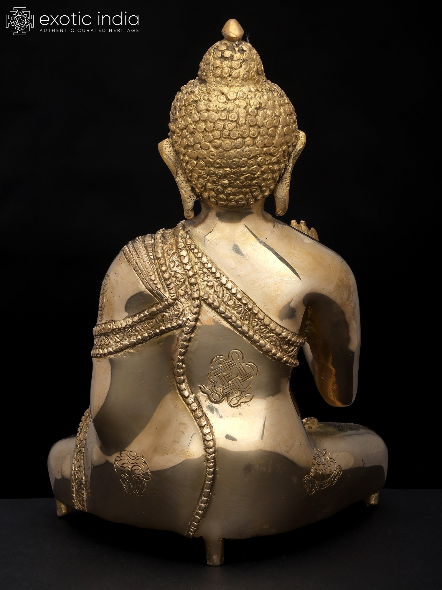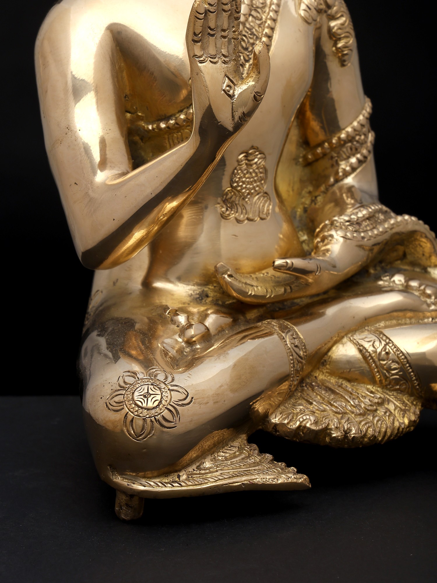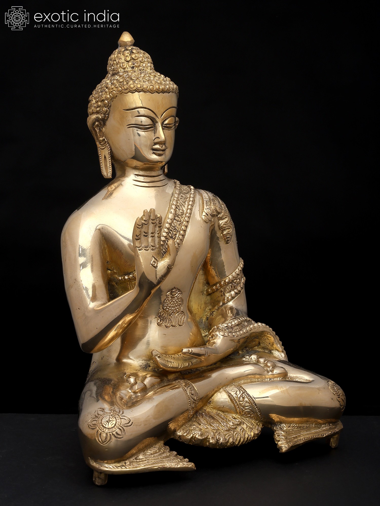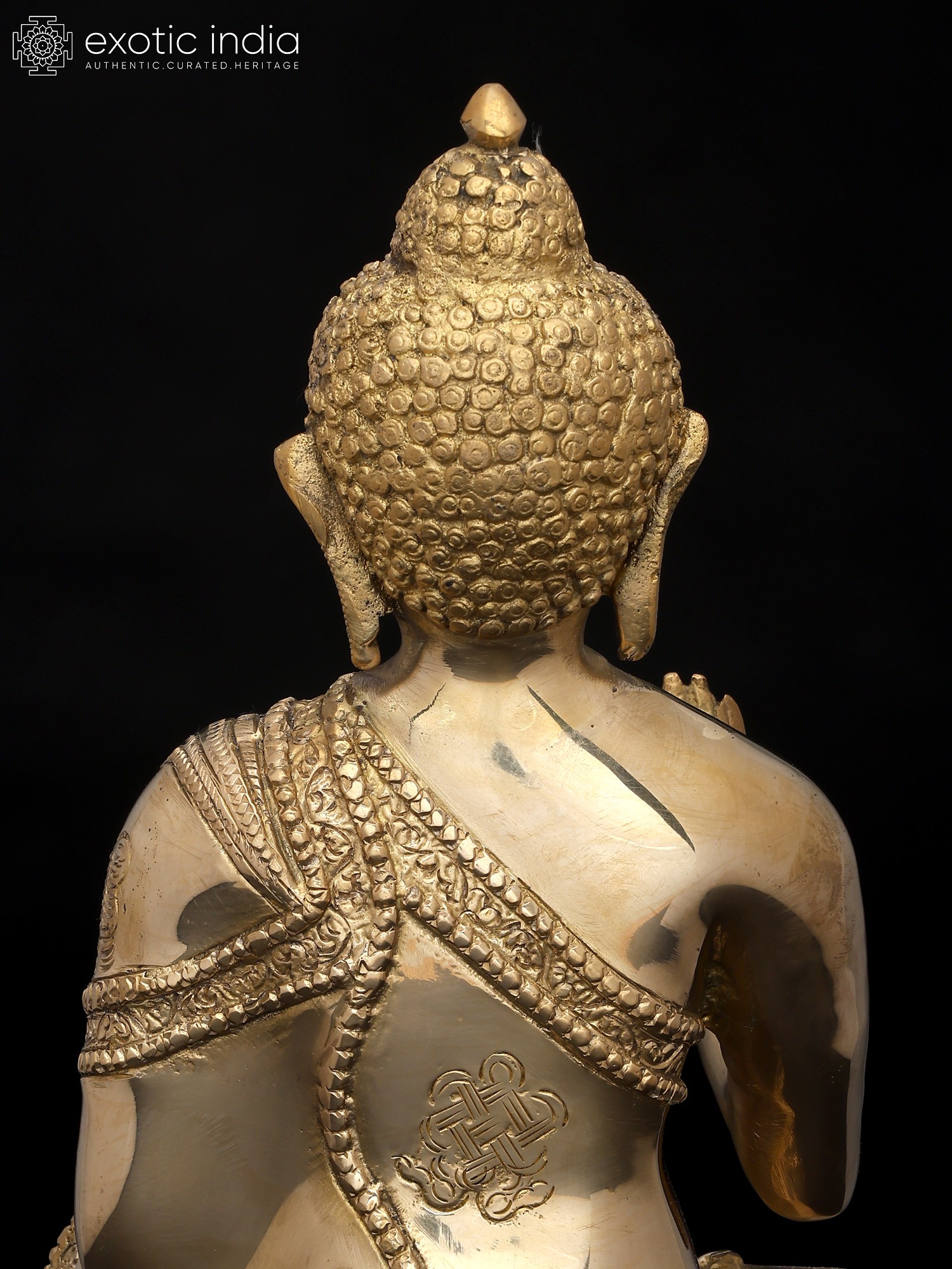 A brass sculpture depicting Buddha in the Abhaya and Dhyana Mudras is a powerful representation of the enlightened one. In this depiction, Buddha is shown seated in a meditative posture, with crossed legs and a serene countenance. His right hand is raised in the Abhaya Mudra, a gesture of fearlessness and protection, symbolizing the dispelling of fear and granting of assurance to his devotees. His left-hand rests on his lap in the Dhyana Mudra, signifying deep meditation and spiritual concentration. The intricate details of the brass sculpture bring out the tranquility and spiritual presence of the Buddha. This portrayal serves as a reminder of the Buddha's profound teachings on inner peace, fearlessness, and the path to enlightenment, making it a cherished representation of Buddhist philosophy and practice.