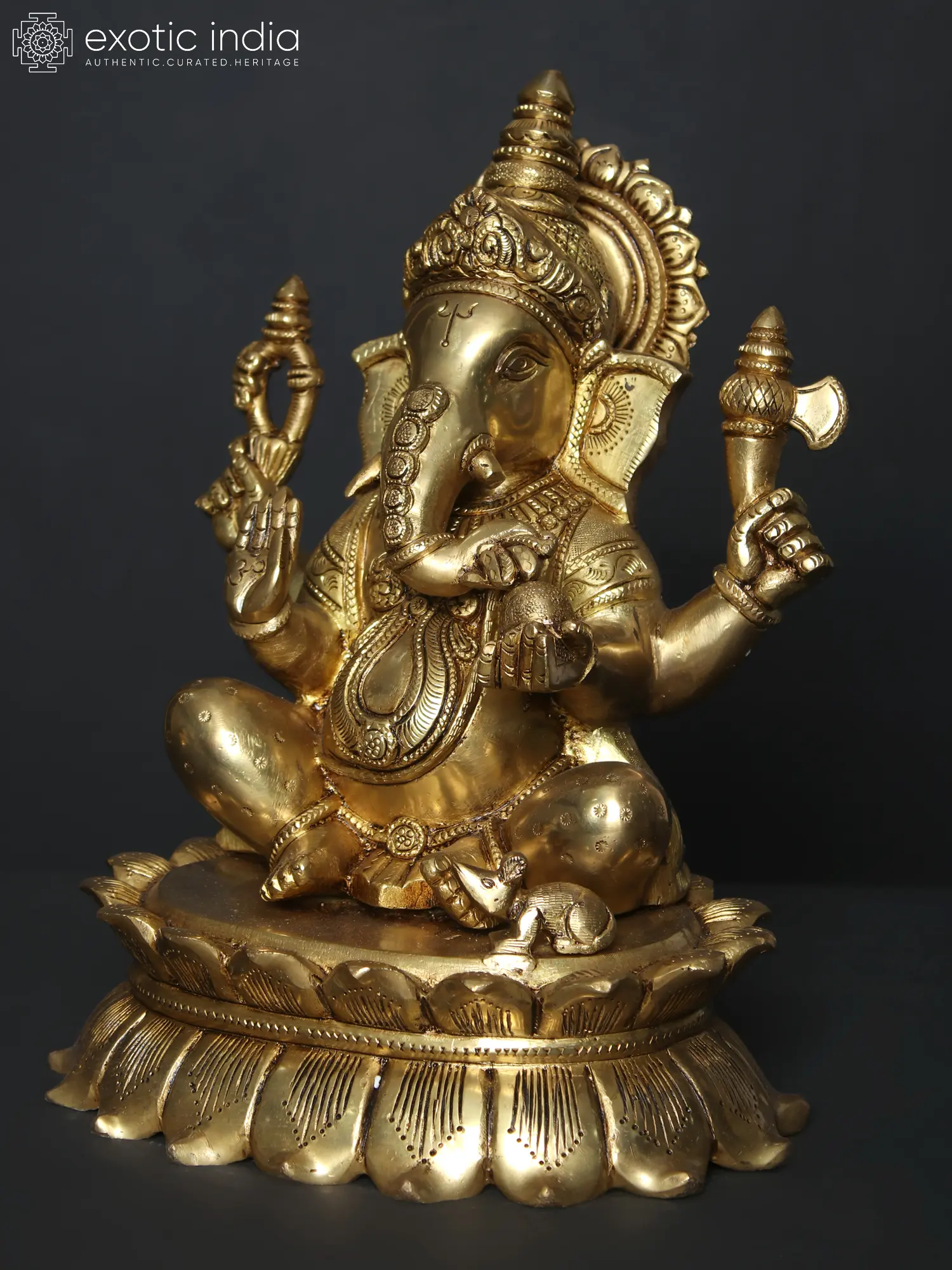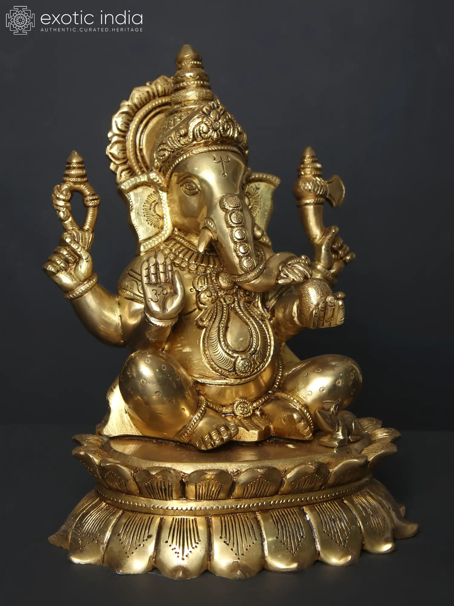 Lord Ganapati, seated on a lotus pedestal, symbolizes purity, enlightenment, and divine grace. The lotus, emerging unsullied from murky waters, represents a spiritual awakening amidst worldly challenges. In this brass statue, the golden hue of Lord Ganesha signifies auspiciousness and prosperity, portraying him as the harbinger of blessings. Holding the Ankush (Goad) and Pasha (Noose) in his upper hands, he guides devotees towards righteousness and liberates them from worldly attachments.