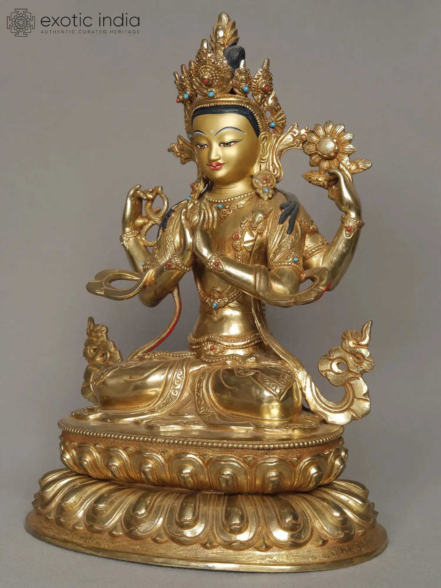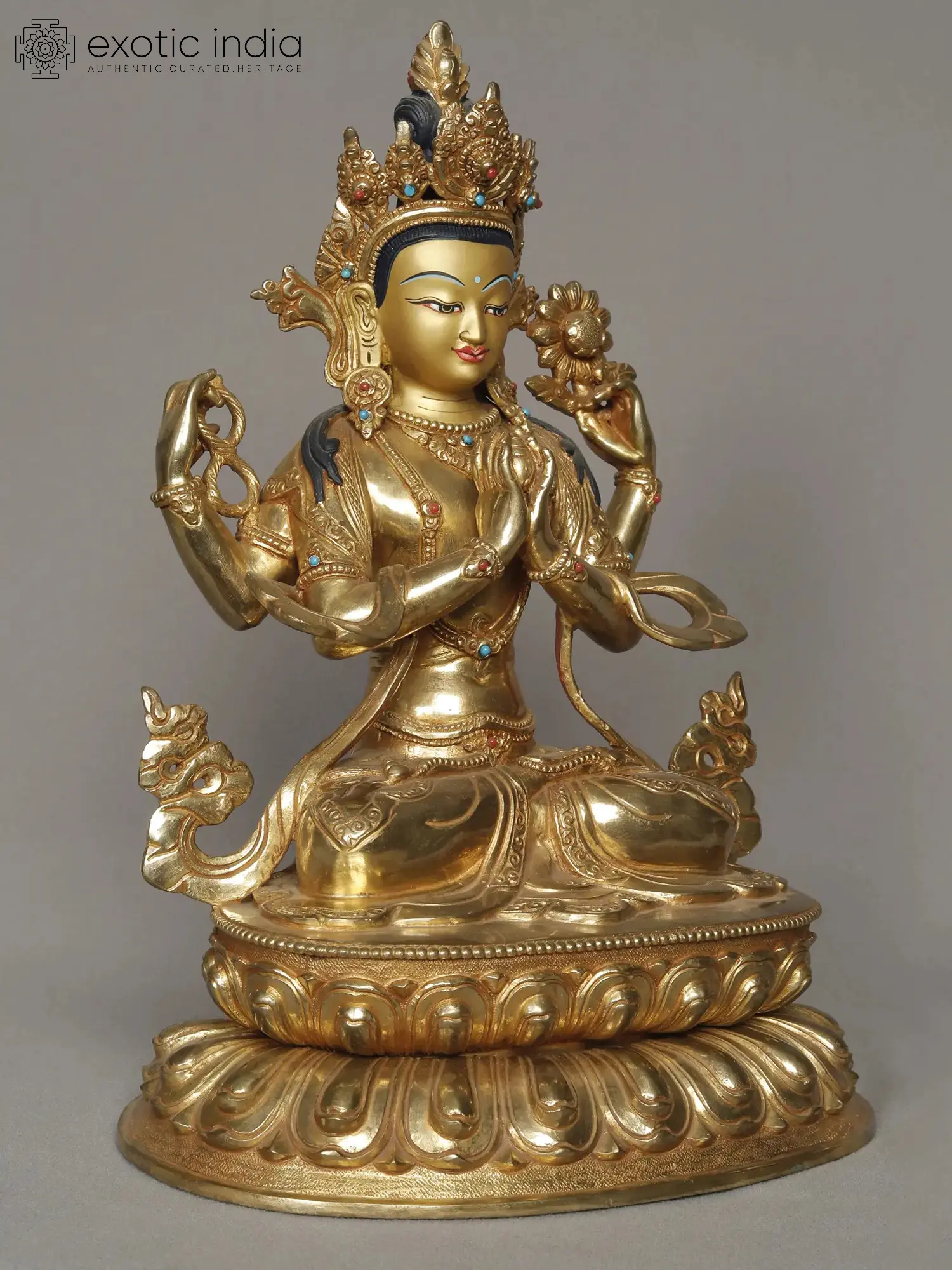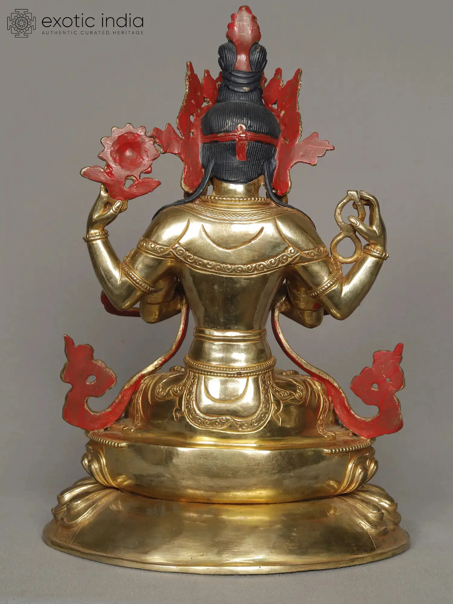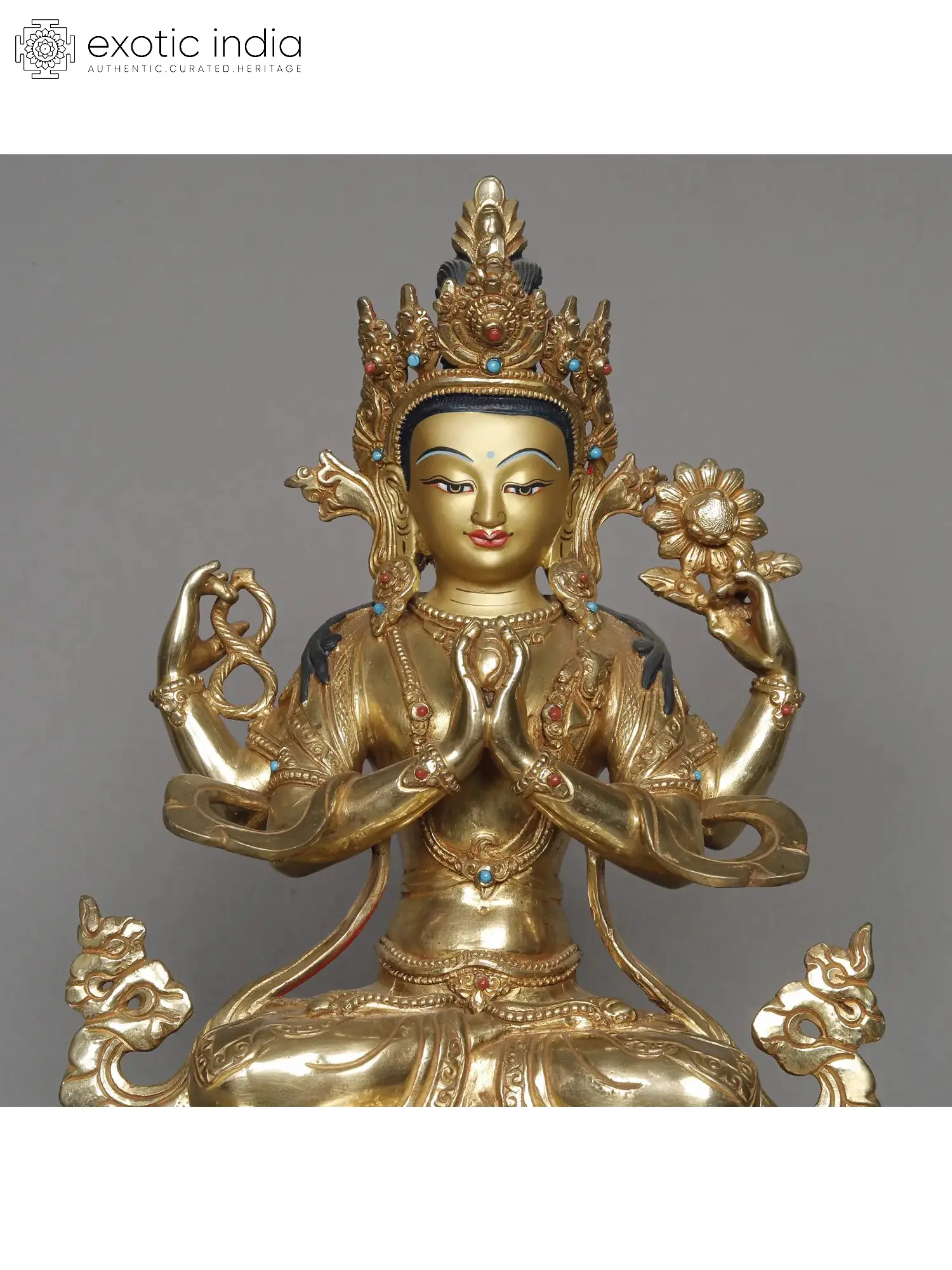 Chenrezig is one of the emanations of Avalokiteshvara, a prominent figure in Tibetan Buddhism, and reveres as a bodhisattva of compassion. “Chenrezig” translates to “the one who looks with unwavering eyes,” signifying a compassionate gaze upon all sentient beings. As a bodhisattva, Chenrezig has postponed Buddhahood until all beings achieve enlightenment. He is depicted with four arms.