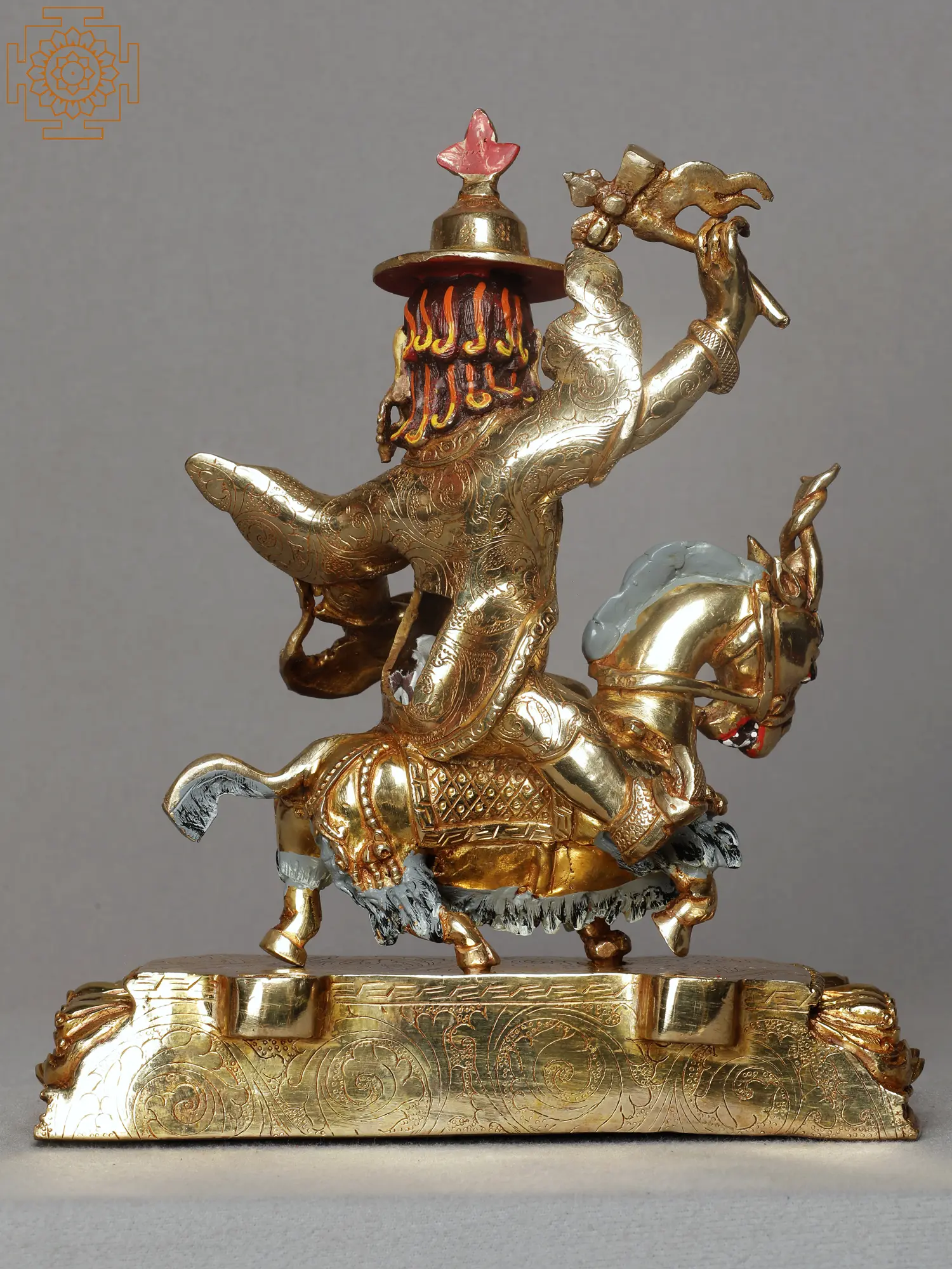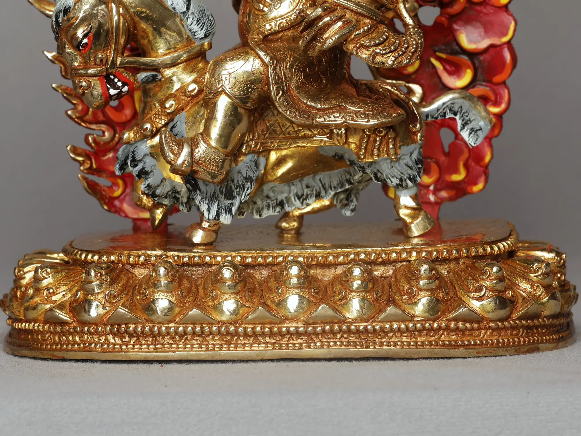 Crafted from copper and meticulously gilded with gold, this statue is a testament to the rich artistic traditions of Nepal. The choice of materials signifies purity and auspiciousness, with copper being a traditional metal for sacred objects and gold representing enlightenment and supreme value. The dynamic pose of Dharmaraja, astride his powerful steed, conveys immense energy and unstoppable momentum. His posture is one of action, of dominion over the forces that bind and impede spiritual progress. The fiery aureole that surrounds him is a potent symbol of wisdom's purifying heat, burning away ignorance and delusion. The intricate detailing on the deity's armor, adornments, and his fearsome expression, with its bared fangs and piercing gaze, are all deliberate elements designed to convey his unyielding strength and his role as a protector of the sacred teachings. The horse, another significant element, often symbolizes the swiftness with which the deity traverses the spiritual realms or the rapid dispelling of obstacles. Its energetic stance and wild mane further amplify the sense of power and movement within the composition. The overall aesthetic is one of vibrant intensity, designed to evoke a visceral response and to serve as a focal point for meditation and devotion, encouraging practitioners to confront and overcome their own internal and external challenges with the same resolute spirit as Dharmaraja. This statue is more than an object of beauty; it is a powerful spiritual tool, imbued with the essence of protection and liberation, brought to life by the skilled hands of Nepalese artisans.