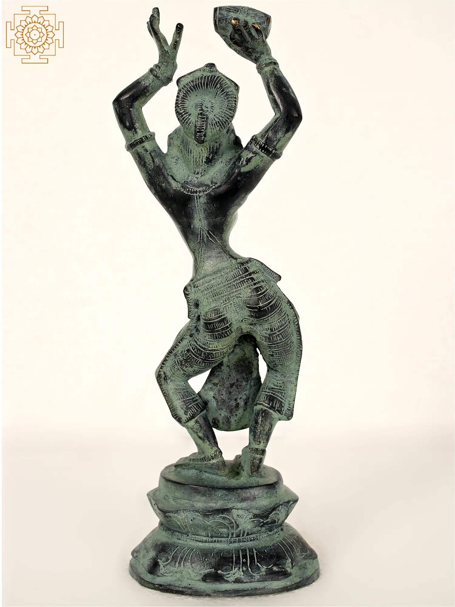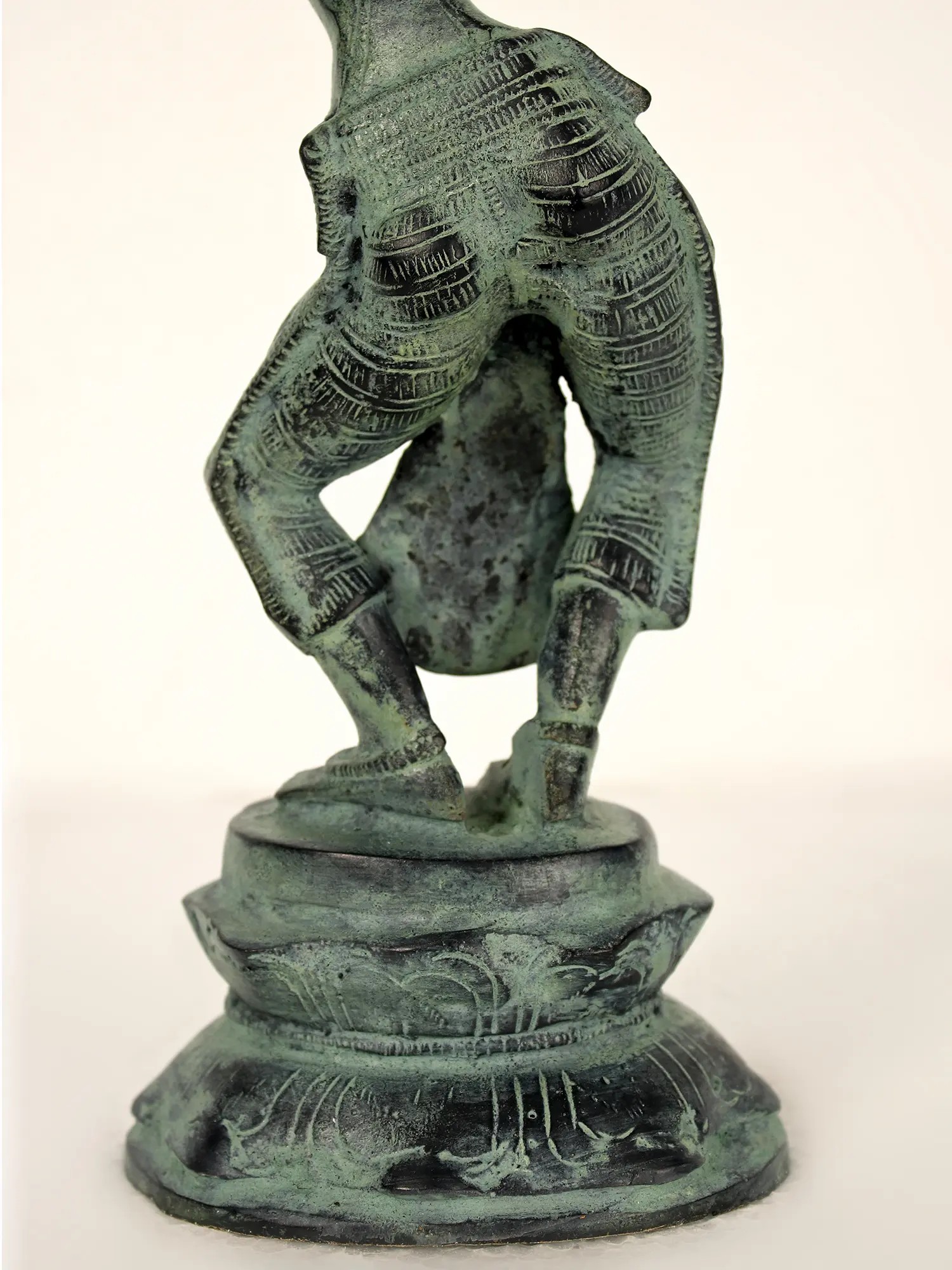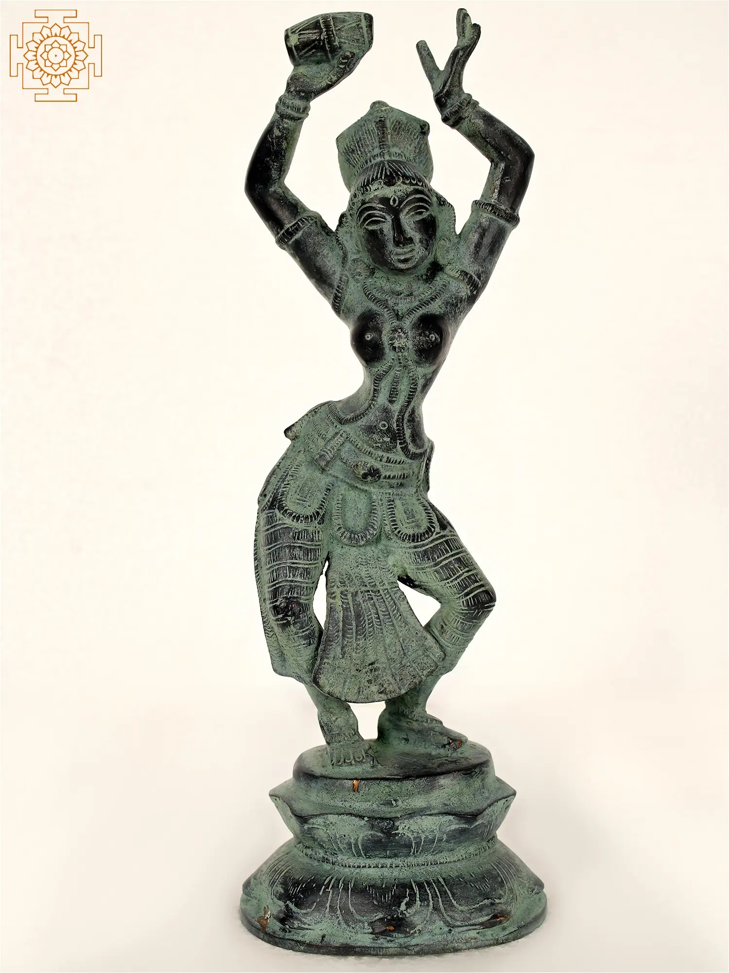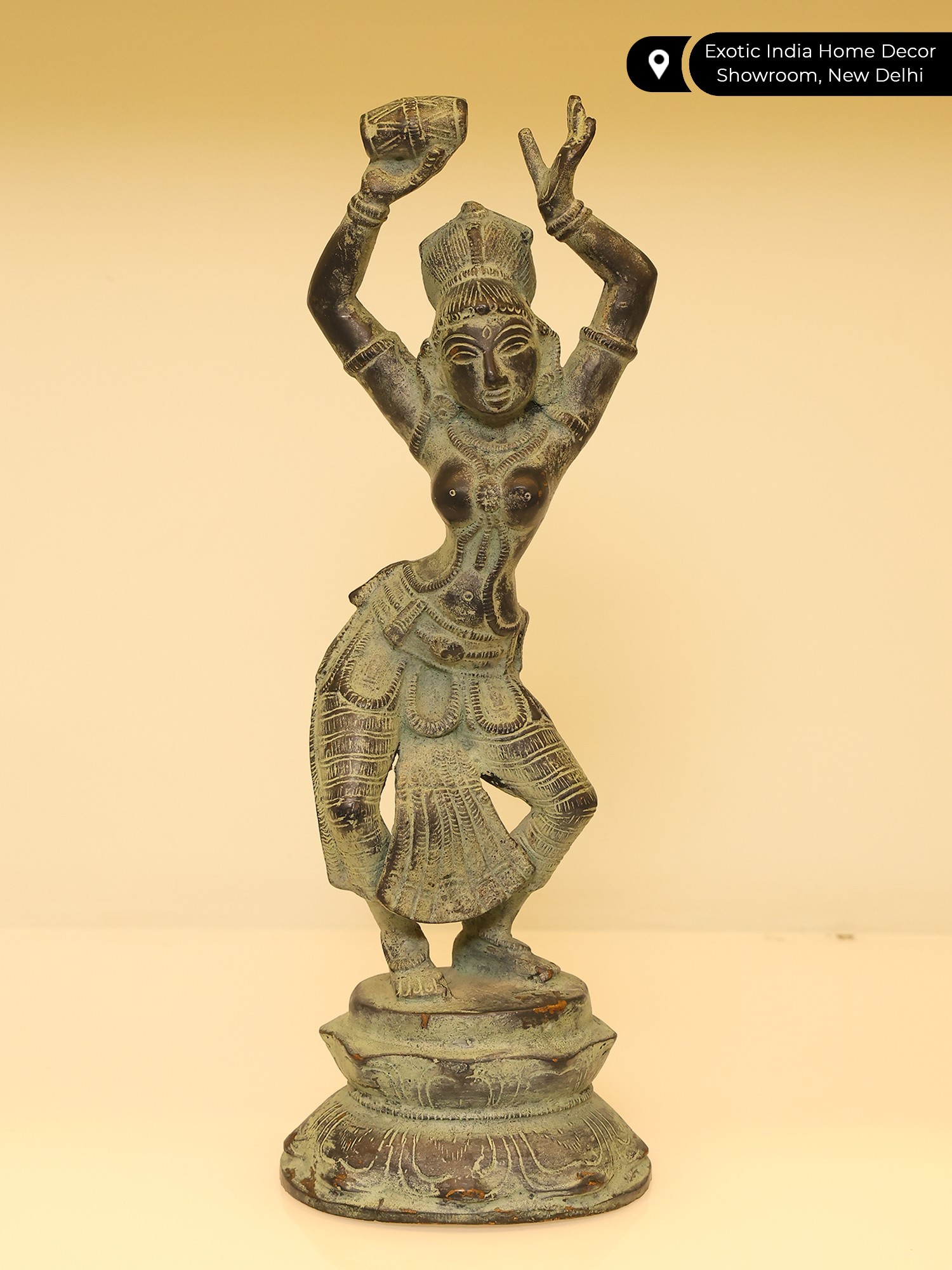 The choice of brass as the medium for this sculpture is deeply significant. Brass, an alloy of copper and zinc, has been used for centuries in India for creating both functional and artistic objects, often associated with divinity and sacred rituals. The green patina that graces this piece adds a layer of authenticity and a sense of antiquity, suggesting it has weathered time, much like the ancient temples and artifacts from which it draws inspiration. The skilled artisans have employed traditional casting techniques to bring this dynamic form to life, ensuring that every curve, every fold of fabric, and every facial nuance is rendered with precision and soul. This statue is not just an object but a tangible connection to a heritage of masterful craftsmanship, a piece that can inspire awe and contemplation in any space it occupies.