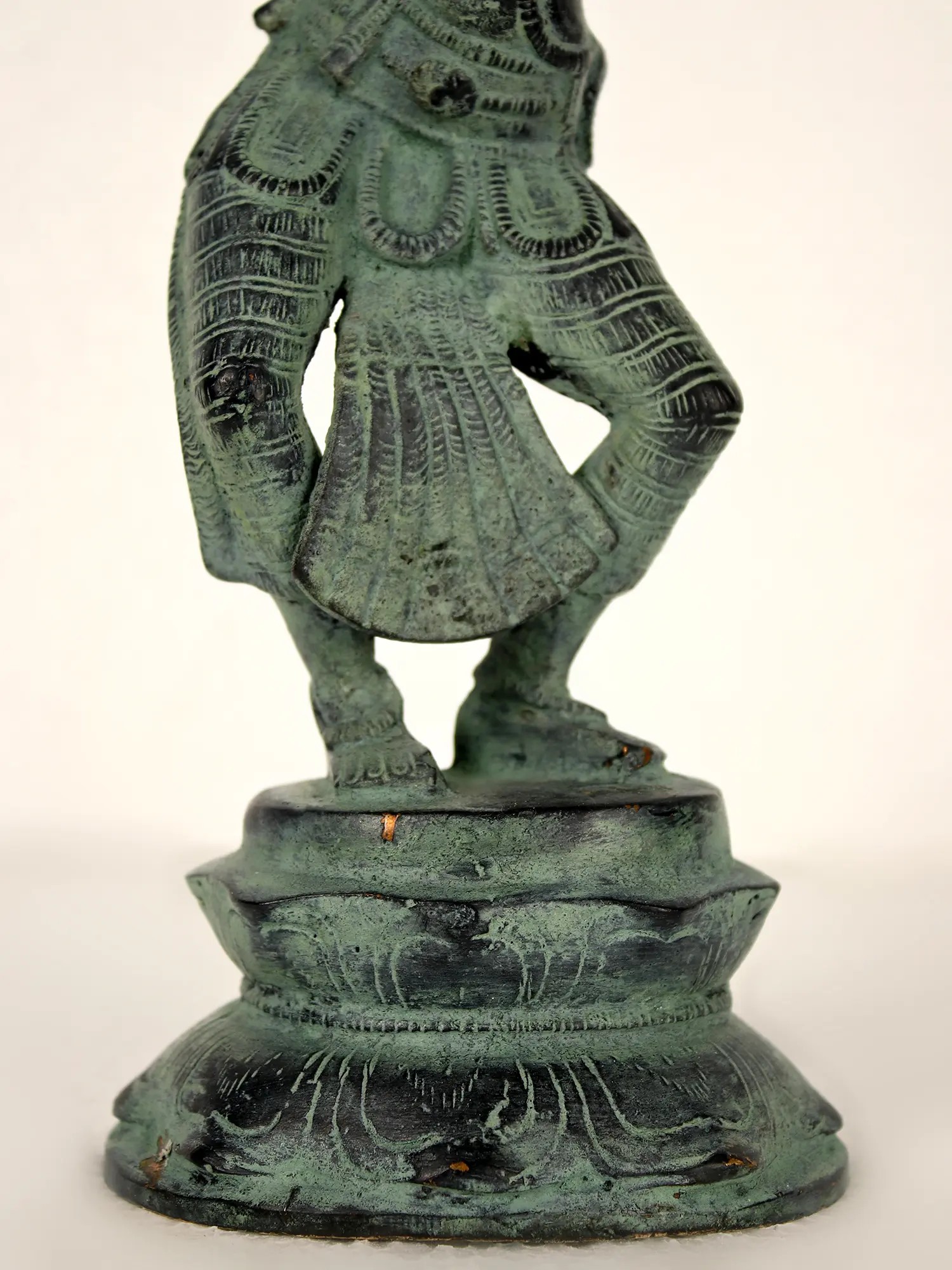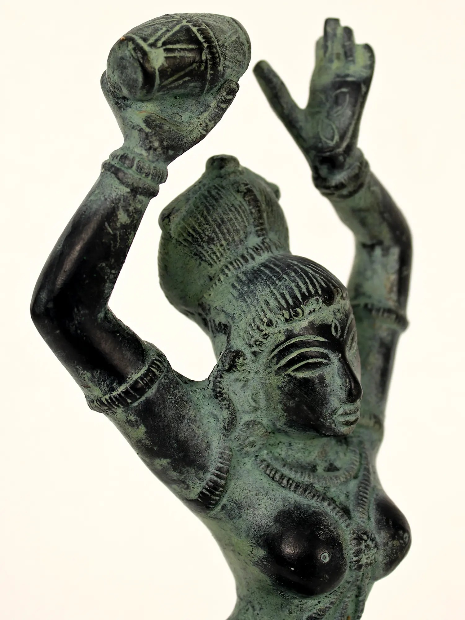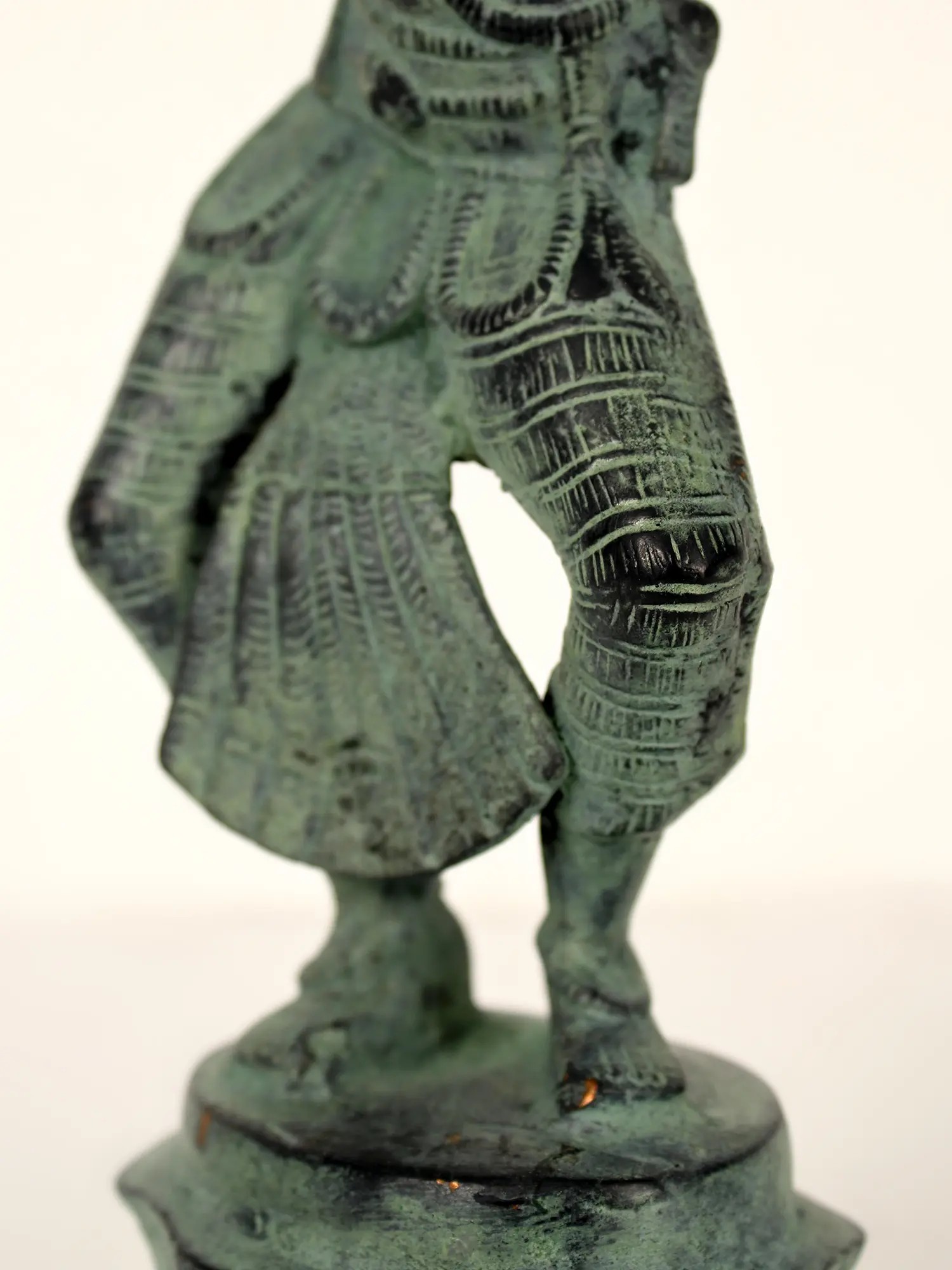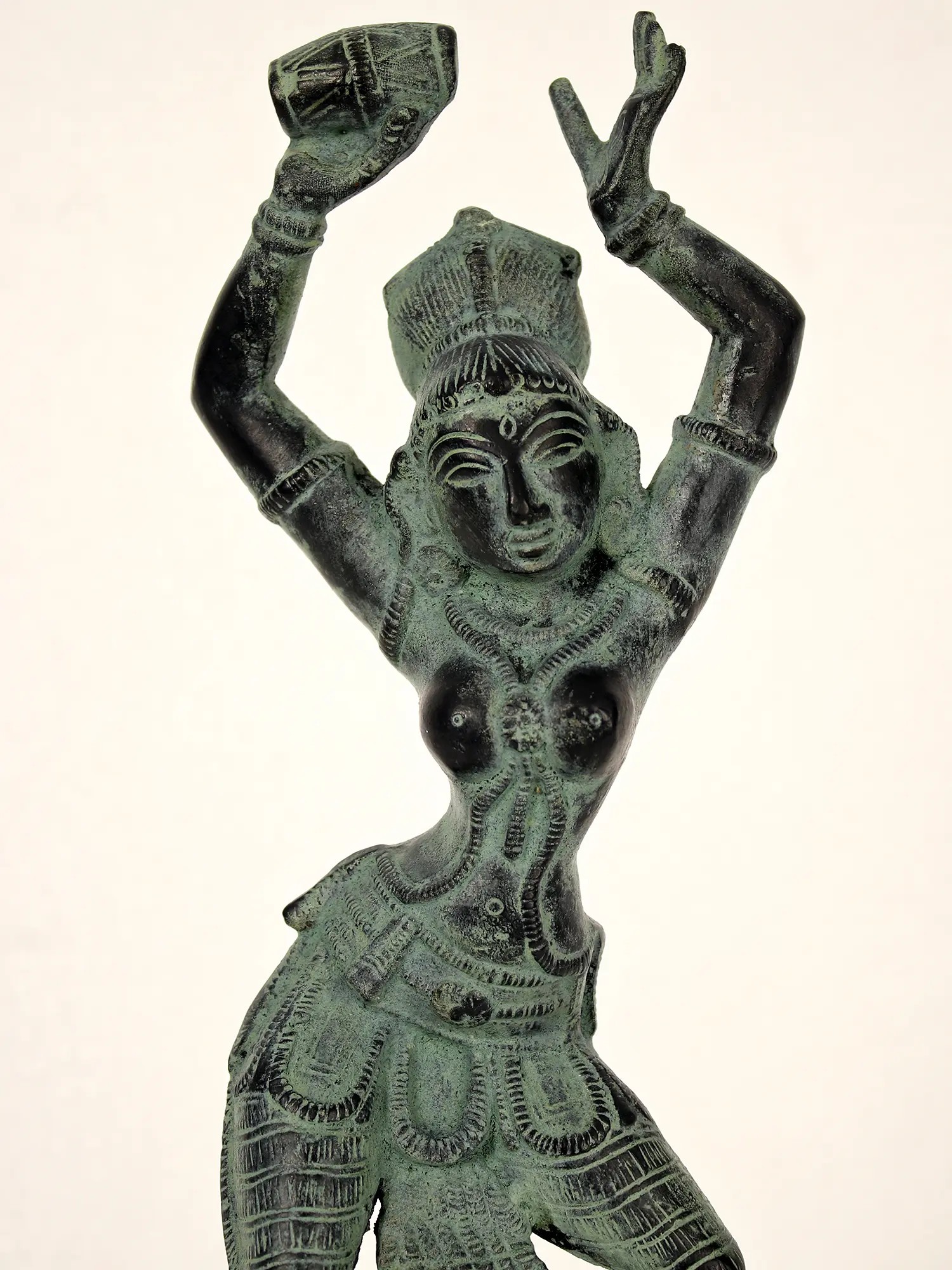 The choice of brass as the medium for this sculpture is deeply significant. Brass, an alloy of copper and zinc, has been used for centuries in India for creating both functional and artistic objects, often associated with divinity and sacred rituals. The green patina that graces this piece adds a layer of authenticity and a sense of antiquity, suggesting it has weathered time, much like the ancient temples and artifacts from which it draws inspiration. The skilled artisans have employed traditional casting techniques to bring this dynamic form to life, ensuring that every curve, every fold of fabric, and every facial nuance is rendered with precision and soul. This statue is not just an object but a tangible connection to a heritage of masterful craftsmanship, a piece that can inspire awe and contemplation in any space it occupies.