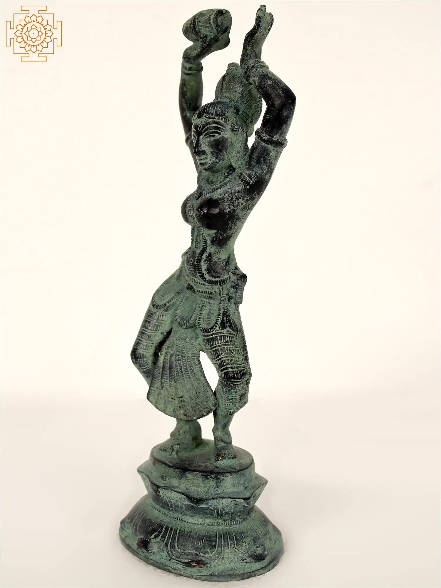 Step into the ethereal realm of divine artistry with this exquisite brass statue, capturing the essence of an Apsara in mid-dance. Crafted with meticulous detail and imbued with the patina of ages, this piece transcends mere decoration to become a portal to ancient Indian mythology and cultural narratives. The figure, poised on a lotus pedestal, exudes a captivating dynamism. Her arms are raised in a graceful gesture, her body curved in a fluid motion that speaks of timeless elegance and spiritual ecstasy. The intricate ornamentation adorning her, from the delicate bangles on her wrists to the elaborate headdress, reflects the rich artistic traditions of India.
