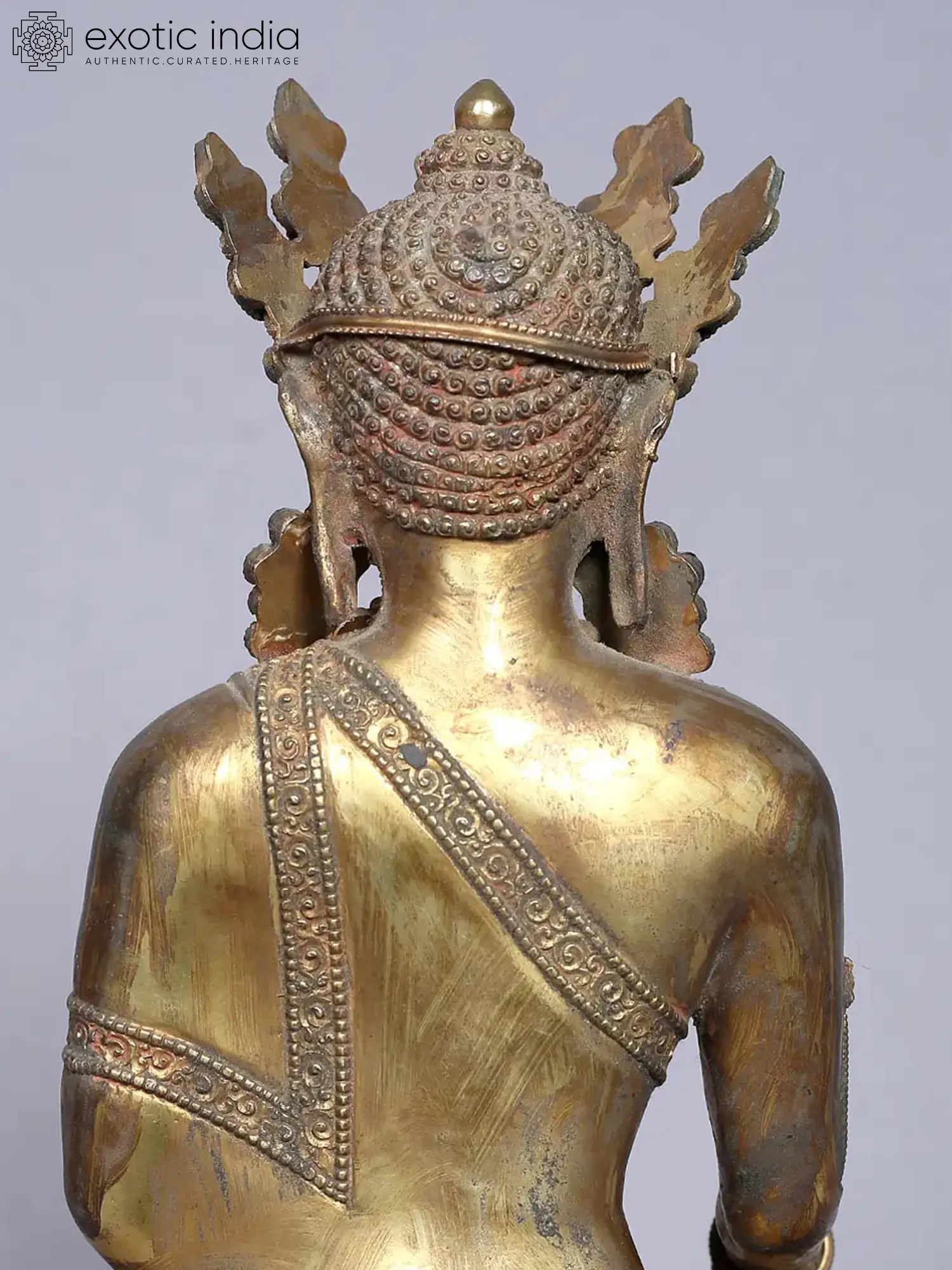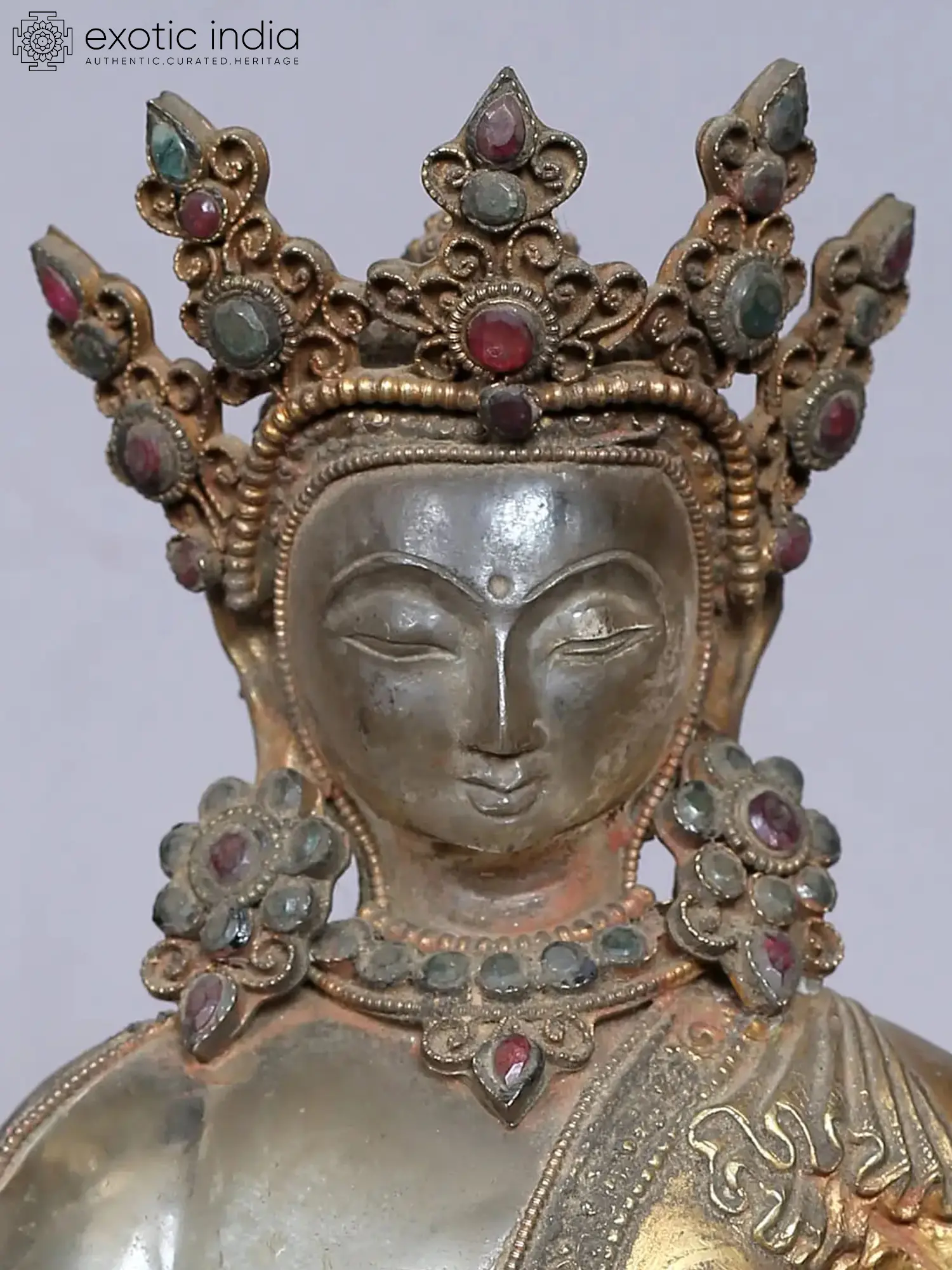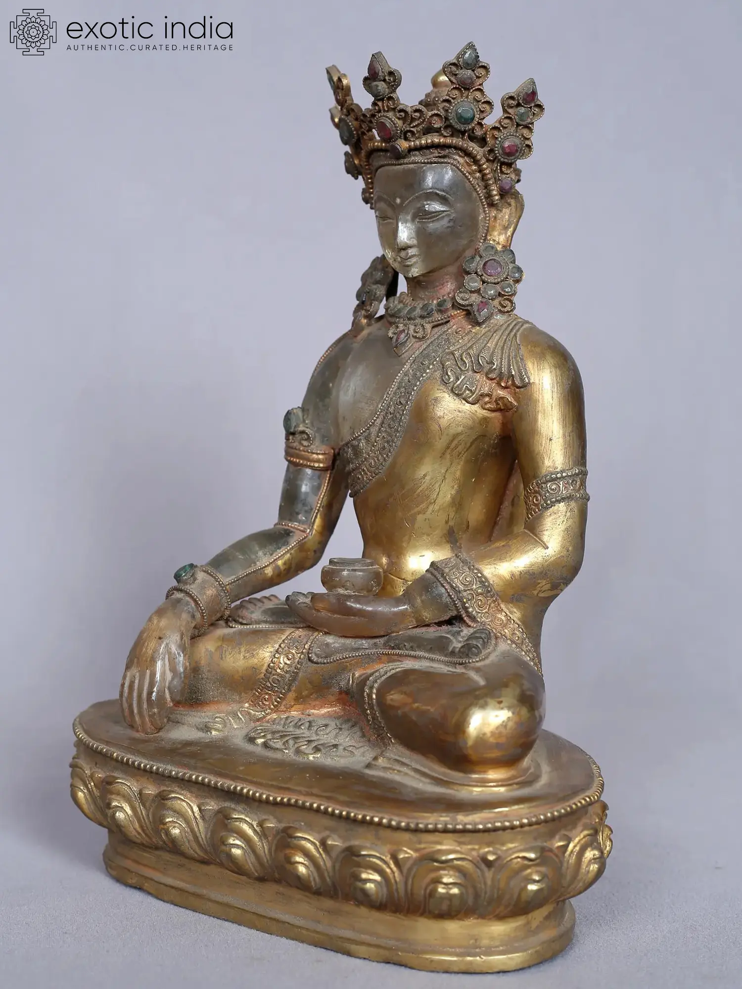 The 11'' Deity Crowned Shakyamuni statue, crafted from crystal and copper, pays homage to the revered Medicine Buddha. Shakyamuni, known as the embodiment of healing and compassion, is depicted in a meditative posture, exuding tranquility and wisdom. The crystal material enhances the statue's radiance, while copper and gold plating adds a touch of elegance. The presence of this statue in a home or sacred space can bring about a sense of inner peace, physical well-being, and spiritual healing. Through the significance of the Medicine Buddha, this artwork serves as a reminder of the transformative power of compassion and the pursuit of enlightenment.