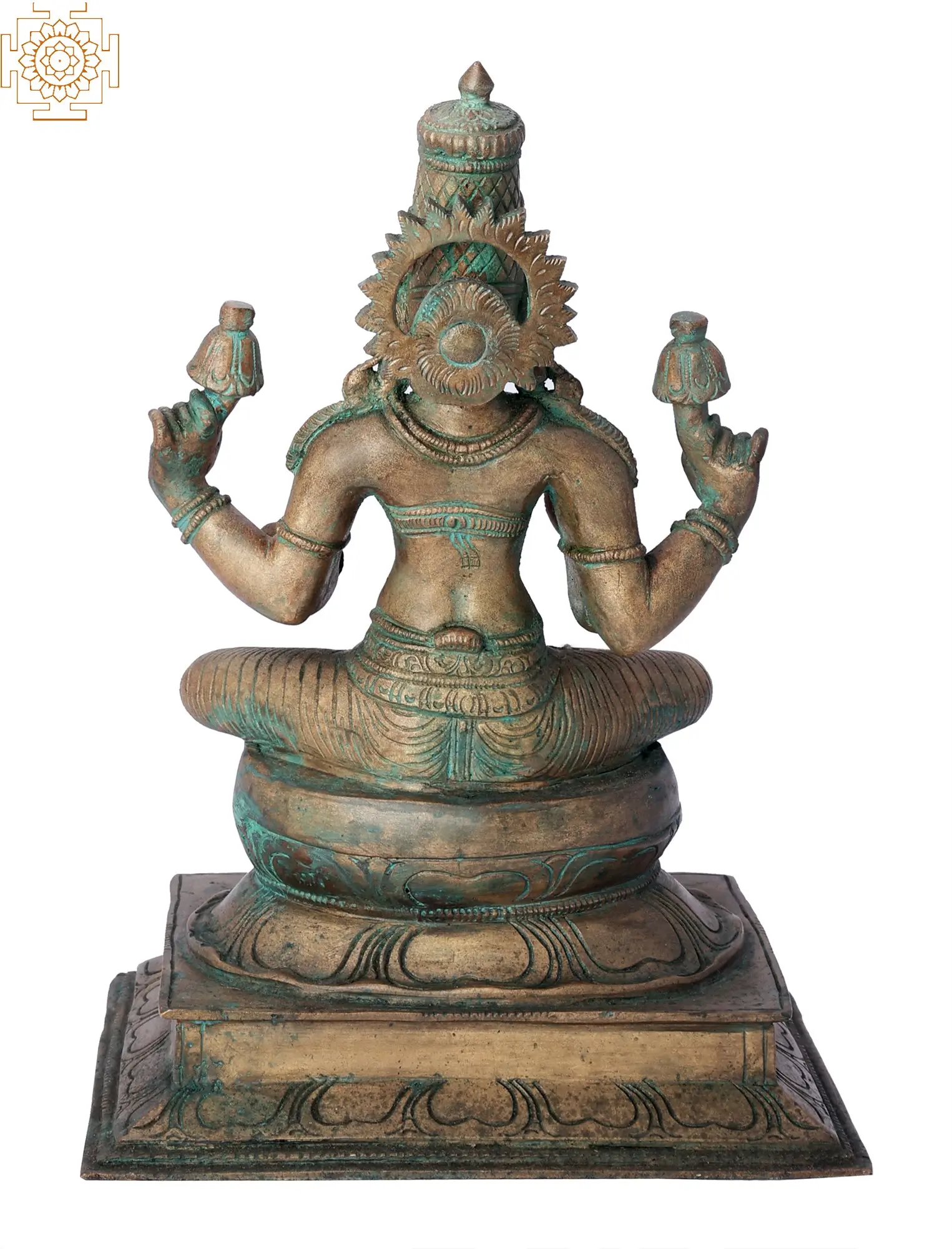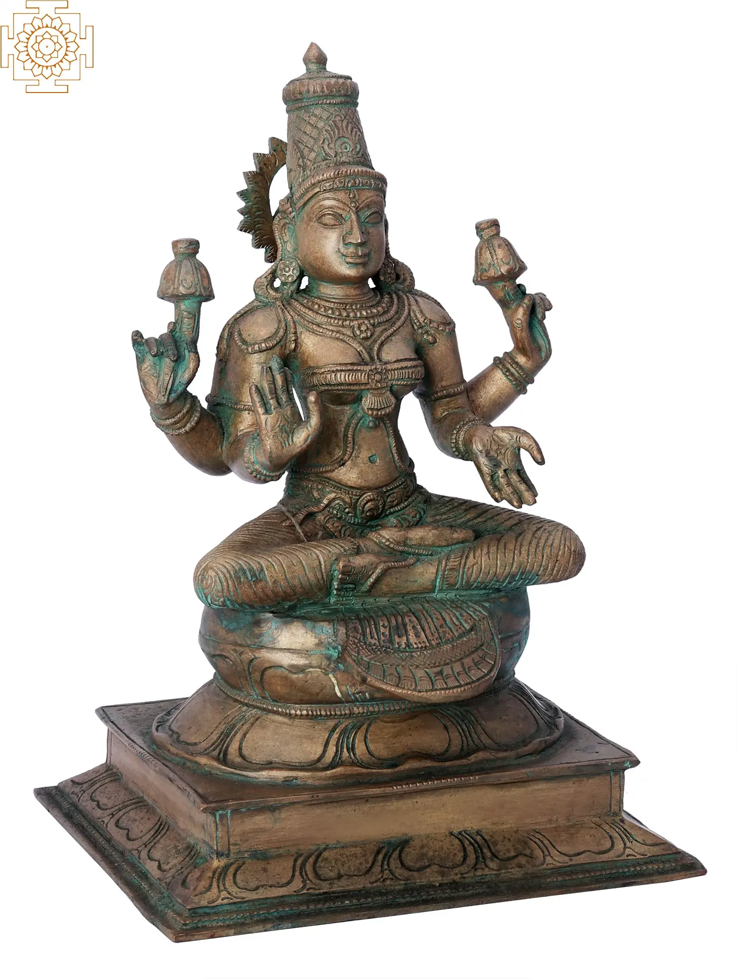 This exquisite bronze sculpture depicts Devi Lakshmi, the revered Hindu goddess of wealth, fortune, and prosperity. Seated in a graceful posture, her divine presence emanates a sense of serenity and abundance. Each detail, from the gentle curve of her lips to the intricate adornments, has been meticulously crafted by skilled artisans. The verdant patina that graces the bronze adds a timeless depth, hinting at the rich heritage and spiritual significance of this sacred form. ——