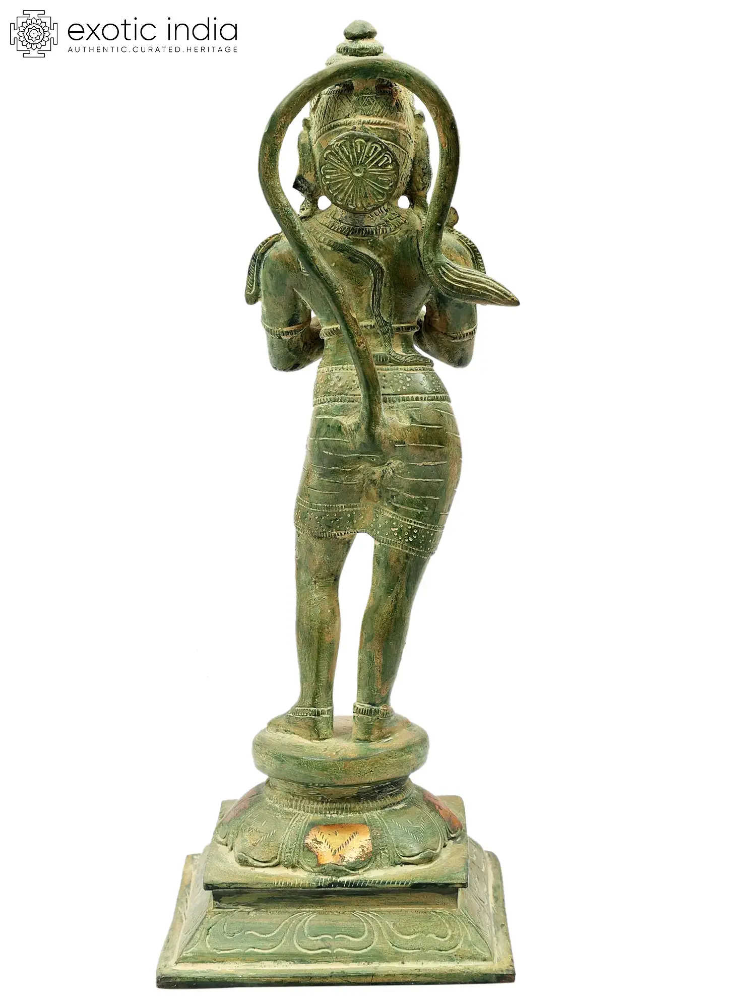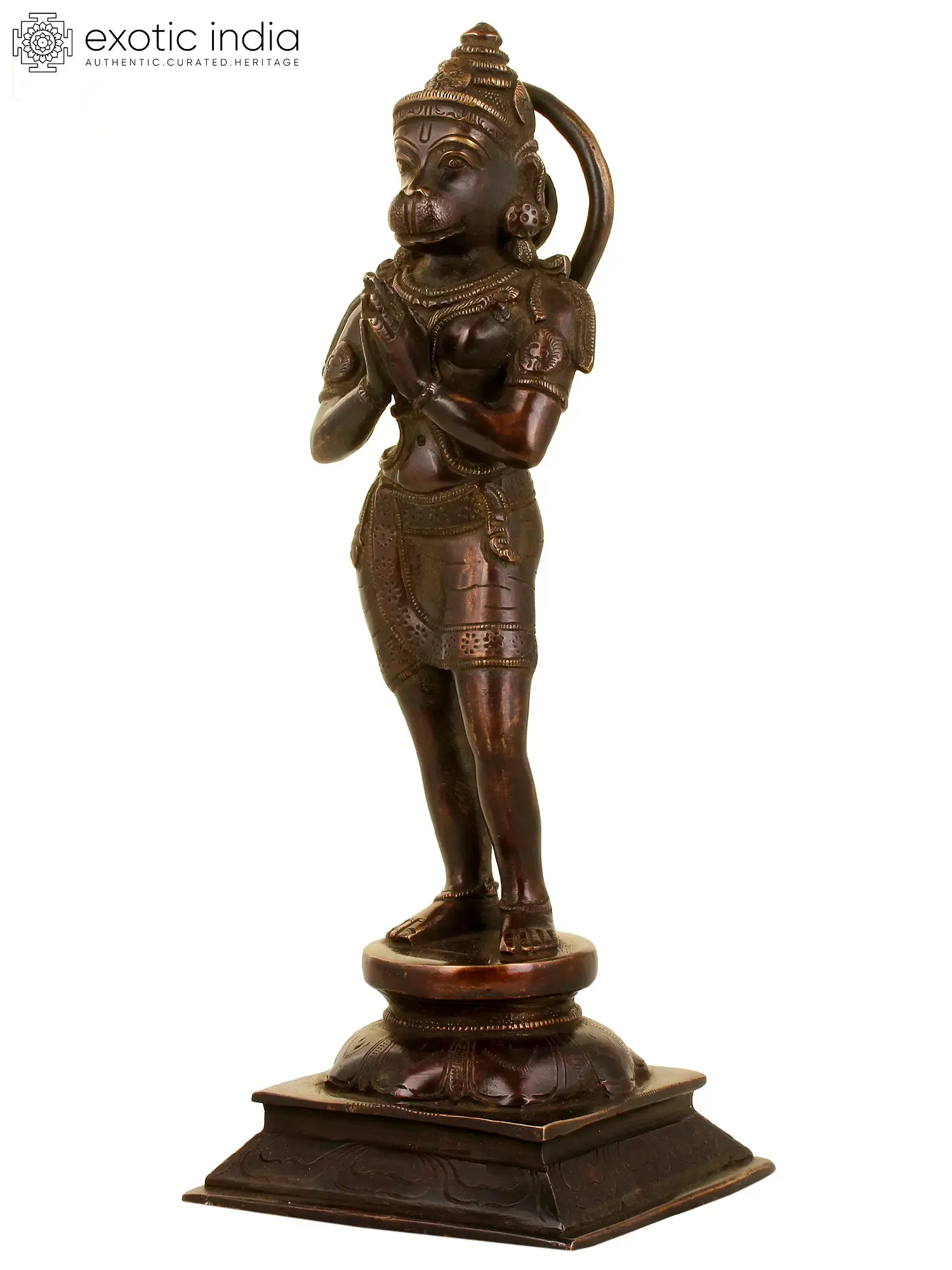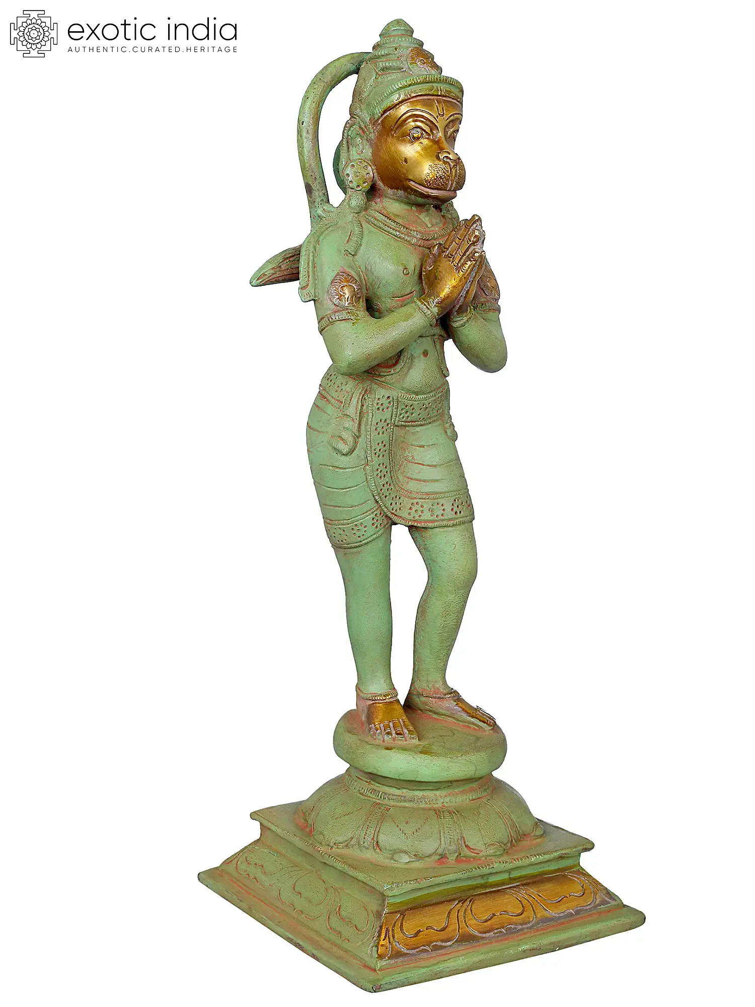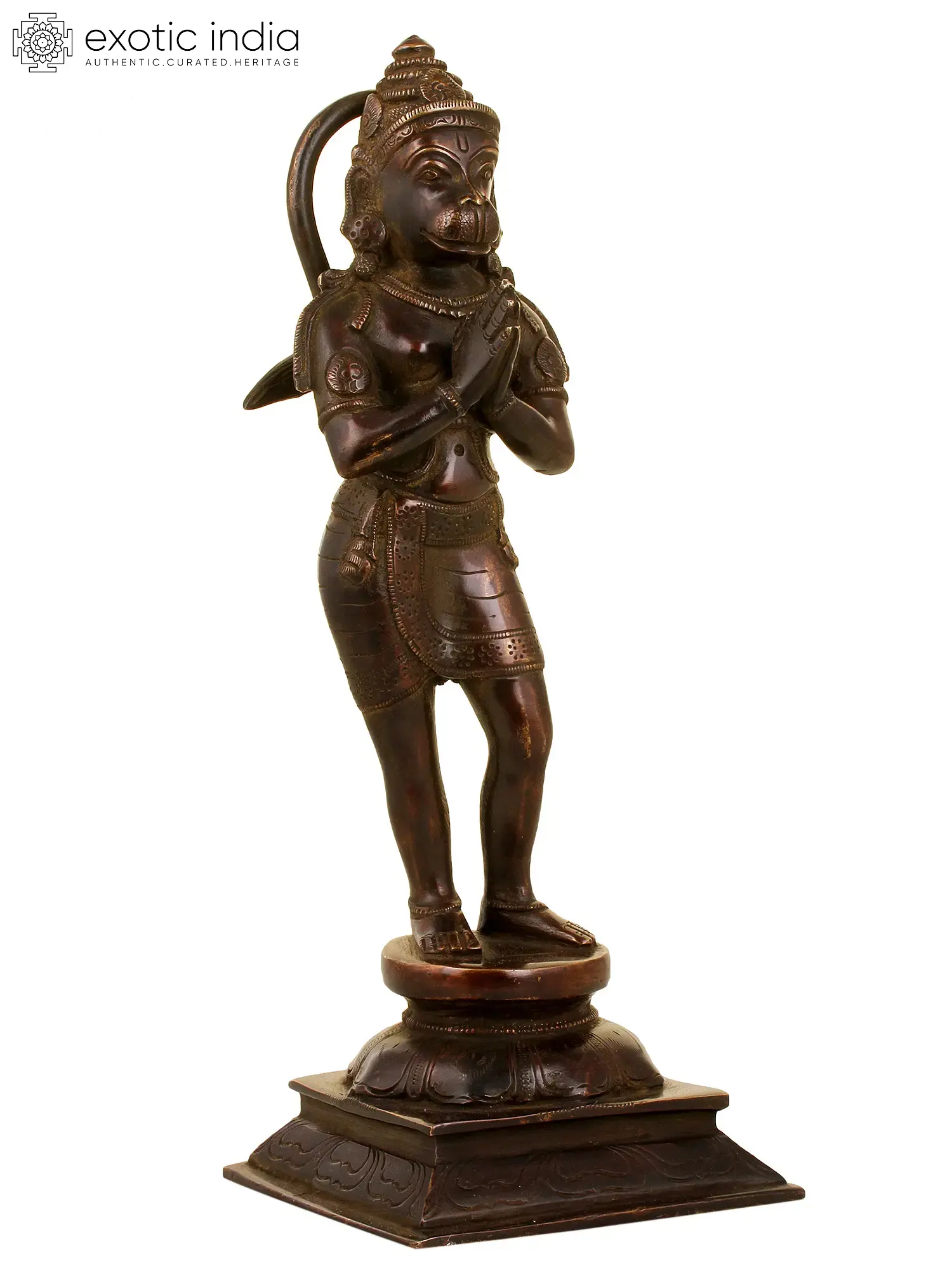 This sculpture captures the devout stance of Hanuman in Anjali mudra, a gesture of respect and devotion. Anjani-Suta Hanuman, the epitome of strength, courage, and unwavering devotion, is beautifully depicted in this brass embodiment of the divine. The sculpture reflects the skill and devotion of Indian artisans. Display it in your home to inspire reverence and devotion, as you pay homage to Lord Hanuman's boundless faith and dedication.
