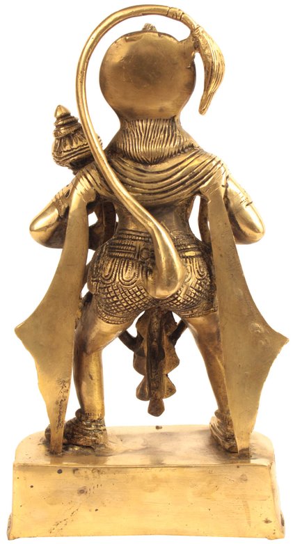Working in brass the sculptor has magnificently carved out this sculpture aptly depicting the innate cosmic strength of Lord Hanuman in unique five tones of blended green and gold, amazing chola giving it an ancient touch, bright combination of copper, silver and gold, lustrous yellow-gold and distinct silver. The facial expressions and structure of his body are etched in a superfine way justifying his brawny appearance and nature.
