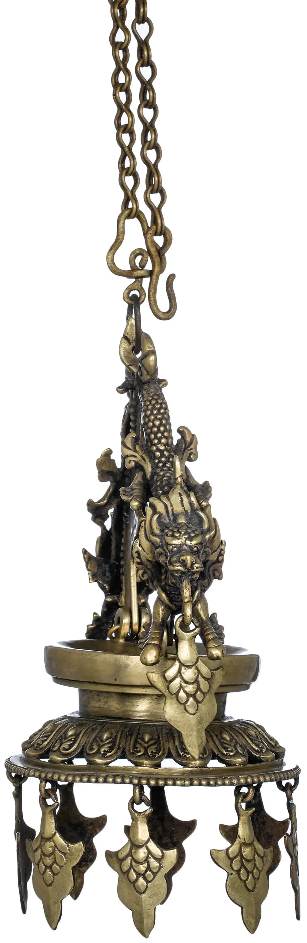The Dragons Roof Hanging Oil Lamp, skillfully made in Nepal and handcrafted in Brass, is a magnificent creation that blends art, culture, and spirituality. The dragon is a symbol of power, protection, and auspiciousness. This roof hanging lamp signifies the illumination of your surroundings, dispelling darkness, and inviting the divine into your home. Hanging this lamp in your space, you not only add a unique and captivating decorative piece but also invite the blessings of protection and good fortune. It's more than just a lamp; it's a guardian of your sacred space.