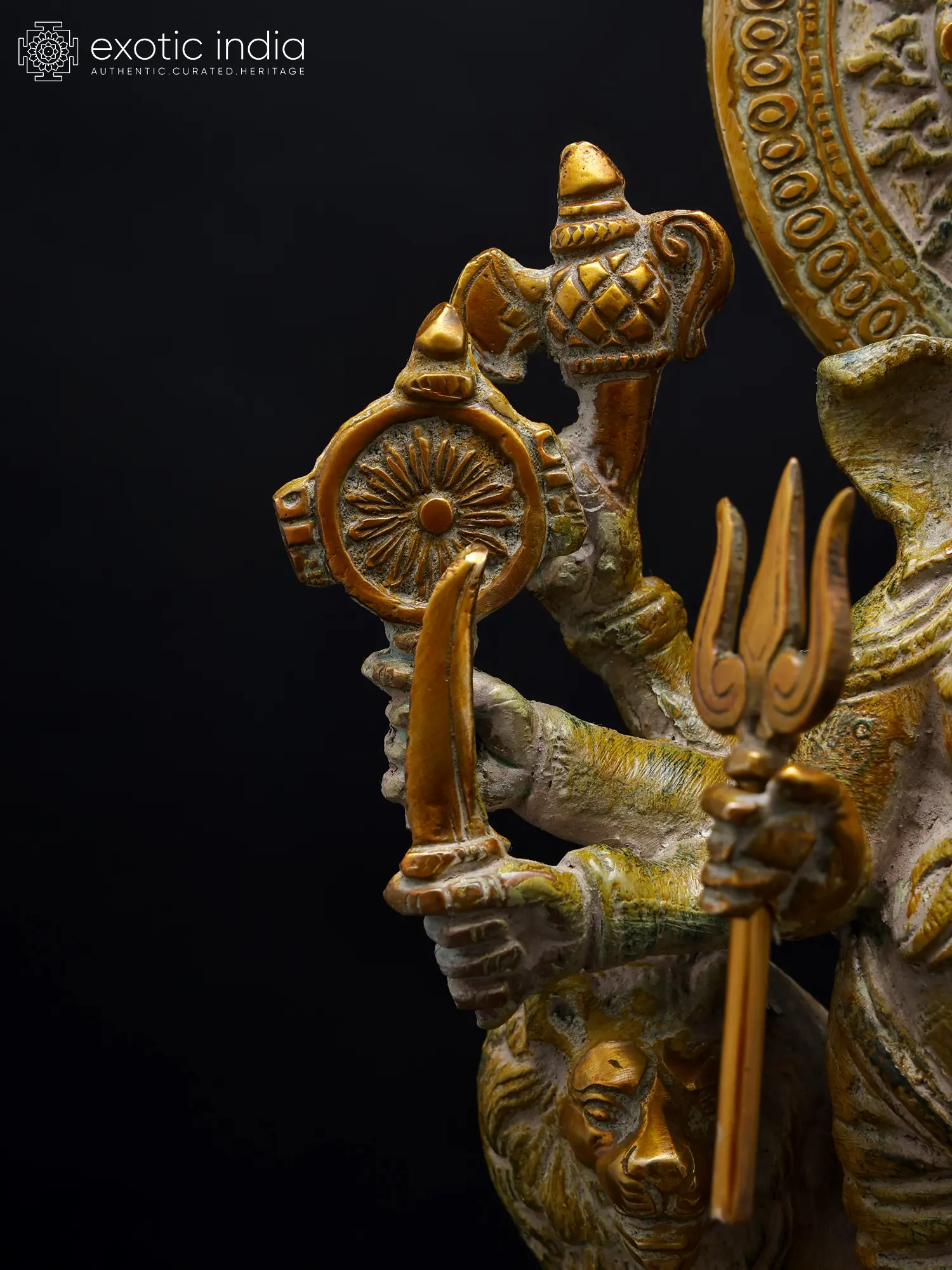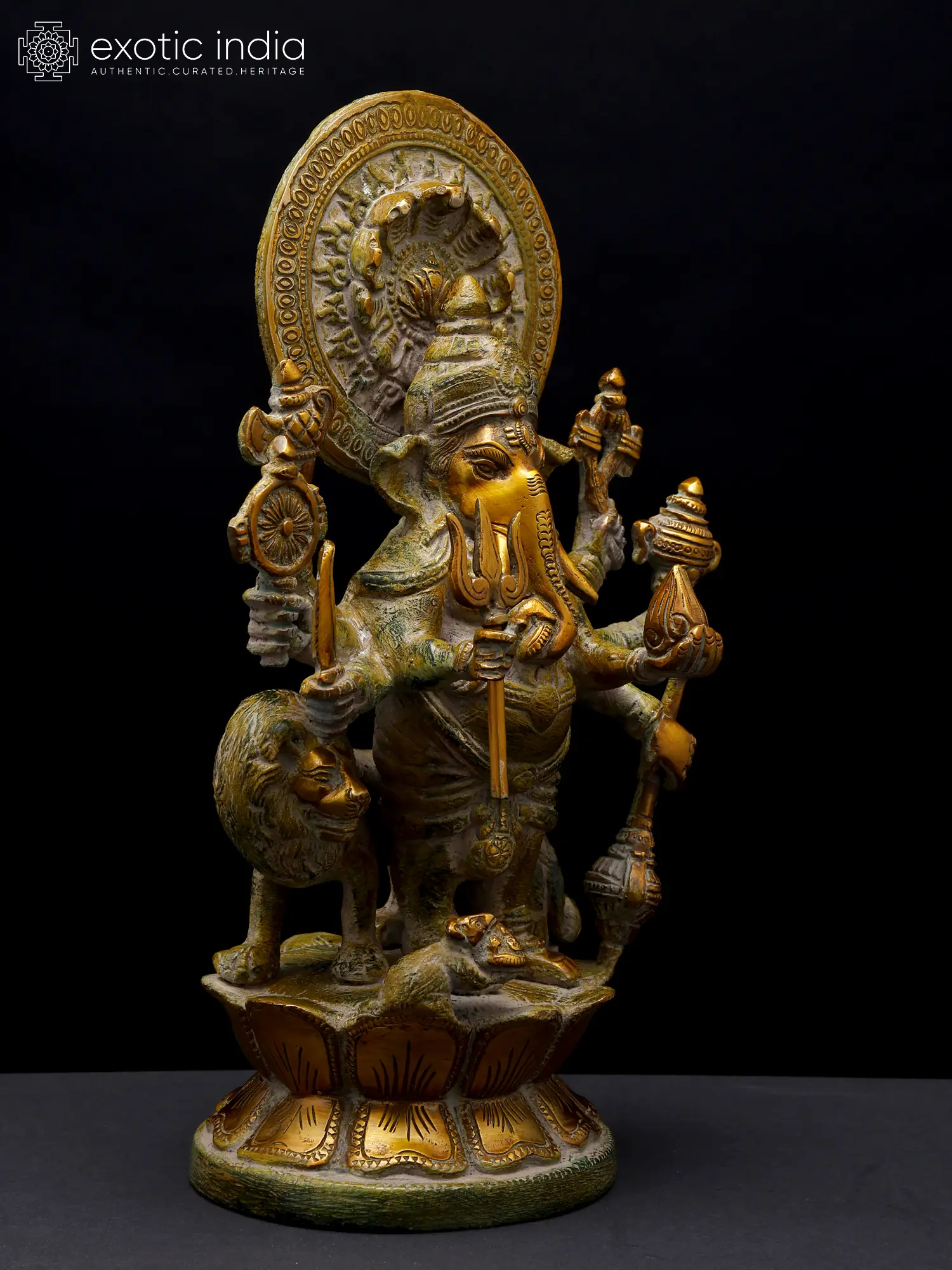Simha Ganapati, the 29th of Ganapati's 32 forms, is the form in which Lord Ganesha mounts a Lion or Simha. Simha Ganapati is shown in this brass statue as the Ashtabhuja Dhari, or the deity with eight hands, holding Parashavadha (the war axe), Trishul (trident), Khadga (the sword), Shankh (Conch), Pasha (noose), Chakra (discus), Modaka Patra (sweets), and Gada (mace). The serpent coiling around his belly represents his control over the cosmos. His Vahana, the Mushak or mouse, waits by his feet with the lion and looks up to him for a kindly glance.
