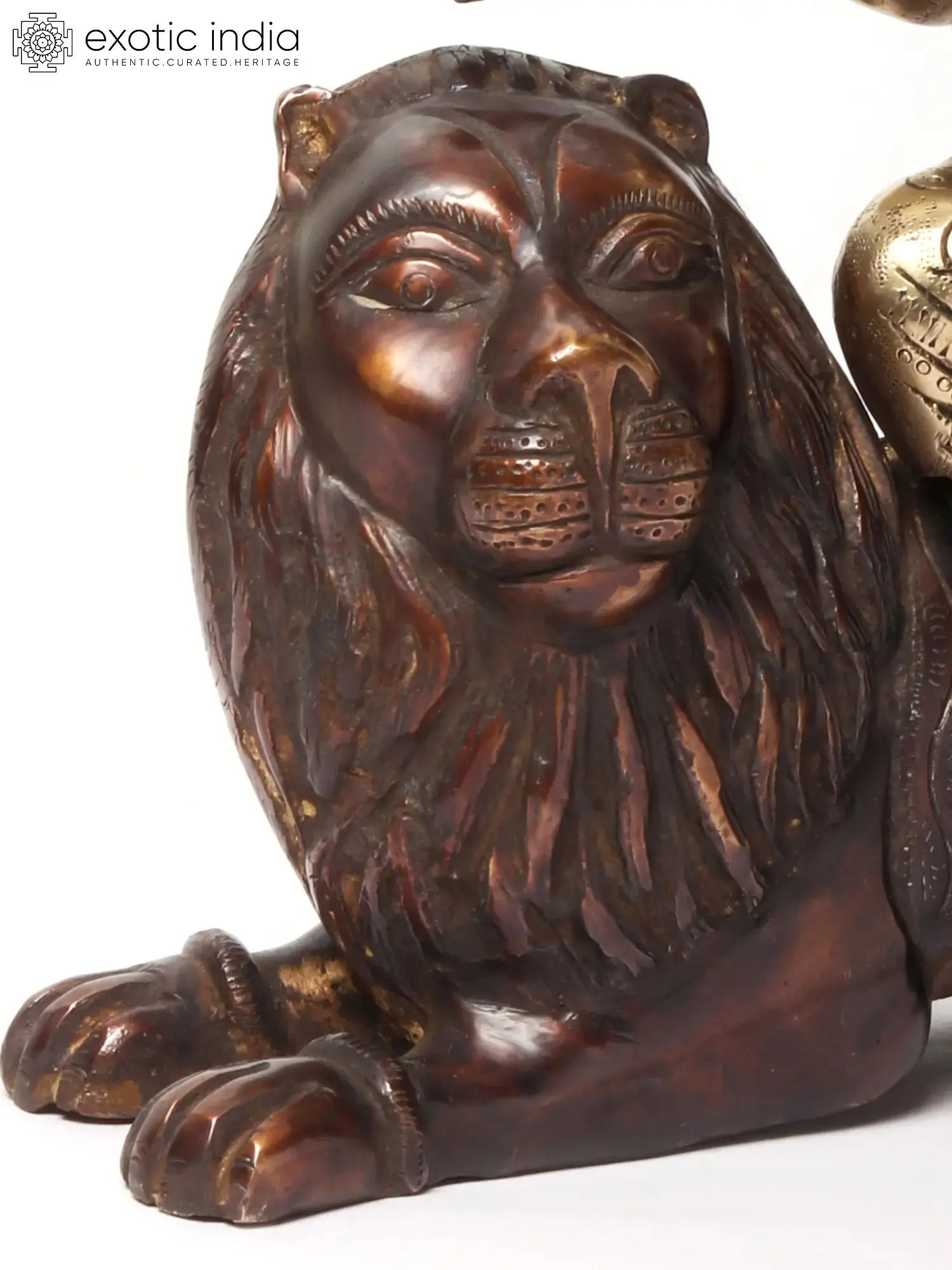 Durga, who cannot be fathomed by any force is the warrior goddess who represents the complete realization of the feminine principle - Shakti. Formed through the powers of all gods combined, it is Devi Durga who came to rescue the heavens from demons when the gods couldn’t. Hewed in golden brass, the mother goddess sits in a Lalitasana over her mount - the fierce Simha/Singha (Lion), holding the weapons of destruction - for protection against malign and injustice.