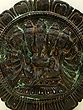 The Five-Headed Ganesha Wall Hanging Plate in Brass is a captivating piece with a green-black patina tint that lends the allure of an antique treasure. Within this unique wall hanging, the figure of Ganesha is gracefully ensconced inside a fully bloomed flower structure, radiating artistic and spiritual significance. Each of Ganesha's five heads symbolizes the five koshas, representing the subtler layers of the human experience: Annamaya kosha (the physical body), Pranamaya kosha (the energy body), Manomayakosha (the mental body), Vighnnamayakosha (the body of Upper Consciousness), and Anandamayakosha (the body of Cosmic Blessings). This profound artwork harmoniously intertwines aesthetics and spiritual symbolism.