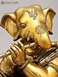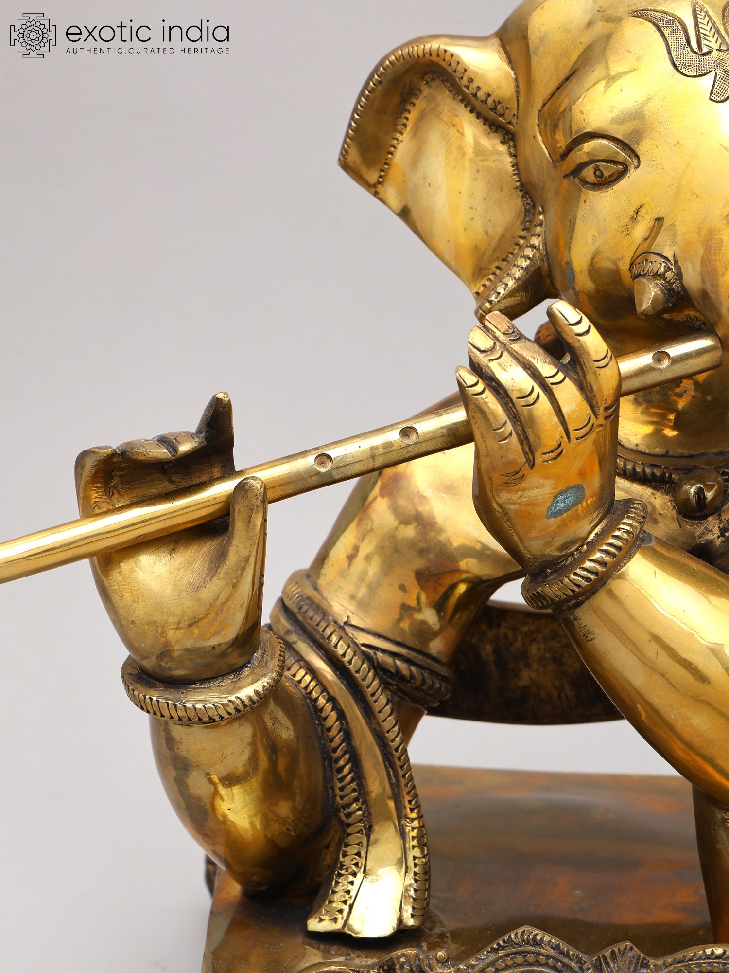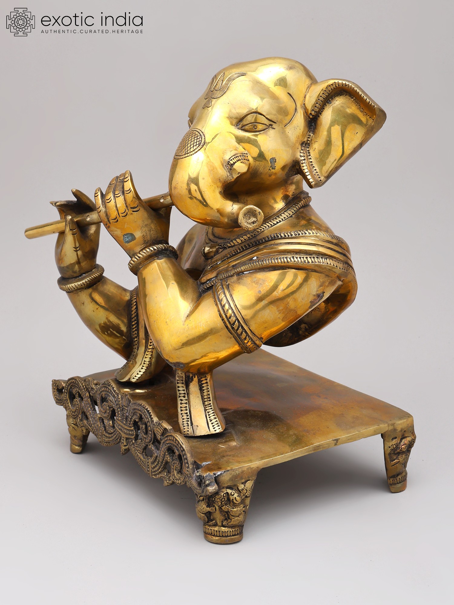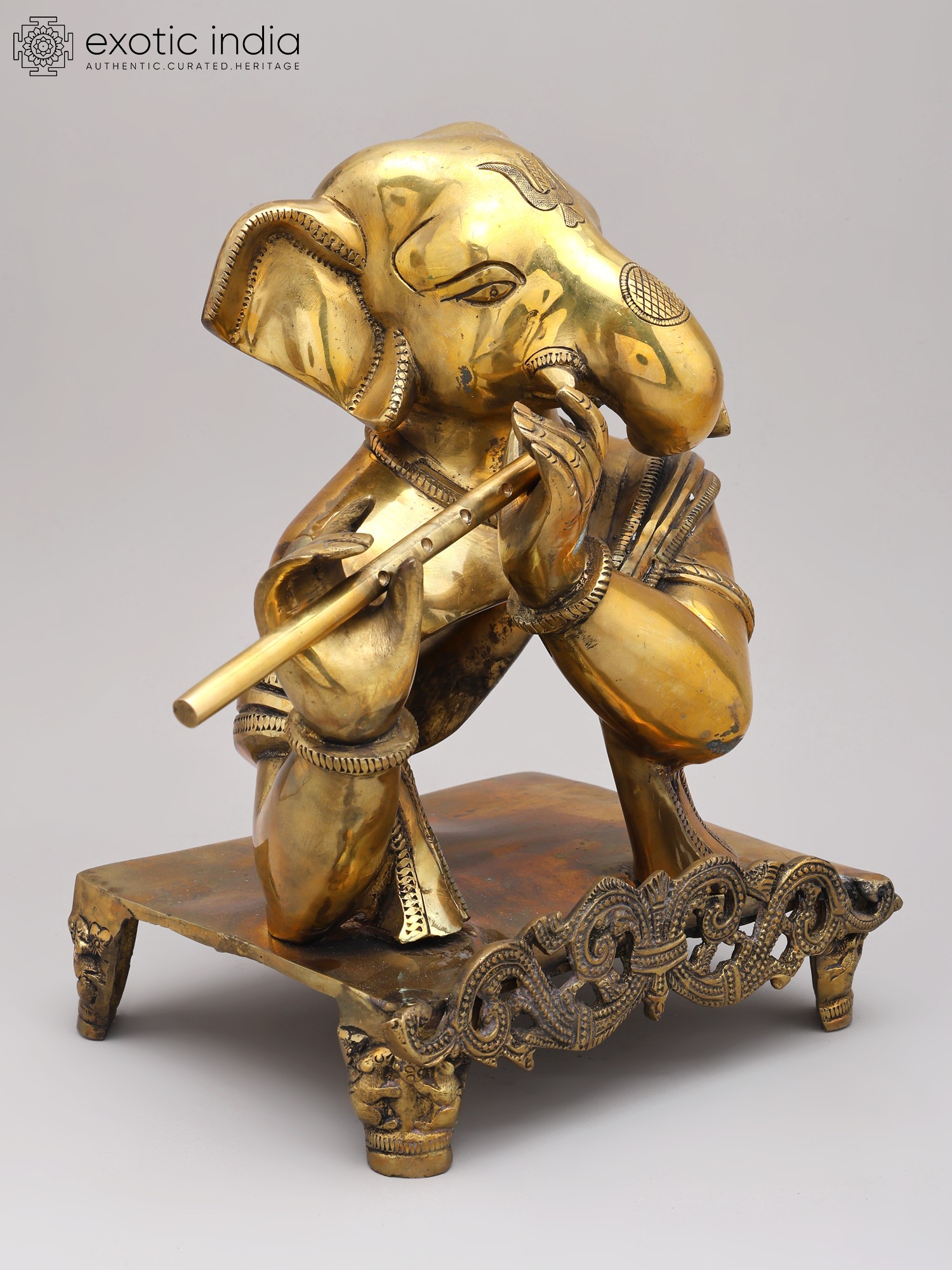 The innocent and untroubled persona of Ganesha plays the flute softly to spread calmness and serenity in the world; depicted with face and hand that rests on a square low heighted chowki with carved legs and an ethnic wavy pattern in the front.