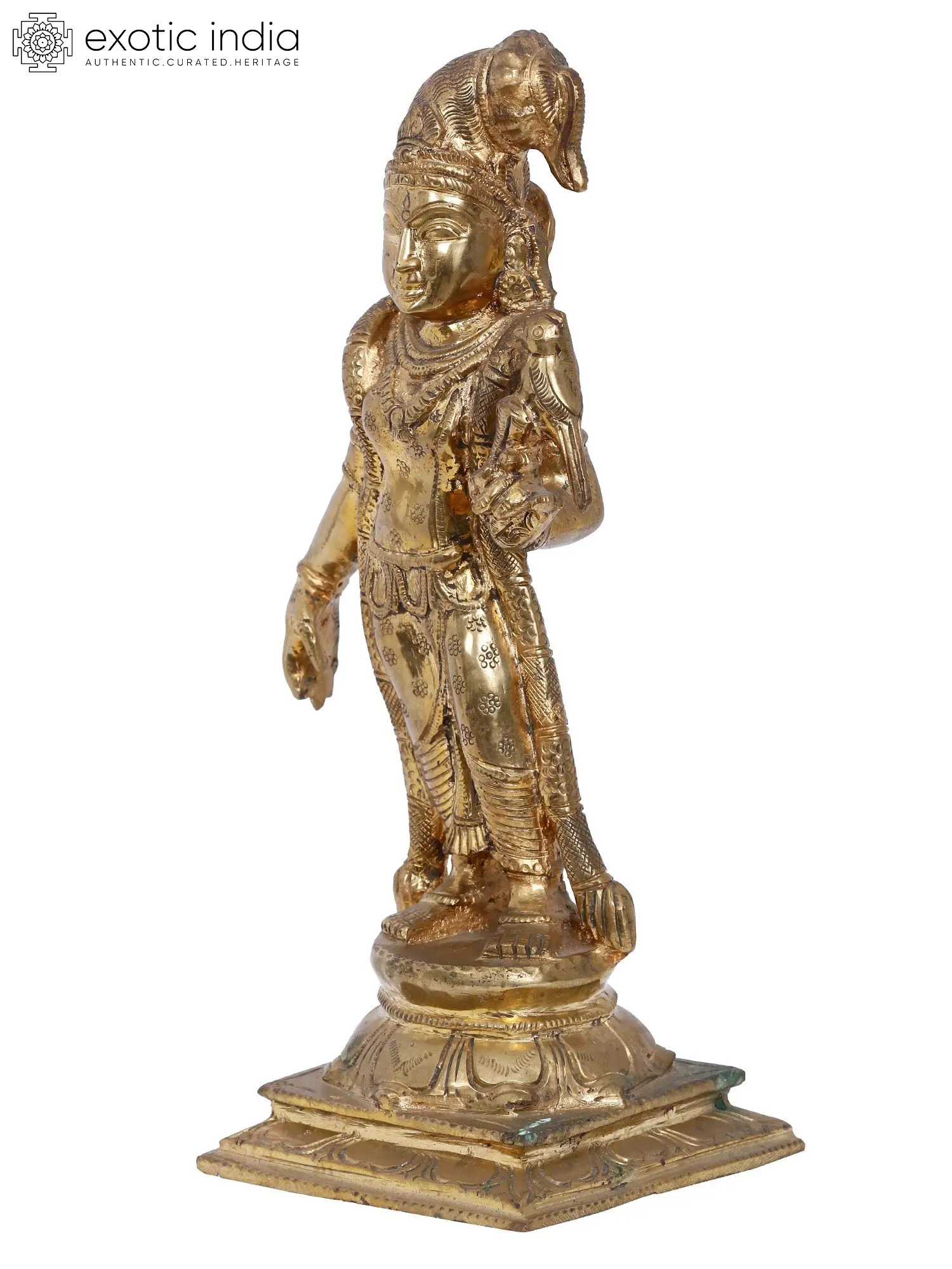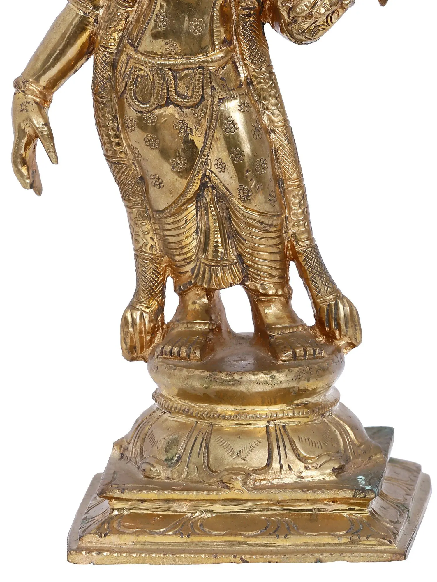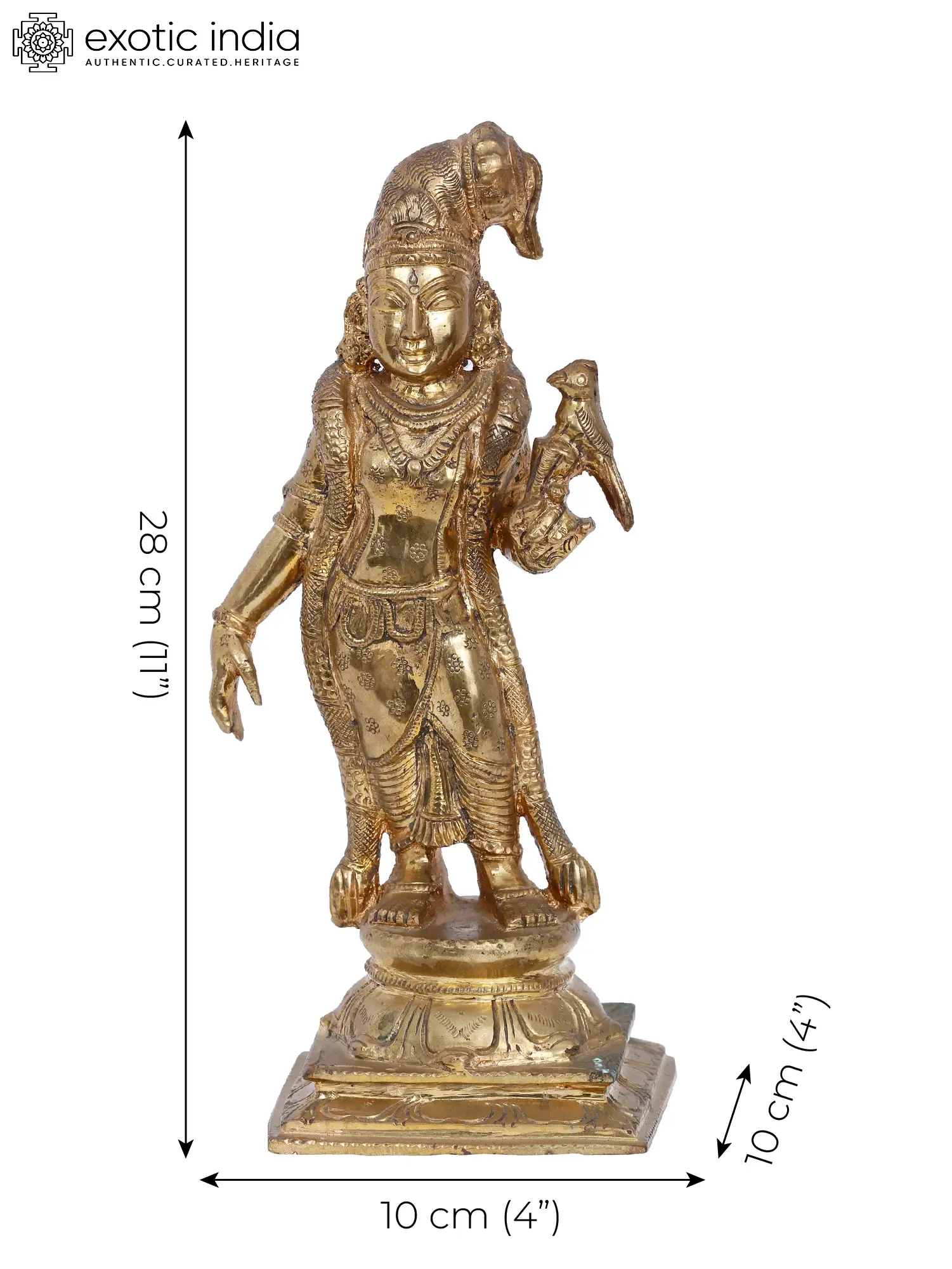 Goddess Andal, “the sole female Alvar among South India’s twelve Hindu poet-saints”, is revered as an avatar of Goddess Bhudevi. Affiliated with the Sri Vaishnava tradition, She authored two significant Tamil works - “Thiruppavai” and “Nachiar Tirumozhi”, recited during the “Margazhi festival”. Depicted in a “Tribhanga posture” on a lotus pedestal, Goddess Andal is adorned in regal attire. A floral garland, and ornate jewellery grace her divine form. Holding a lotus with a perched parrot, Goddess Andal symbolises grace, beauty, purity, prosperity and devotion. Crafted using the ancient “Madhuchista Vidhana (Lost-Wax) technique” in Panchaloha bronze from “Swamimalai”, this mesmerising creation encapsulates the essence of devotion and the auspicious connection between the divine and the mortal.