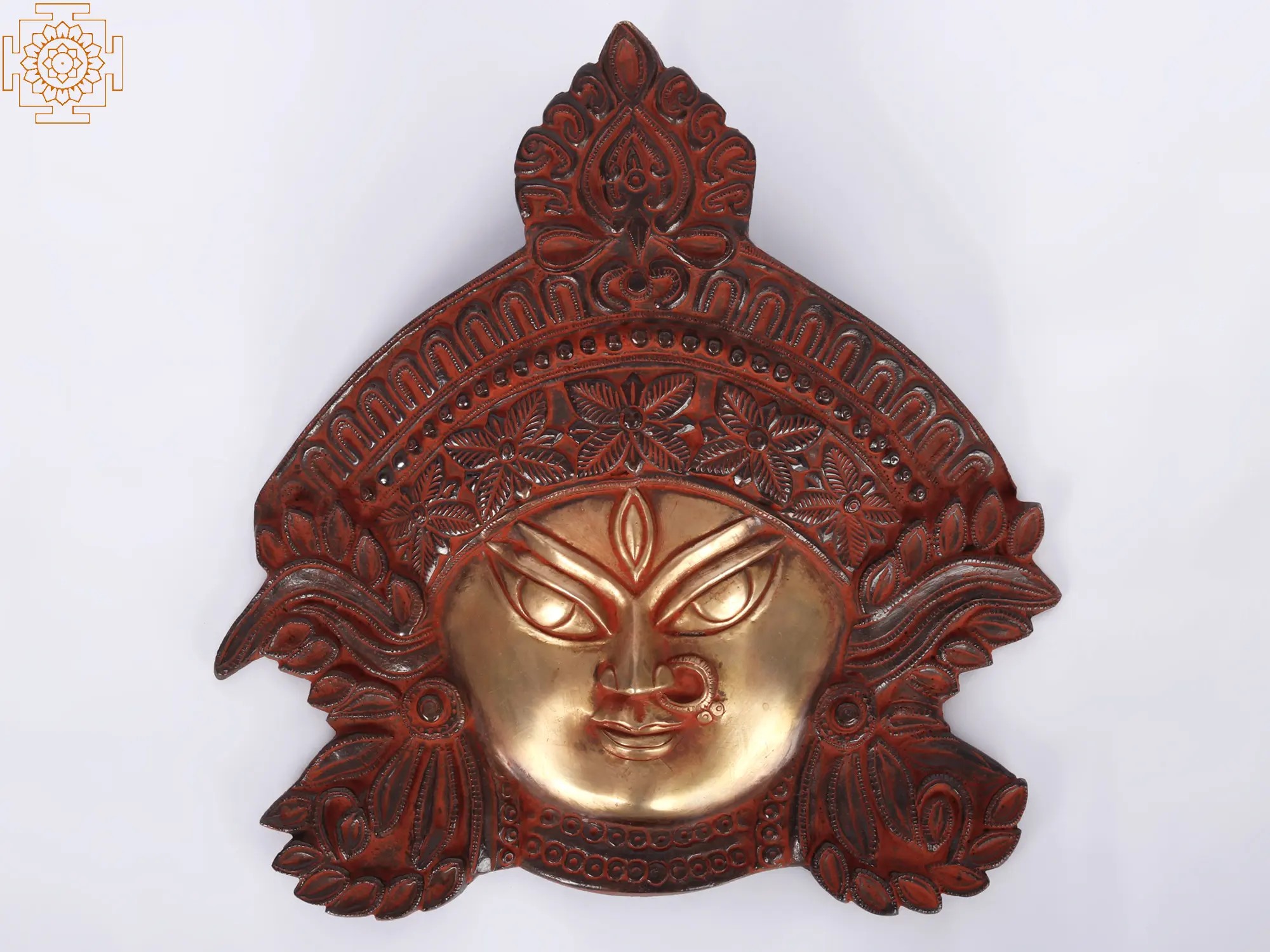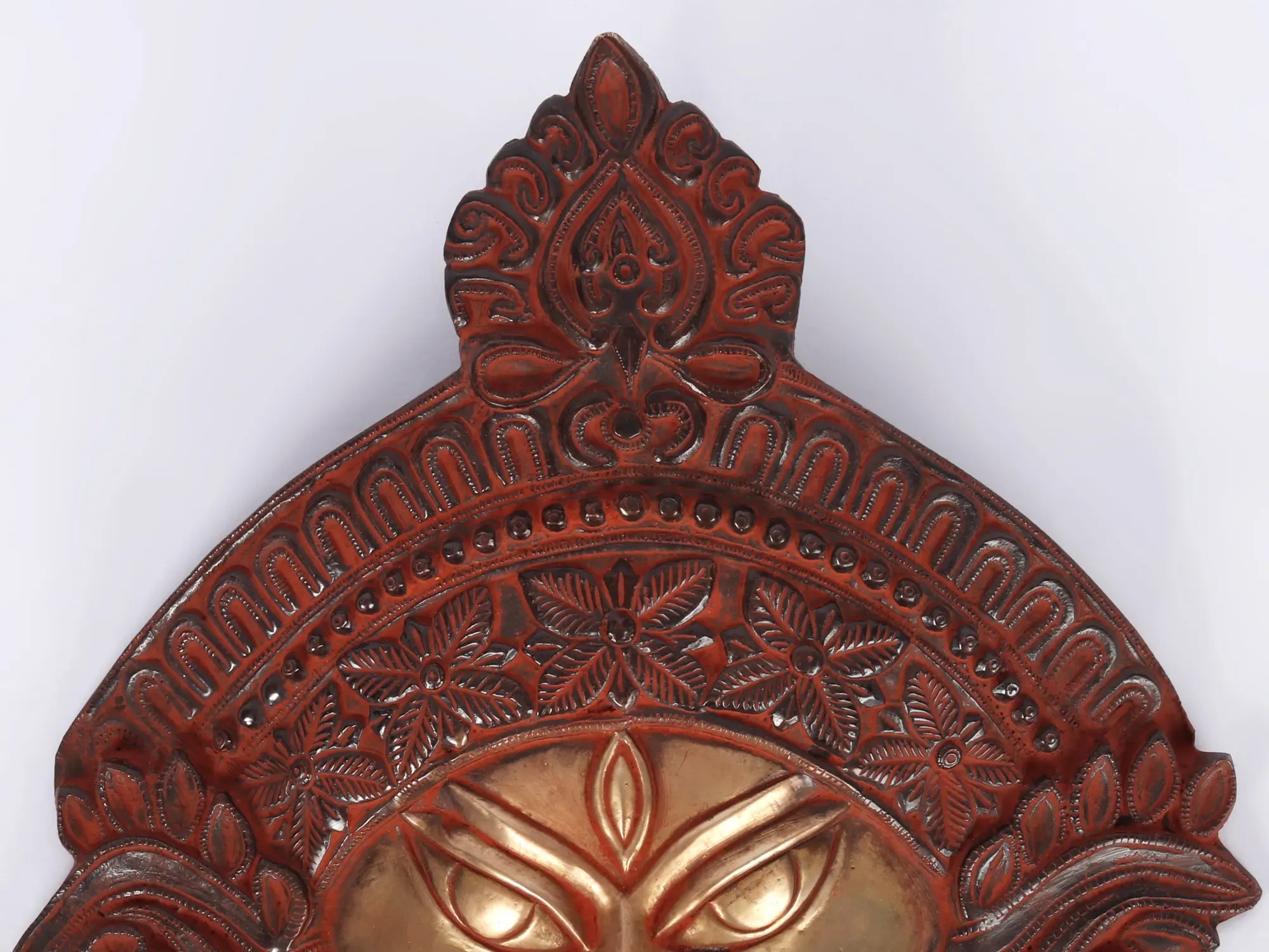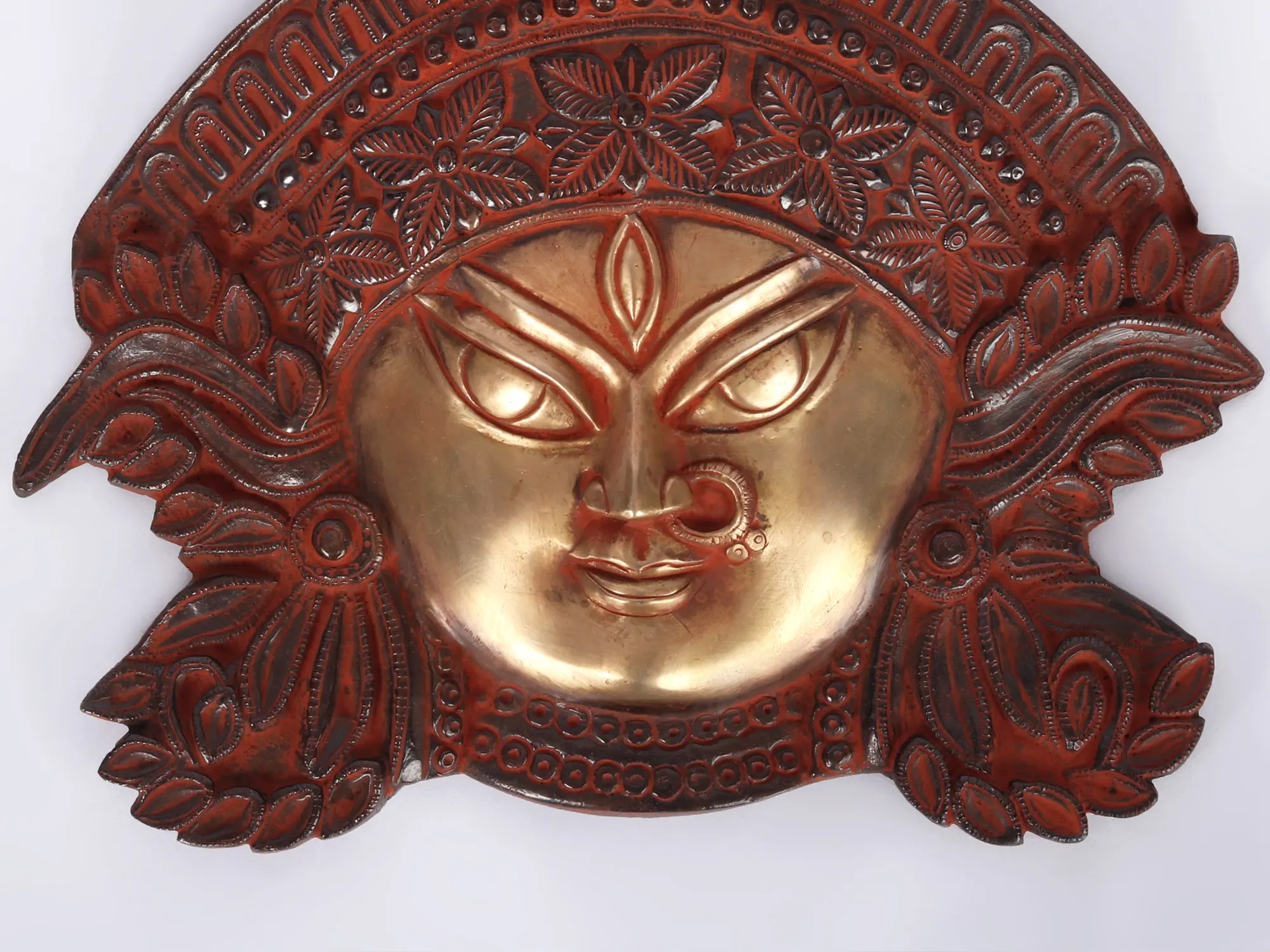 A symbolic icon : a partially revealed face, the forehead covered under the crown, and the neck, behind a necklace, the brass-piece, besides representing the great goddess in her two manifestations Durga and Kali, also represents with utmost thrust two most venerated art traditions of Bengal, one, the classical tradition of Pala bronzes, and the other, the Kalighat tradition of Kali images. While in its finesse, precise details, technical maturity and perfect execution, rare finish, delicately worked image and its overall quality it pursues the timeless idiom of Pala bronzes of early medieval centuries, in the adornment of the goddess that with its far greater proportion and emphasis dominates the image it pursues the folk line of the 19th century Kalighat art idiom still live in all forms of art in Bengal.
