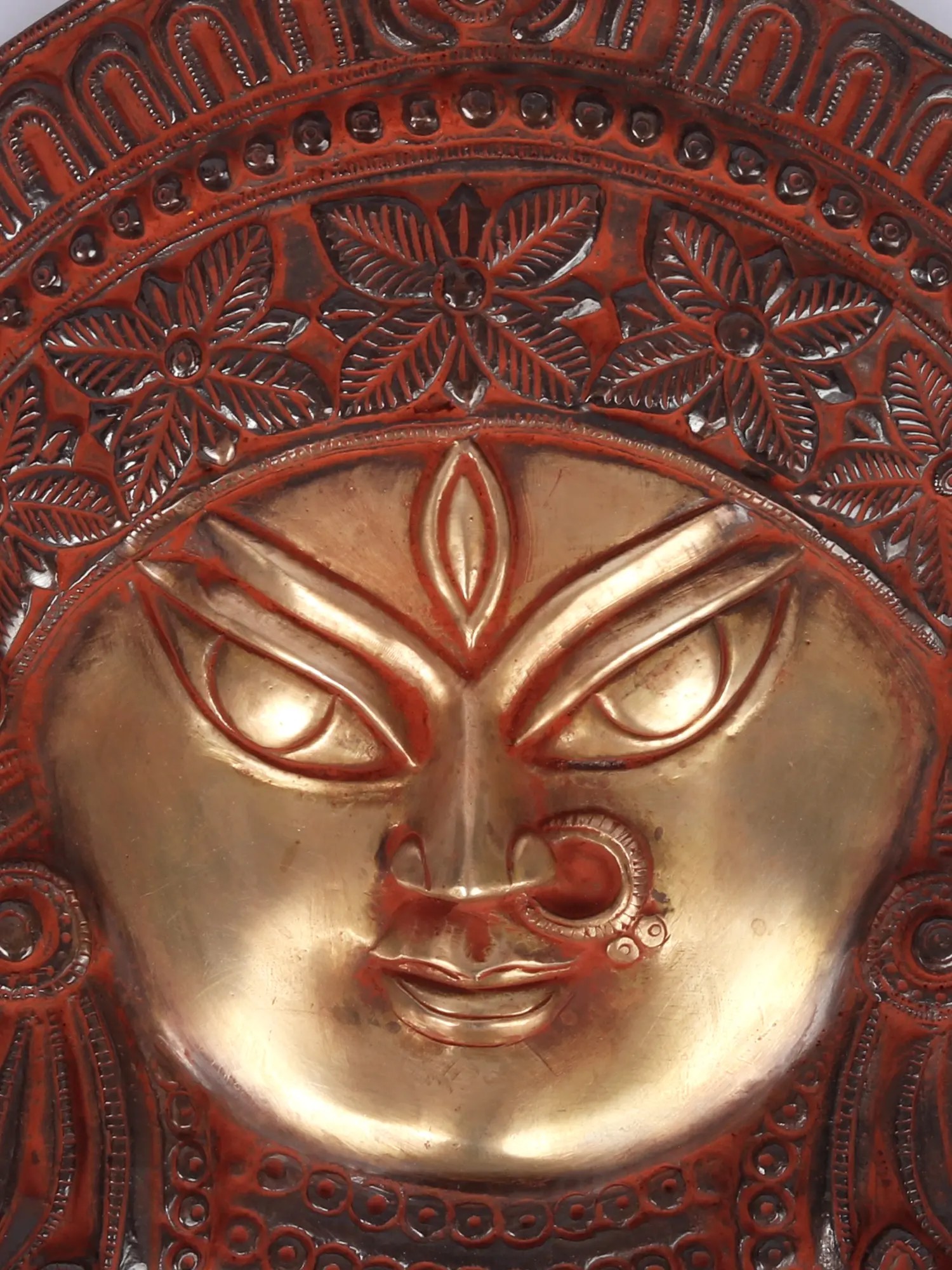 This lustrous wall hanging, a brass plaque cast with ornament-like fine details as the brass-like hard and uncompromising medium would yield with great difficulty, revealing rare beauty and charging the ambience with spiritual fervour, represents goddess Kali.