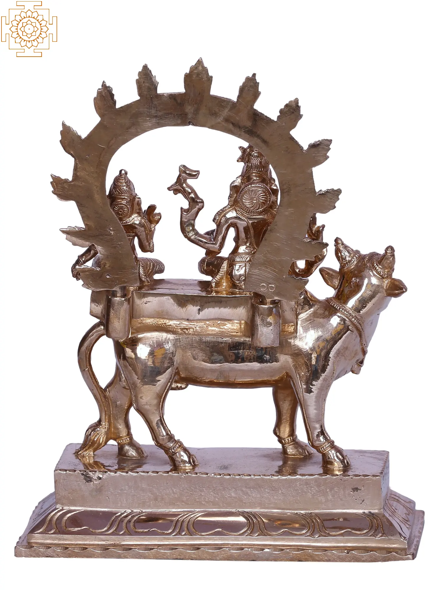 Sculpted in bronze precision, this artwork of Lord Shiva and Goddess Parvati atop Nandi (Shiva’s loyal mount), represents the harmonious union of divine energies and the balance between masculine and feminine principles. Nandi, a symbol of Dharma (righteousness), signifies the steadfast pursuit of truth. This portrayal also underscores the inseparable connection between Shiva and Nandi, reflecting the idea that sincere devotion and self-discipline lead to spiritual elevation and divine blessings. This divine artwork encapsulates the essence of cosmic balance and divine synergy.