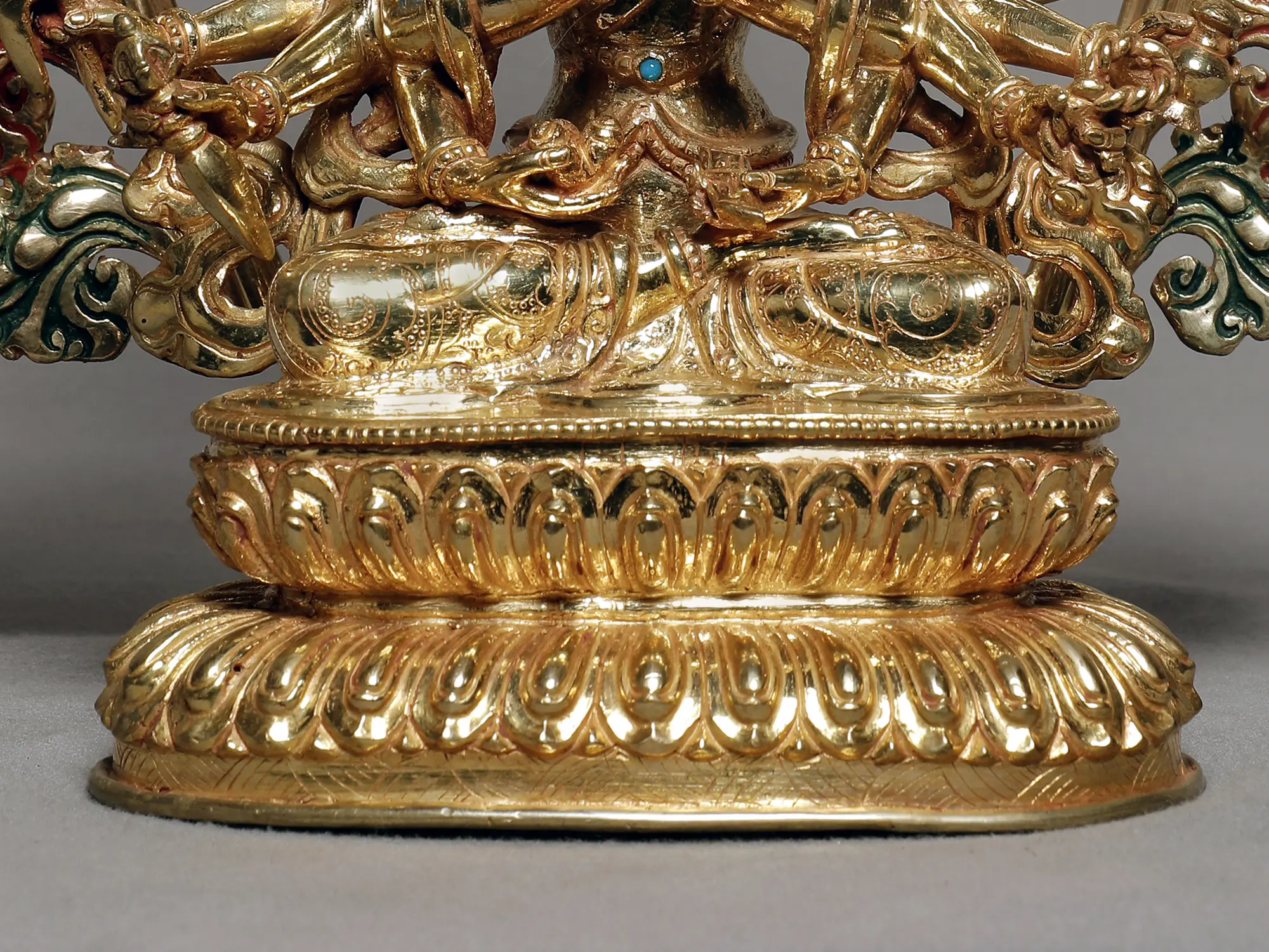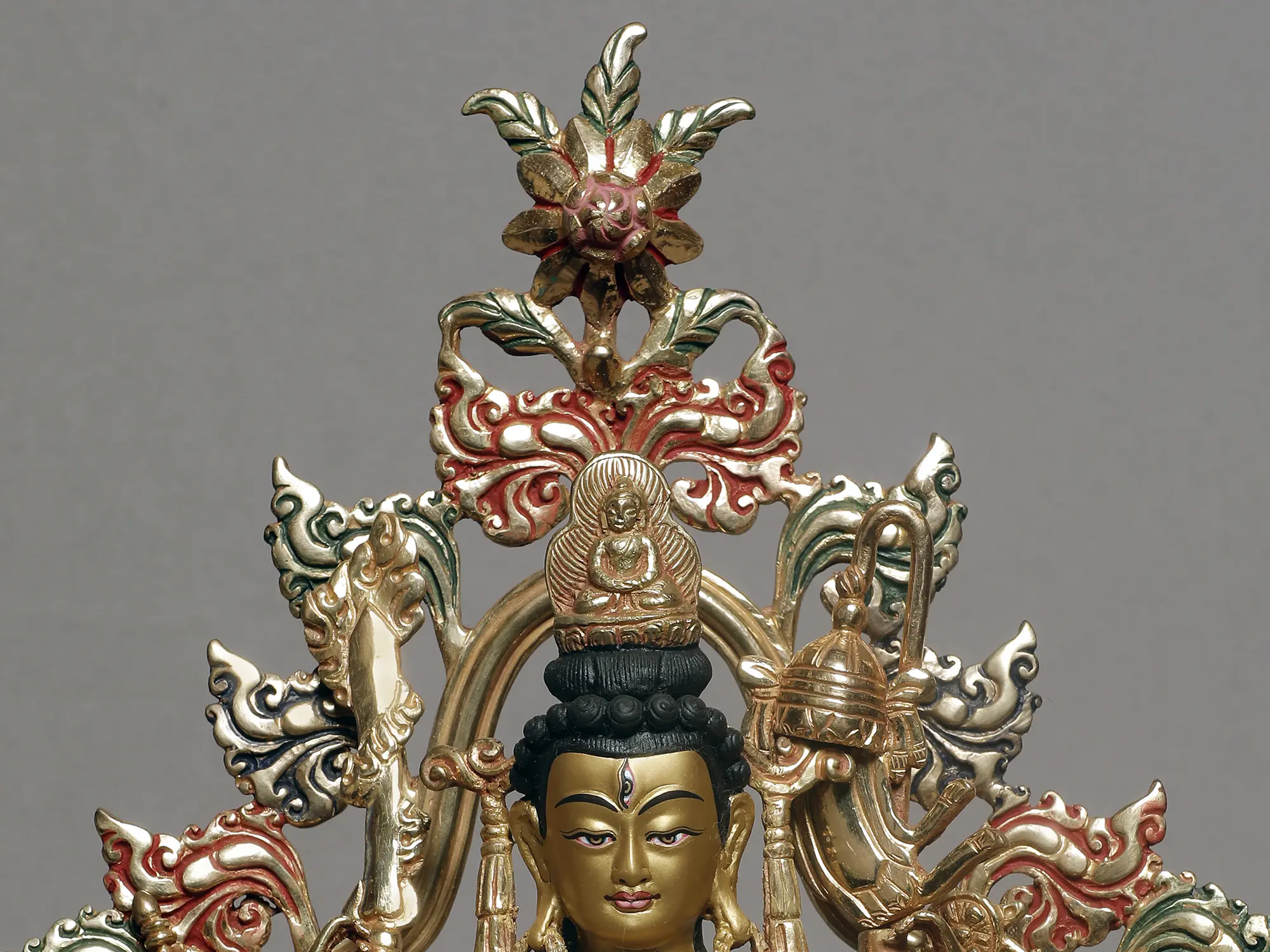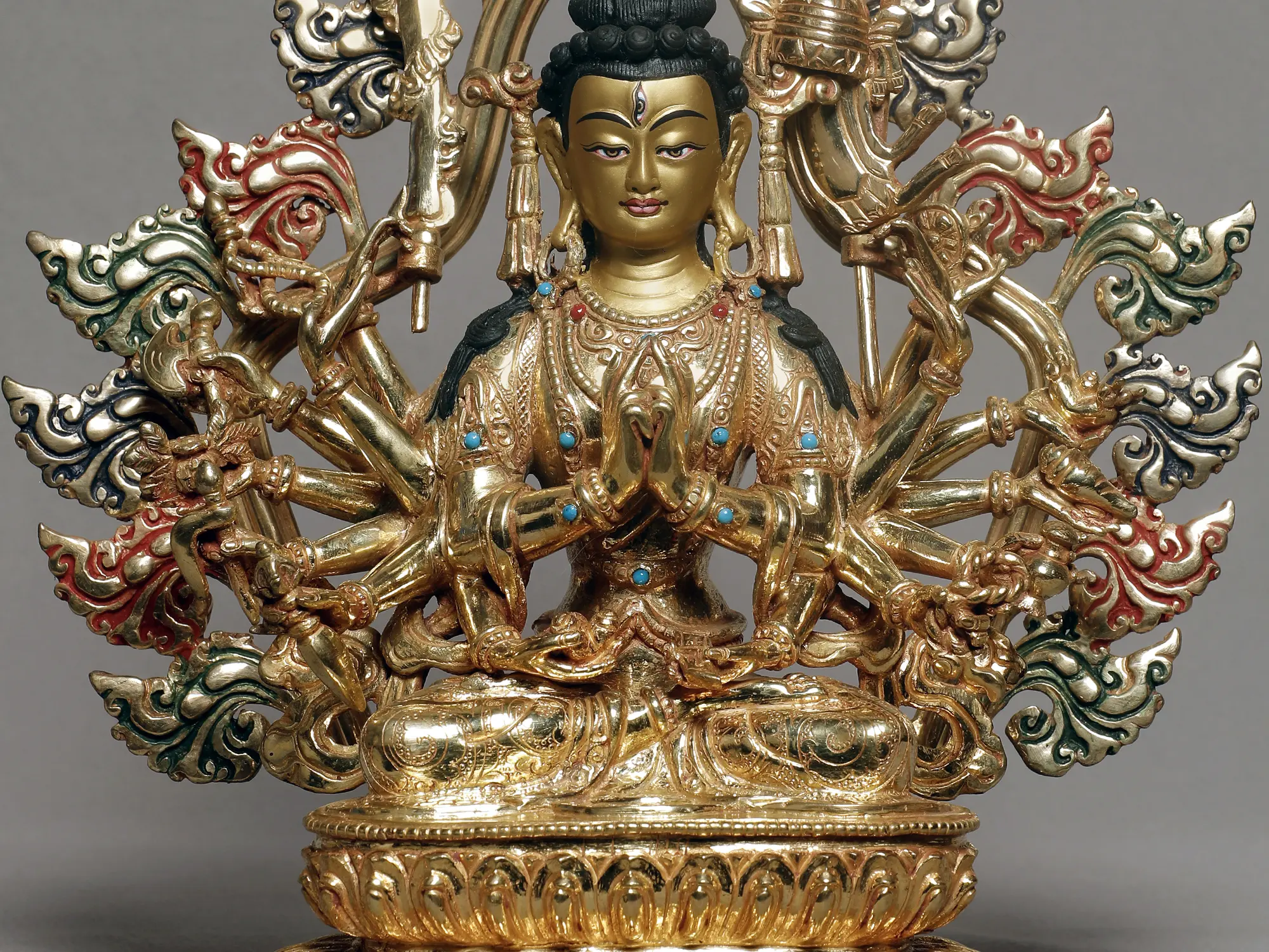 Her primary hands, as depicted in this brilliant gilded copper statute are in the Muladhar mudra- the gesture of awakening the root chakra, a powerful gesture in Hindu and Buddhist meditative practices, to begin the journey to spiritual awakening. Her eighteen arms carry weapons and emblems that represent her swiftness in protecting living beings from the past, present, and future, and transcending them to a high spiritual existence.