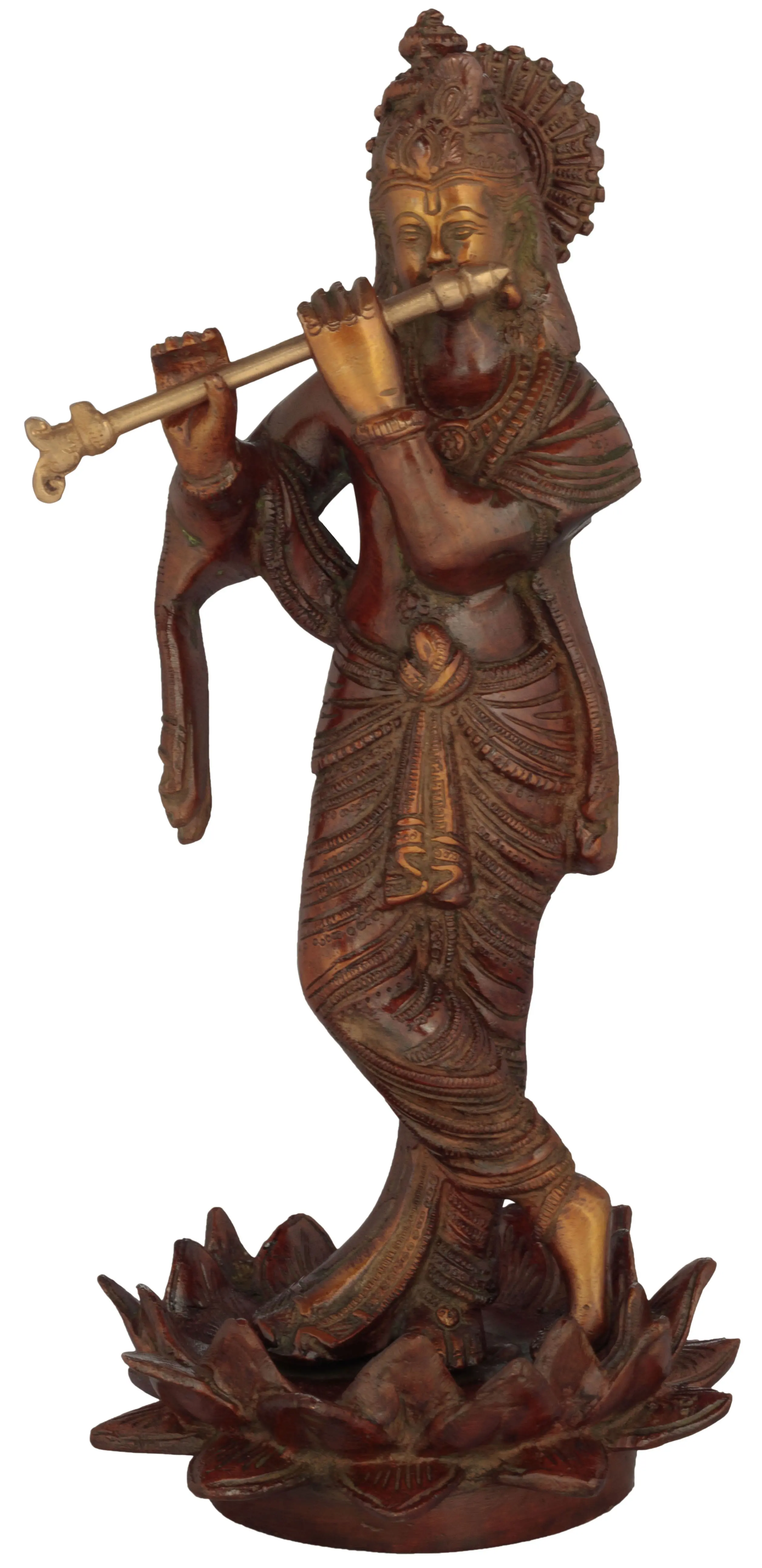 Each detail of this statue is a testament to the skill of the artisan. Fashioned from high-quality brass, the material itself lends an aura of enduring divinity and timeless beauty. The intricate carving of Krishna's attire, adorned with traditional Indian motifs, speaks of a rich cultural heritage. The contrasting finishes – the radiant gold tone of his skin and the rich brown and silver of his garments – add depth and visual appeal, making this a truly remarkable work of art. The lotus base upon which he stands symbolizes purity, enlightenment, and spiritual awakening, further enhancing the sacred aura of the sculpture.