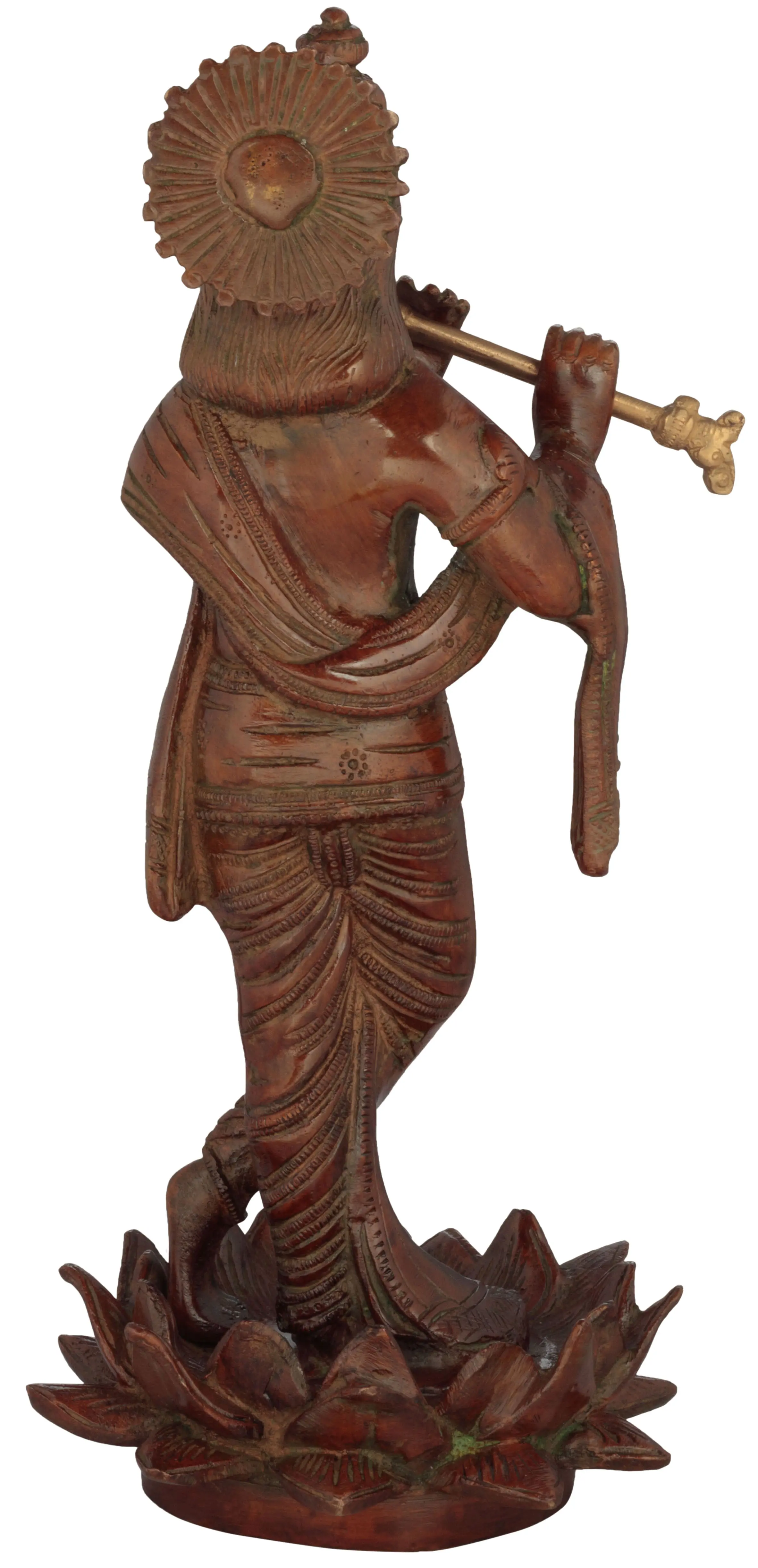 The young Lord stands atop a lotus in full bloom, its petals opened up in full measure. He plays on the flute, the serene and infectious smile on His countenance setting off a divine tone. Note the gorgeous, lifelike drape of His garment as it sits around His slender, youthful legs; and the stylised halo surrounding His head.