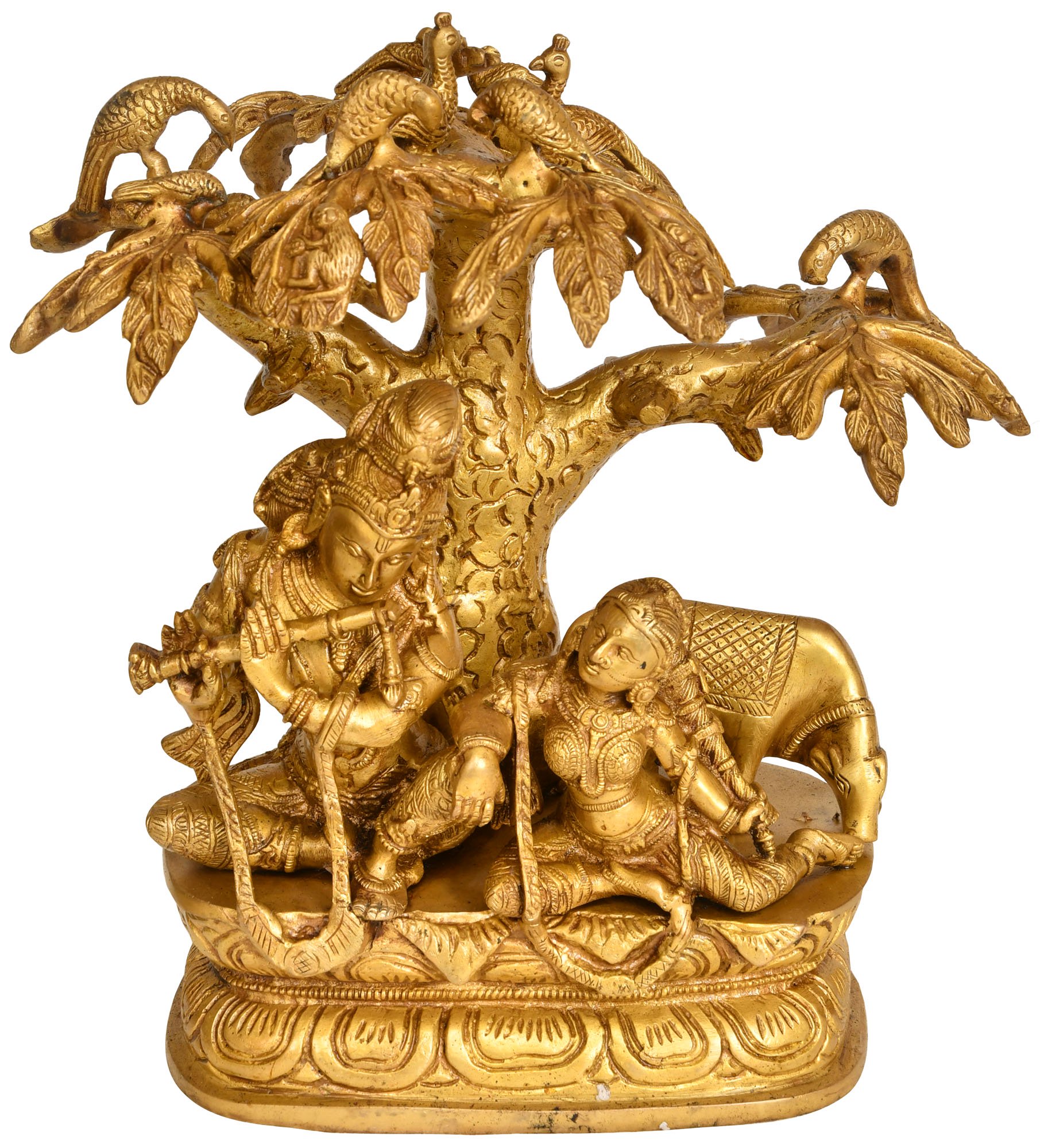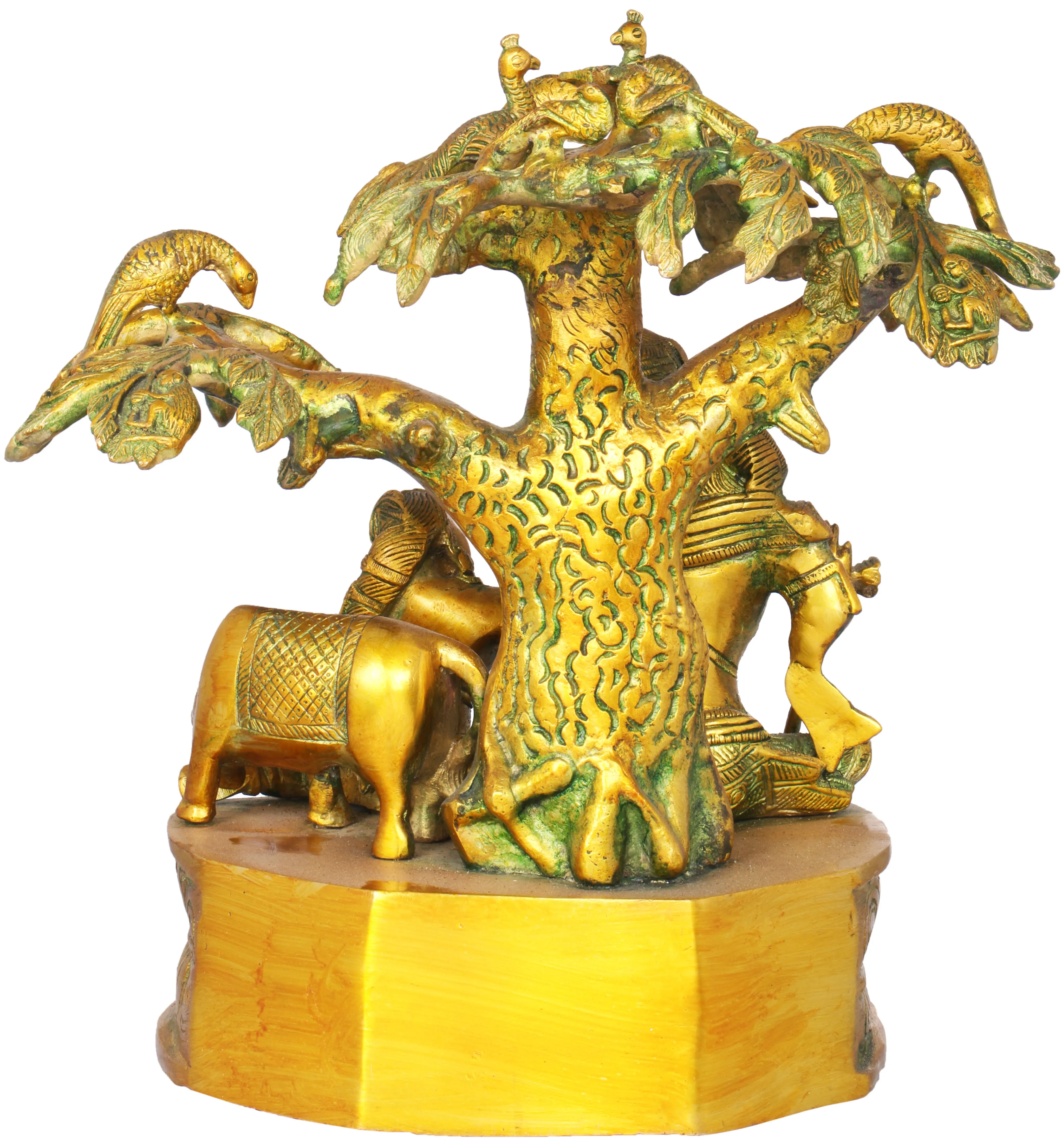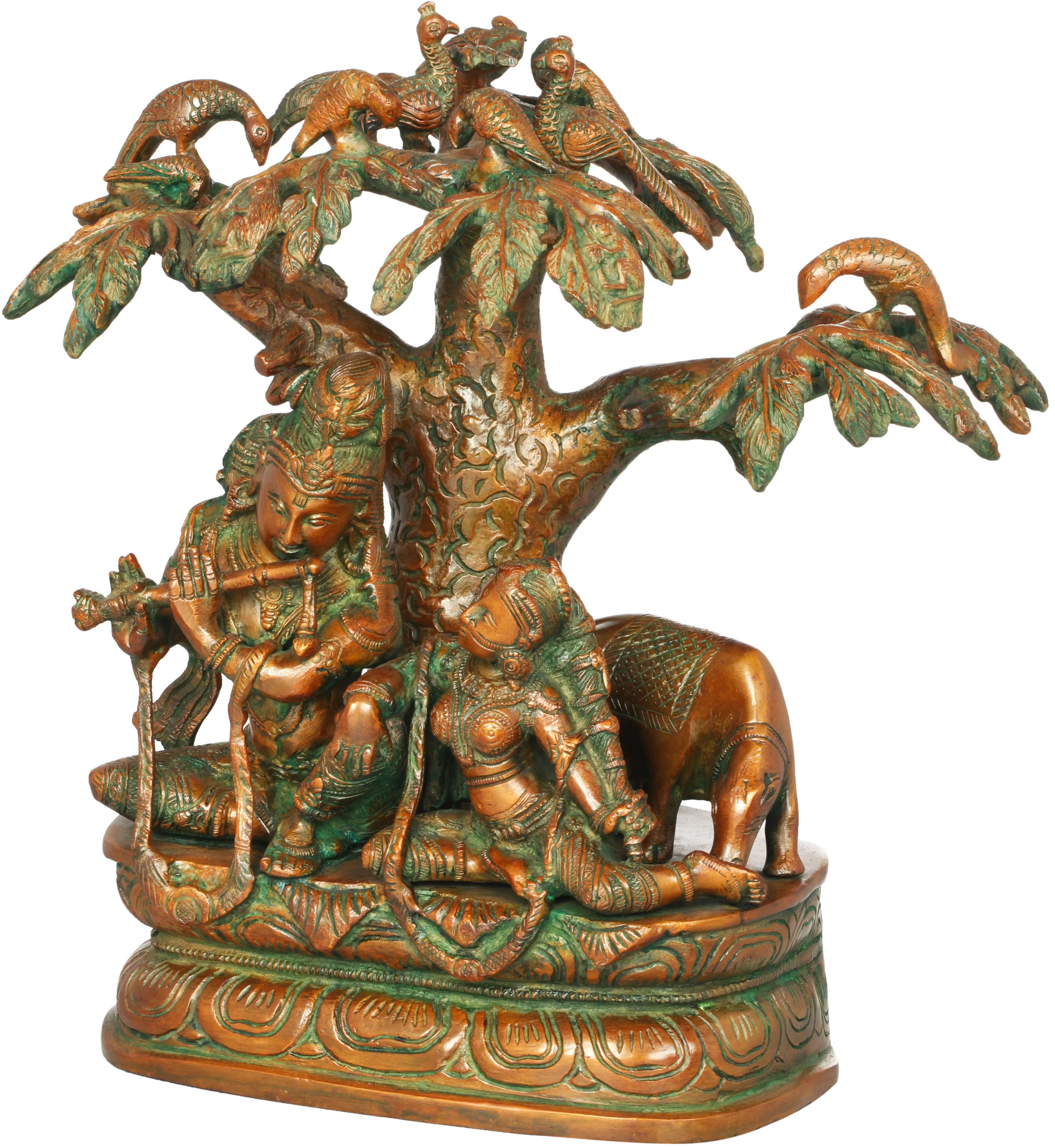 This exquisite brass sculpture captures a timeless moment of divine love and devotion. At its heart, Lord Krishna, the beloved deity, is depicted in a pose of serene contemplation, his fingers gracefully poised on his enchanting flute. The melodious notes, though silent in this cast form, are palpable, evoking the very essence of divine music that captivated all beings in the transcendental realms of Vrindavan. His gaze is soft, directed towards his beloved Radha, symbolizing their eternal bond and the pinnacle of selfless love. Radha, seated beside him, is a vision of grace and adoration. Her posture conveys deep reverence and a yearning for the divine presence of Krishna. Her ornate jewelry and attire speak of her regal bearing as the chief among the Gopis, yet her expression is one of profound devotion, a soul completely immersed in the love of the divine. Their togetherness under the lush canopy of a vibrant tree forms a picture of idyllic love, a scene frequently painted in the devotional literature and art of India.