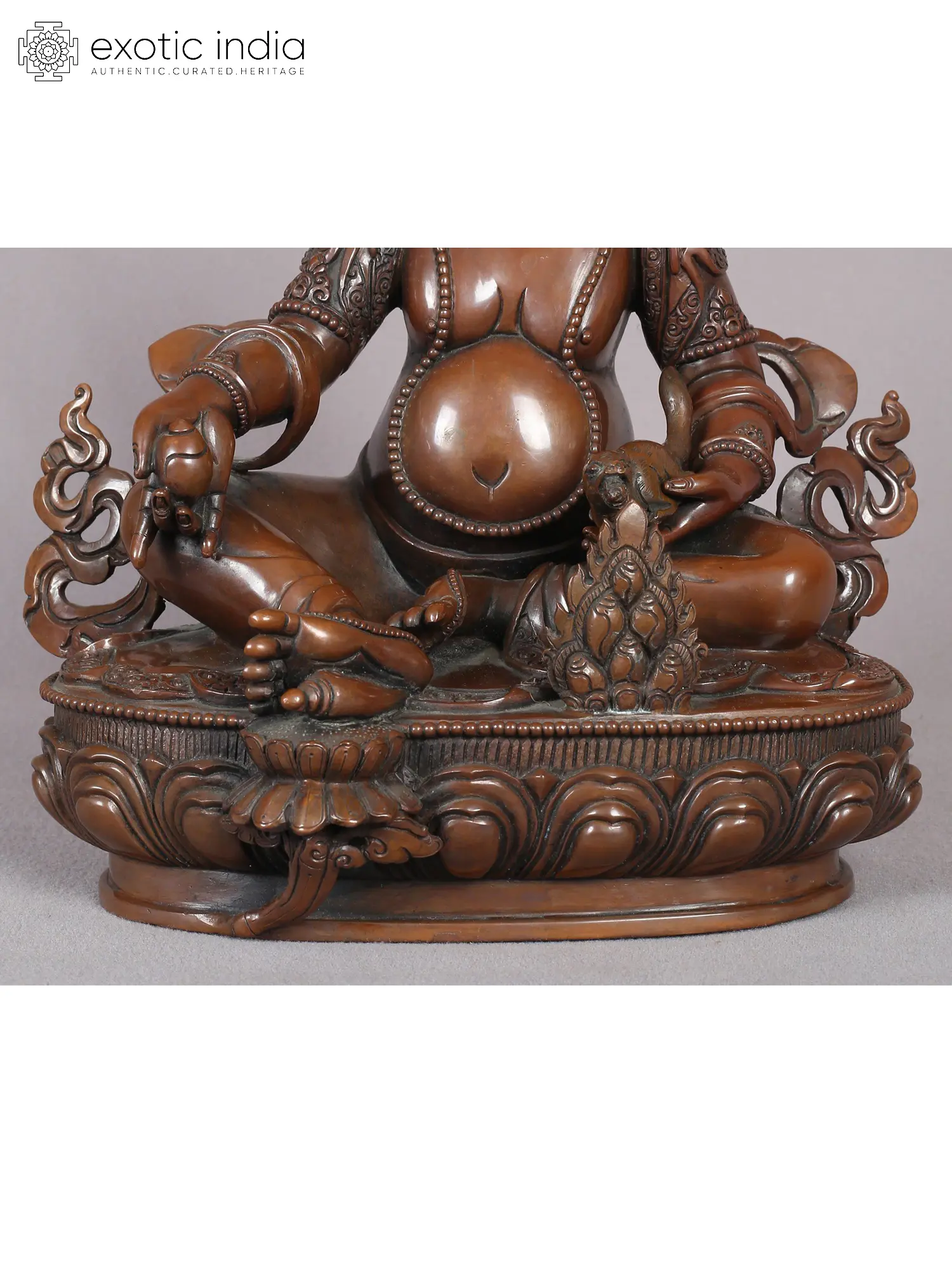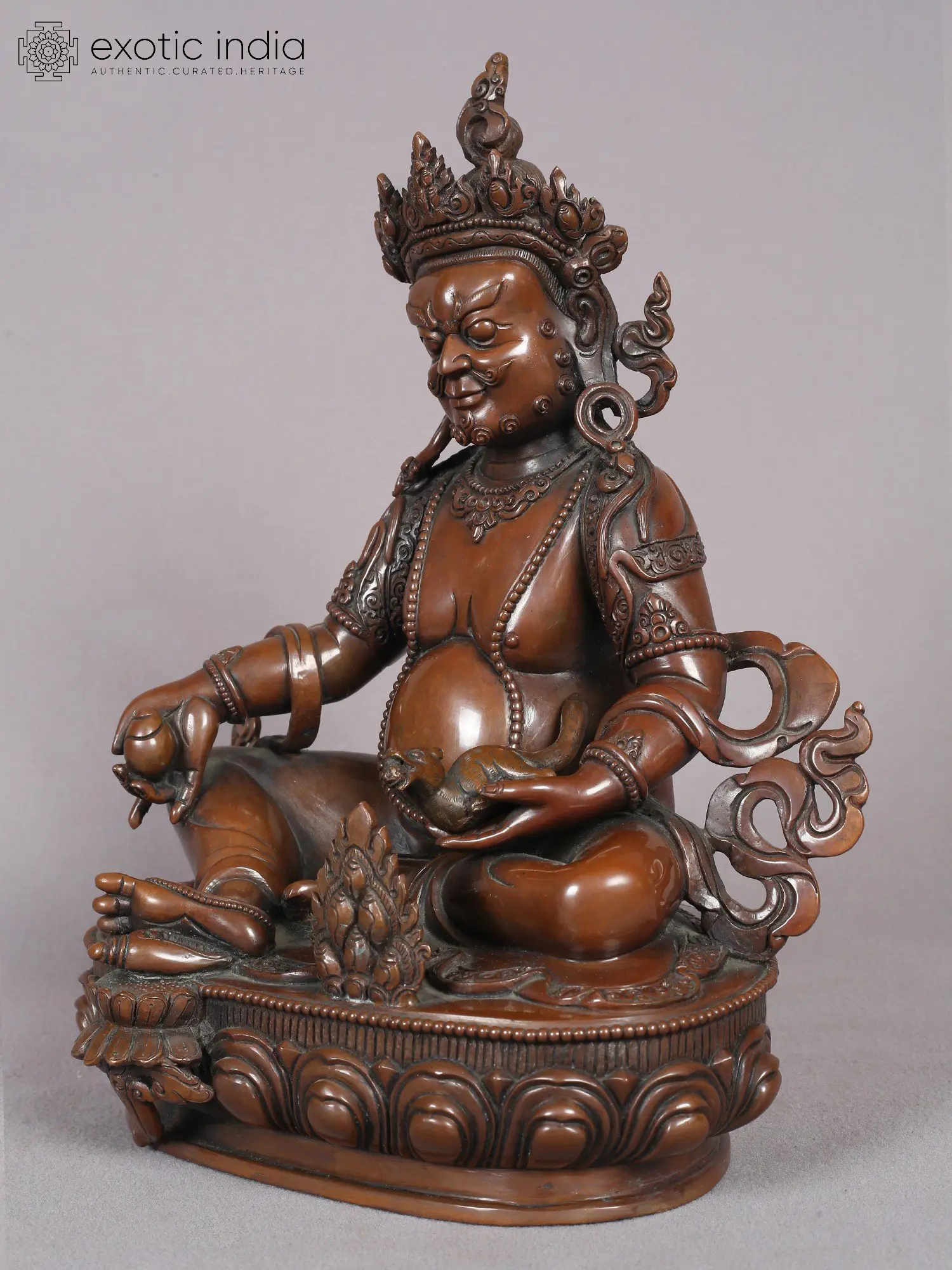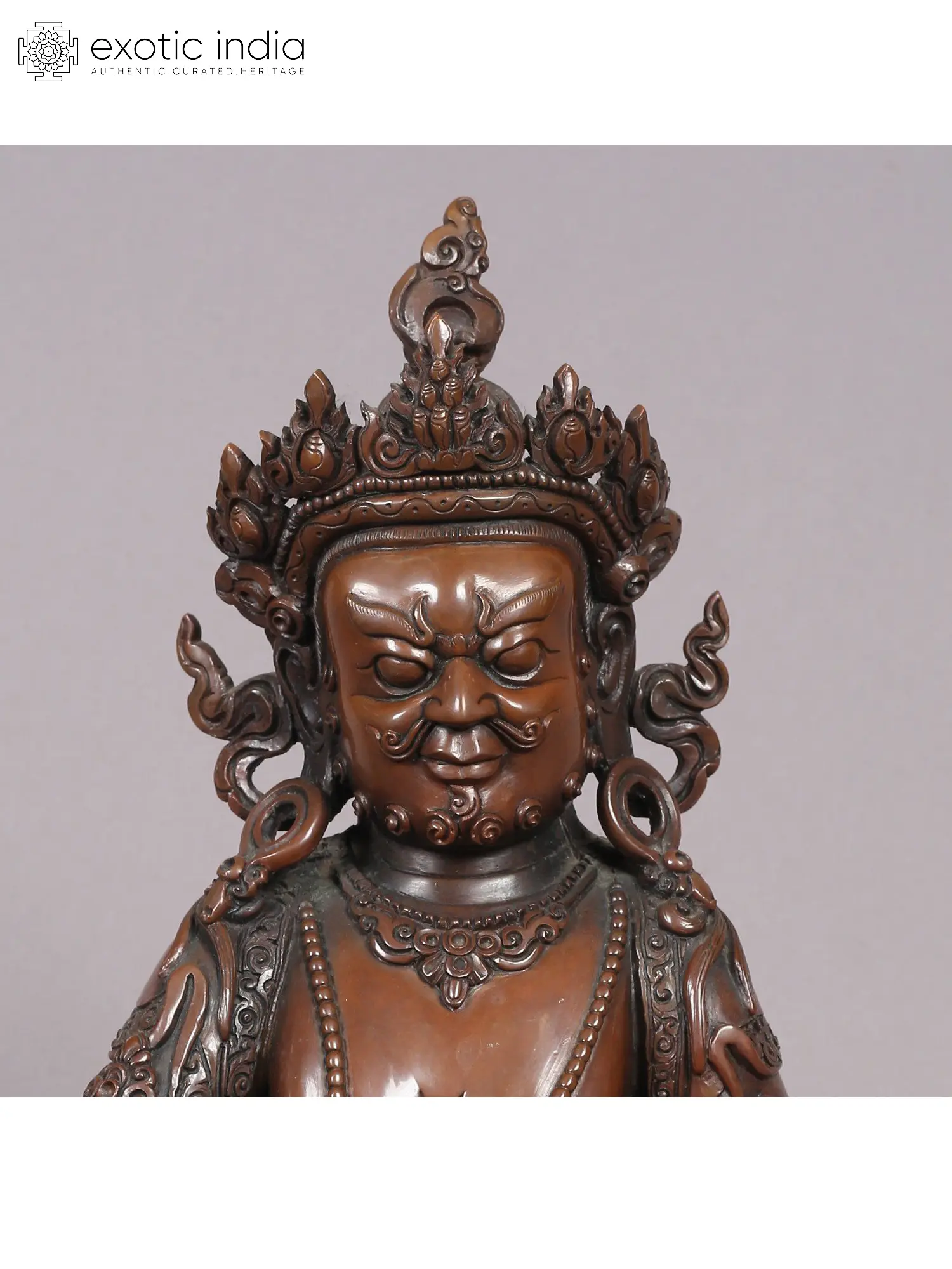 Intricately carved with meticulous precision, this copper statue of Dharampala Kubera stands as a testament to exquisite artistry, breathing life into the true form of the Lord of Yakshas. Kubera, known as the god of wealth, is intimately connected with concealed treasures like precious minerals and jewels. His distinctive plump figure, adorned with a commanding paunch, is a signature characteristic that symbolizes opulence and abundance.