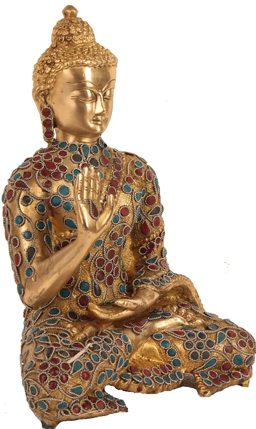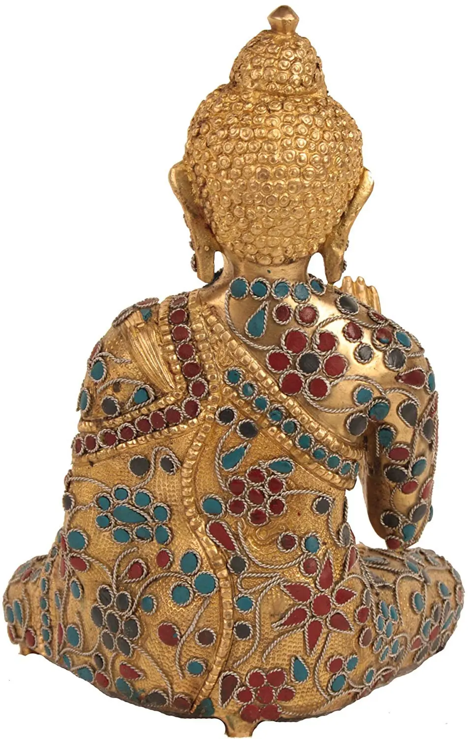 In this mesmerizing rendition, Lord Buddha sits in the Abhaya Mudra (gesture of fearlessness) emanating a powerful aura of fearlessness and protection. This representation shows the “Enlightened One” with his right hand raised, palm facing outward in a gesture of reassurance and dispelling fear. The left hand rests gracefully on his lap, signifying inner peace and meditation. This gesture symbolizes the moment when Lord Buddha tames an elephant, illustrating his ability to pacify inner and outer conflicts with compassion. Crafted in Brass and embellished with intricate inlay work, this artwork is an eternal reminder to embrace fearlessness and extend compassion, inspiring devotees to navigate life’s challenges with courage and grace.