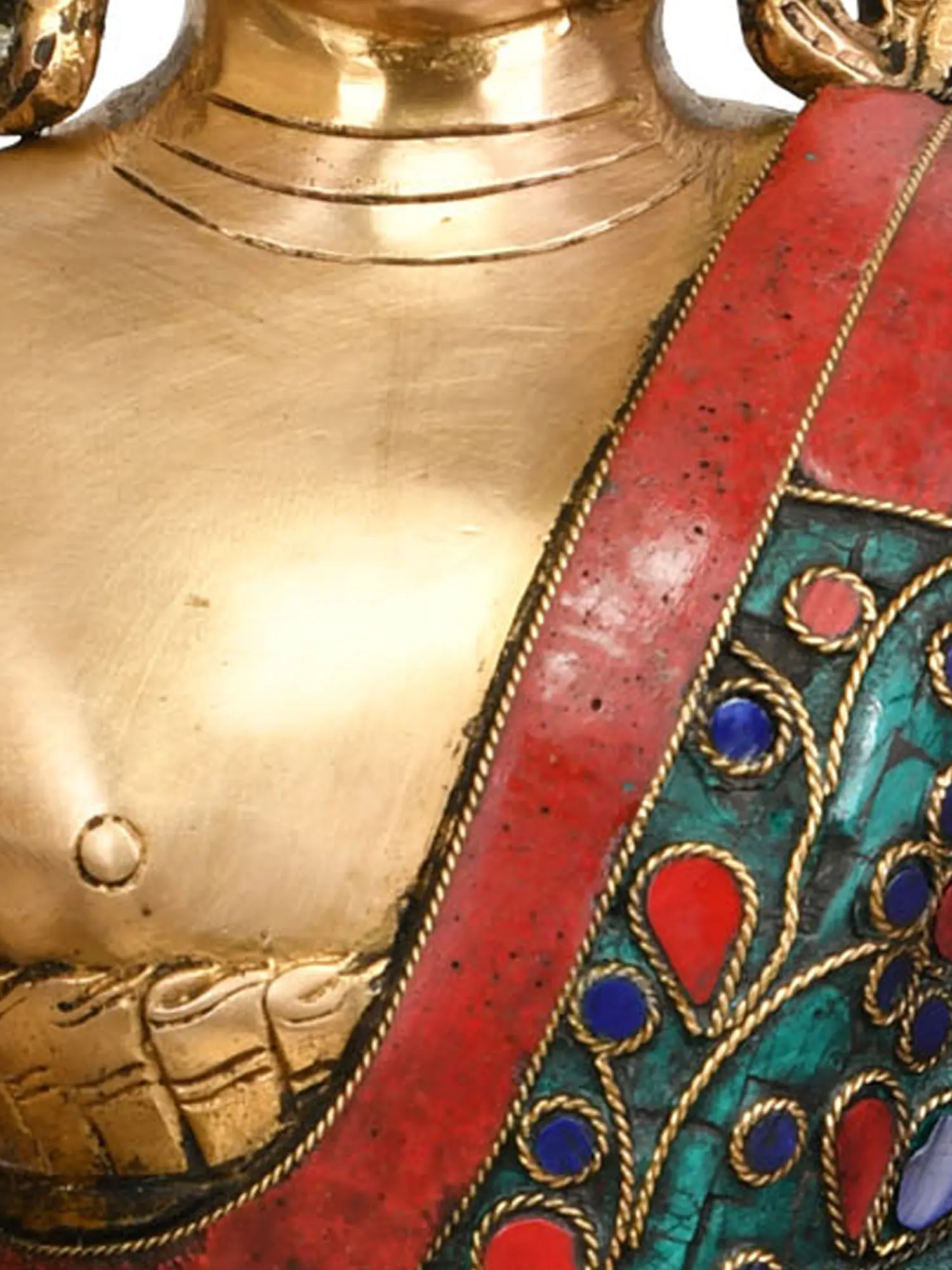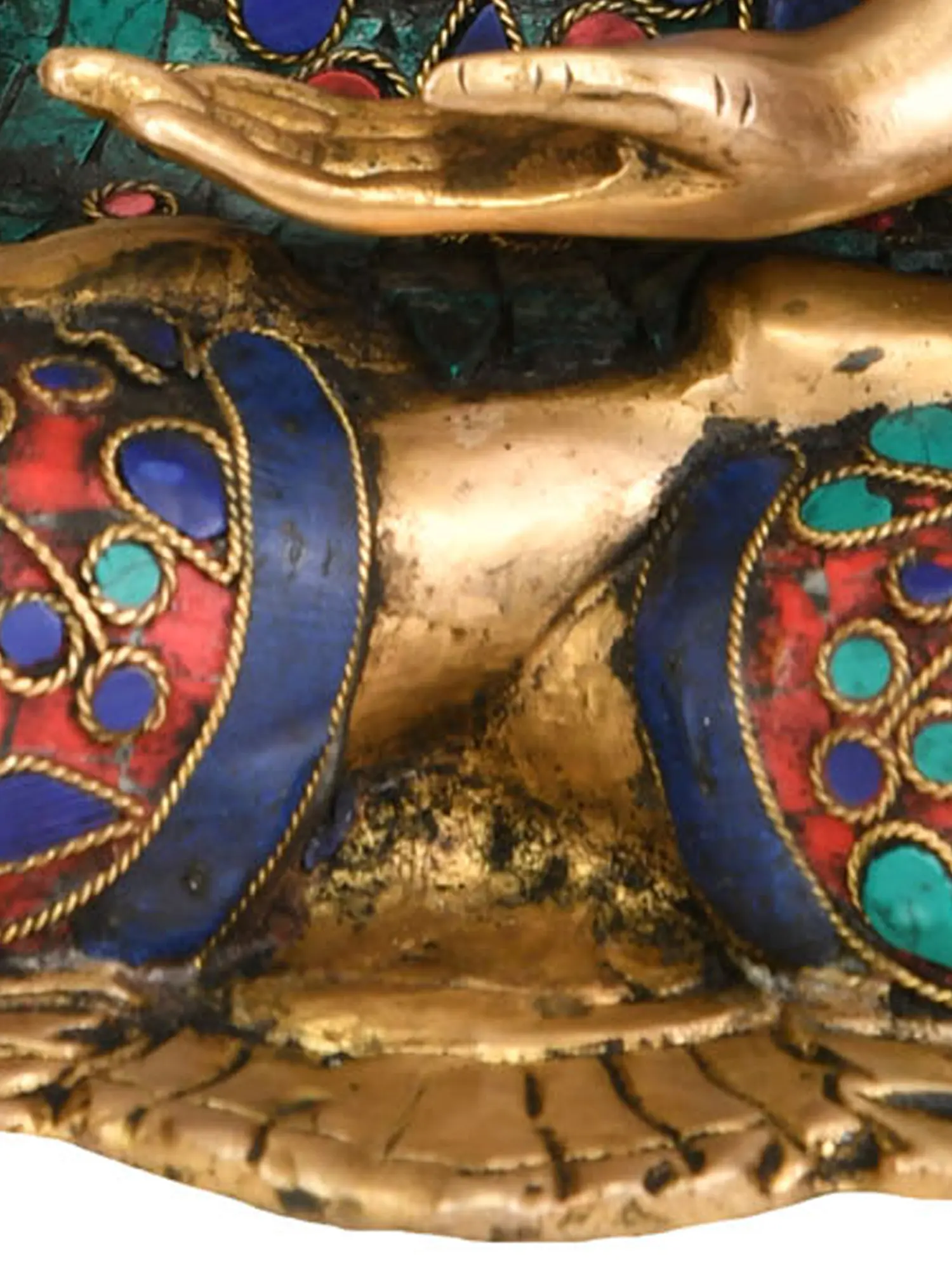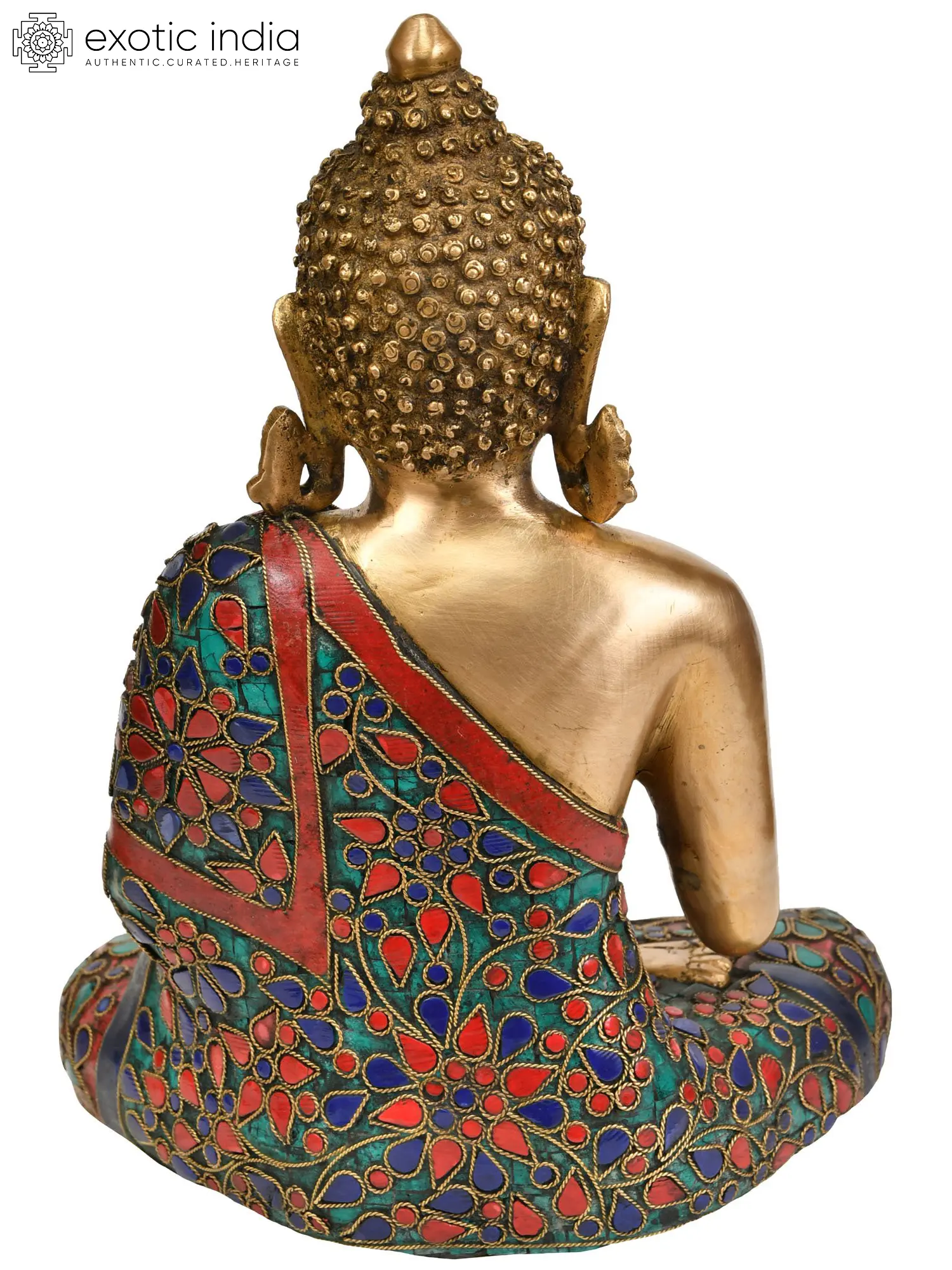 This magnificent piece is not merely a statue; it is a testament to the rich artistic heritage of India. Crafted from high-quality brass, it is further adorned with intricate inlay work, a hallmark of traditional Tibetan Buddhist art. The vibrant, jewel-toned stones set within the flowing robes and across the layered garments create a visual spectacle, reminiscent of the opulent regalia worn by Tibetan lamas and deities. Each stone, carefully chosen and meticulously placed, adds a layer of depth and brilliance, reflecting the spiritual luminescence of the Buddha. The swirling patterns and floral motifs that encircle the robes evoke the blossoming of spiritual understanding and the interconnectedness of all life, mirroring the intricate mandalas used in Buddhist meditation.