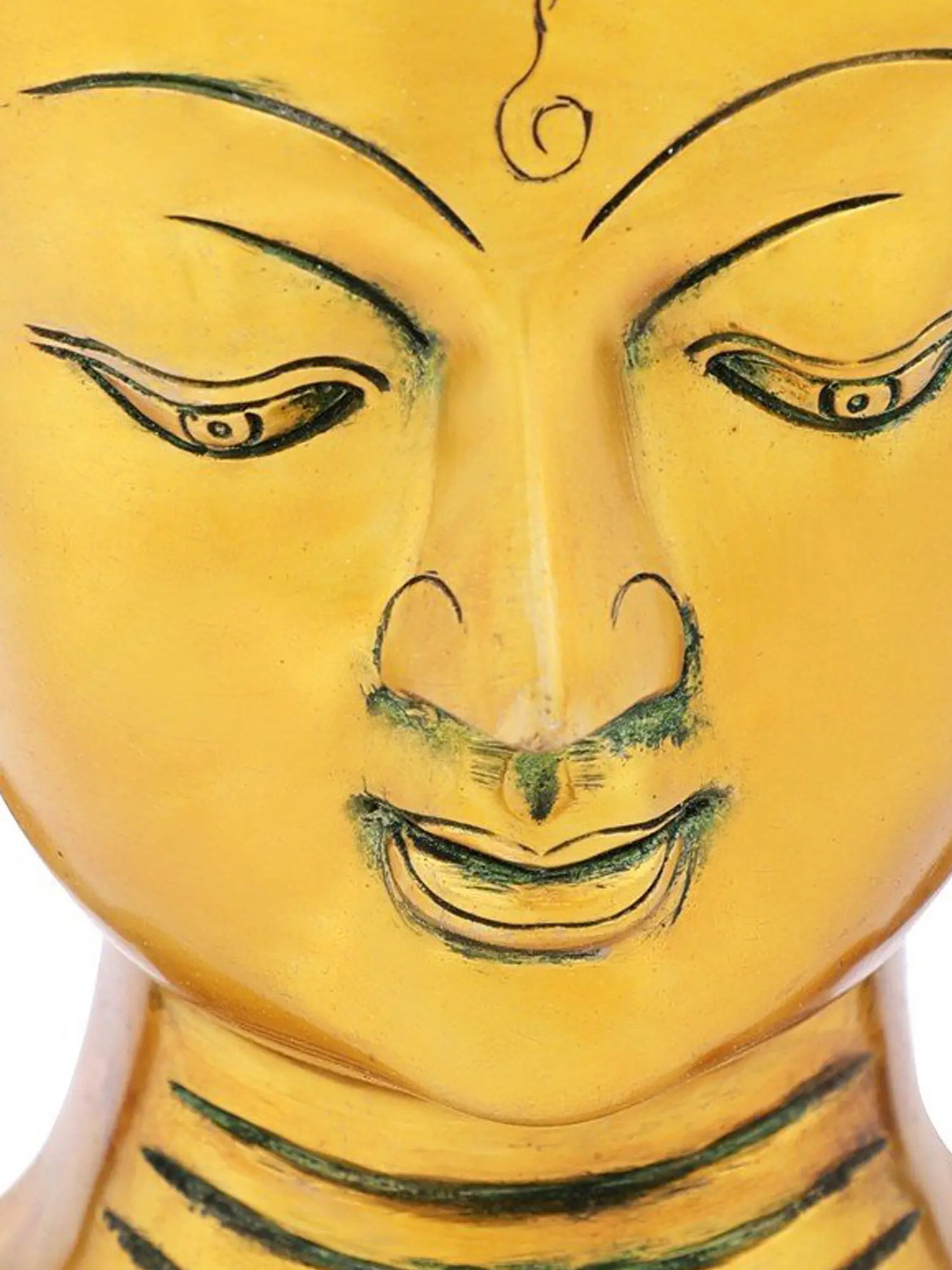 This exquisite brass wall hanging mask captures the profound peace and wisdom of Lord Buddha, a beacon of spiritual enlightenment. Meticulously handcrafted in India, this piece embodies the artistic heritage and spiritual devotion passed down through generations. The warm, radiant hue of the brass evokes the golden light of awakening, while the intricate detailing speaks to the dedication of the artisan who brought this sacred form to life. The mask presents the serene countenance of the Buddha, with eyes gently closed in meditation, suggesting an inward journey towards Nirvana. The urna, a dot of white hair between the eyebrows, is a symbol of his third eye, signifying his omniscience. The coiled curls of his ushnisha, the cranial protuberance, are rendered with remarkable precision, each a testament to his profound spiritual energy and wisdom. The subtle green patina accentuates the contours of the ushnisha and the facial features, adding depth and a touch of antiquity to the piece. The gentle, almost imperceptible smile hints at the boundless compassion that the Buddha embodies. ––––––––––––––––––