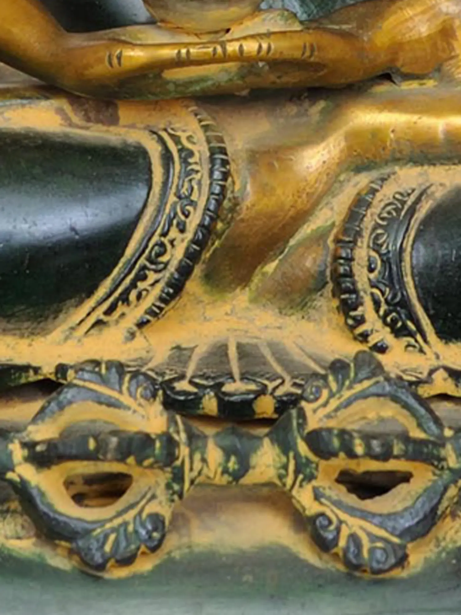 The presence of the Dorje, also known as the Vajra, is a significant aspect of this sculpture. This ancient symbol, meaning both thunderbolt and diamond, represents indestructible awareness, spiritual power, and the awakened mind. It signifies the unwavering nature of truth and the ability to overcome ignorance and delusion, much like a thunderbolt cuts through darkness and a diamond's hardness is unmatched. In Buddhist traditions, the Dorje is often paired with a bell, symbolizing the union of wisdom and compassion. Here, its placement signifies the Buddha's ultimate victory over suffering and his attainment of enlightenment, a state of profound clarity and liberation. The lotus flower, subtly held in the Buddha's hand, is another powerful symbol, representing purity, spiritual awakening, and the ability to rise above the mud of attachment and desire to bloom into full enlightenment.