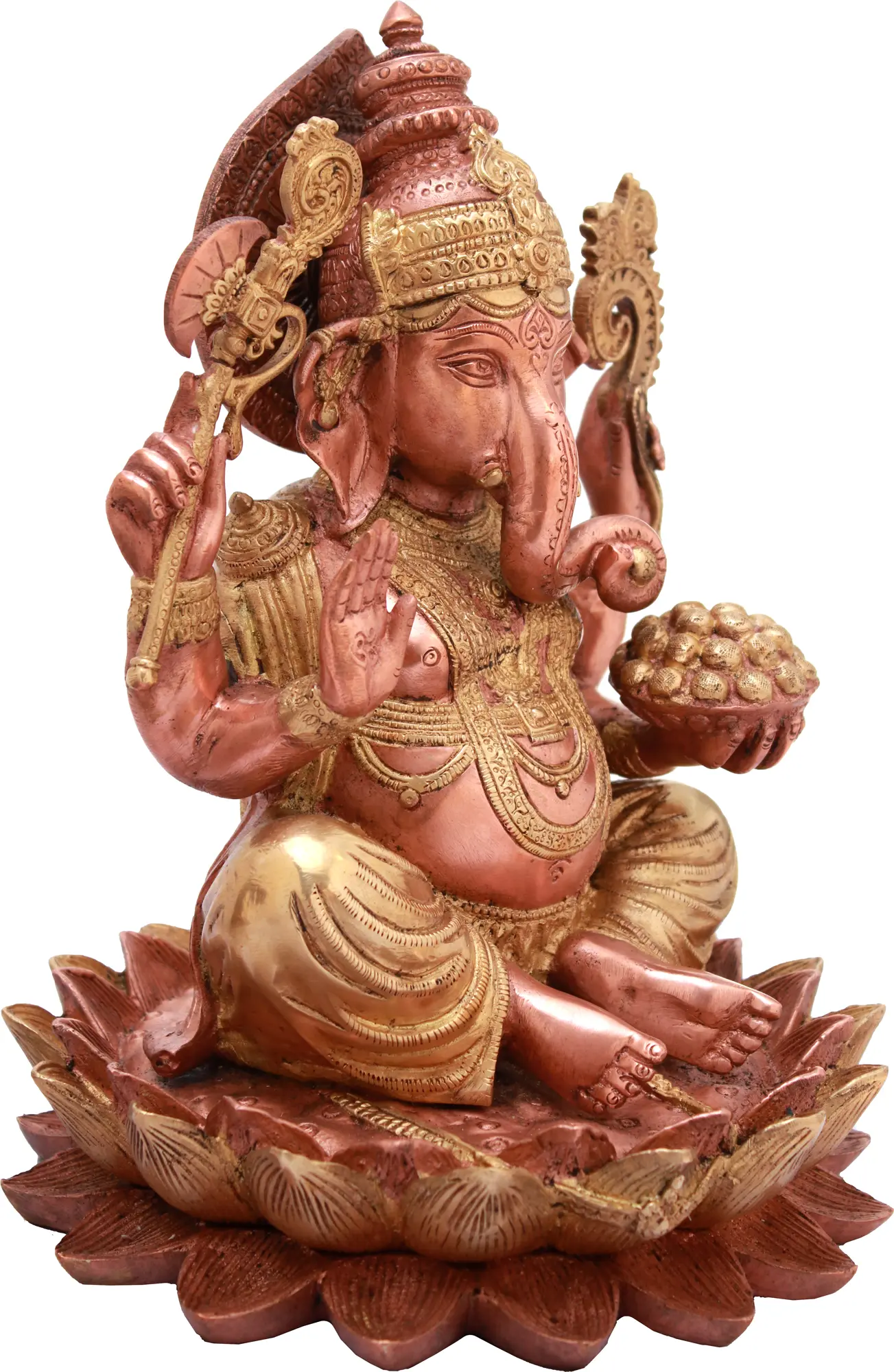Lord Ganesha is depicted here with his iconic elephant head, symbolizing wisdom, intelligence, and strength. His multiple arms represent his omnipresence and his ability to fulfill various divine functions. In his hands, he holds significant emblems. The 'ankusha' (goad) is used to impale the devotee's ignorance, while the 'pasha' (noose) signifies his ability to bind the devotee to the right path and also implies his control over worldly desires. The modak, a sweet dumpling, held in his other hand, represents the reward of spiritual bliss. His upward-facing hand is in the Abhaya Mudra, a gesture of blessing, reassurance, and protection, dispelling fear and bestowing courage. The lotus upon which he rests is not merely decorative; it signifies that even in the material world, one can remain pure and rise above worldly attachments, just as the lotus rises unstained from the muddy waters.