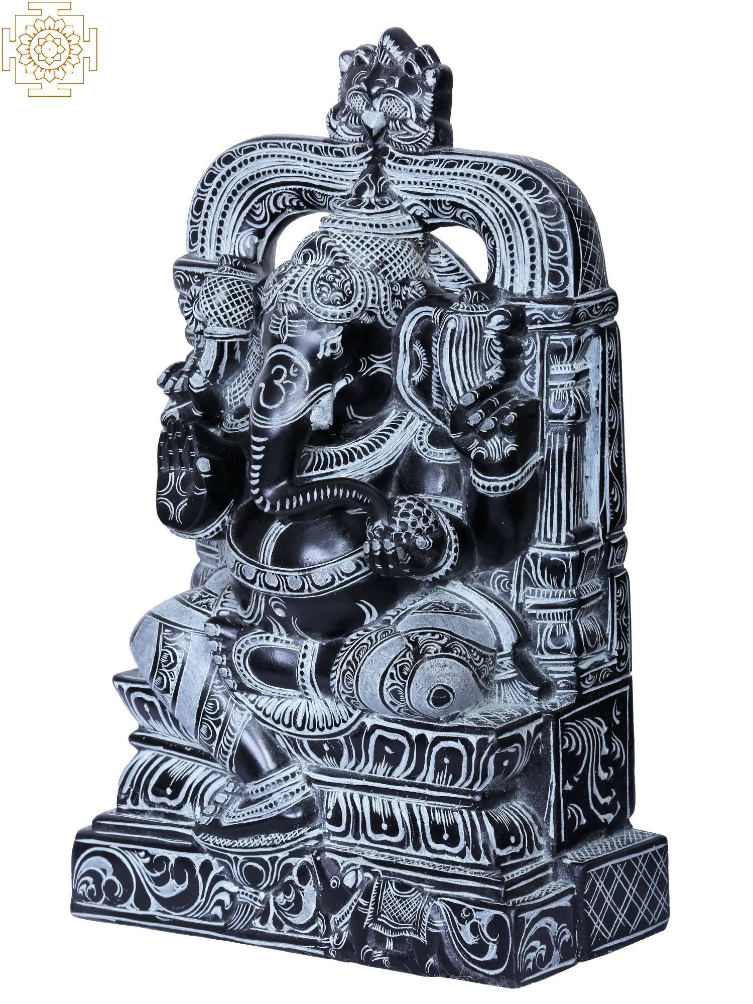 This magnificent stone statue depicts Lord Ganesha, the beloved elephant-headed deity, seated in a posture of regal grace upon an ornate throne. Crafted with exceptional skill by artisans from South India, a region renowned for its ancient sculptural traditions, this piece embodies centuries of artistic heritage. The deep, rich stone, meticulously carved, lends a sense of gravitas and timelessness to the representation. Lord Ganesha, revered as the remover of obstacles, the patron of arts and sciences, and the intellect personified, is invoked at the commencement of any new venture, be it a journey, a project, or the beginning of a new chapter in life. His presence is believed to bring good fortune, prosperity, and success.