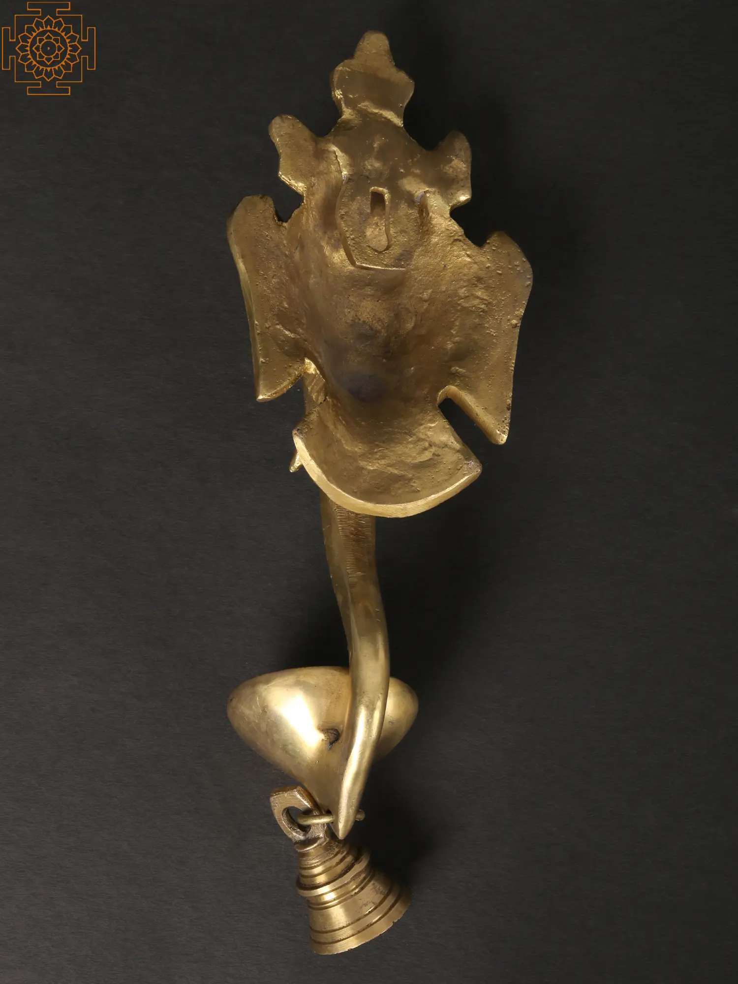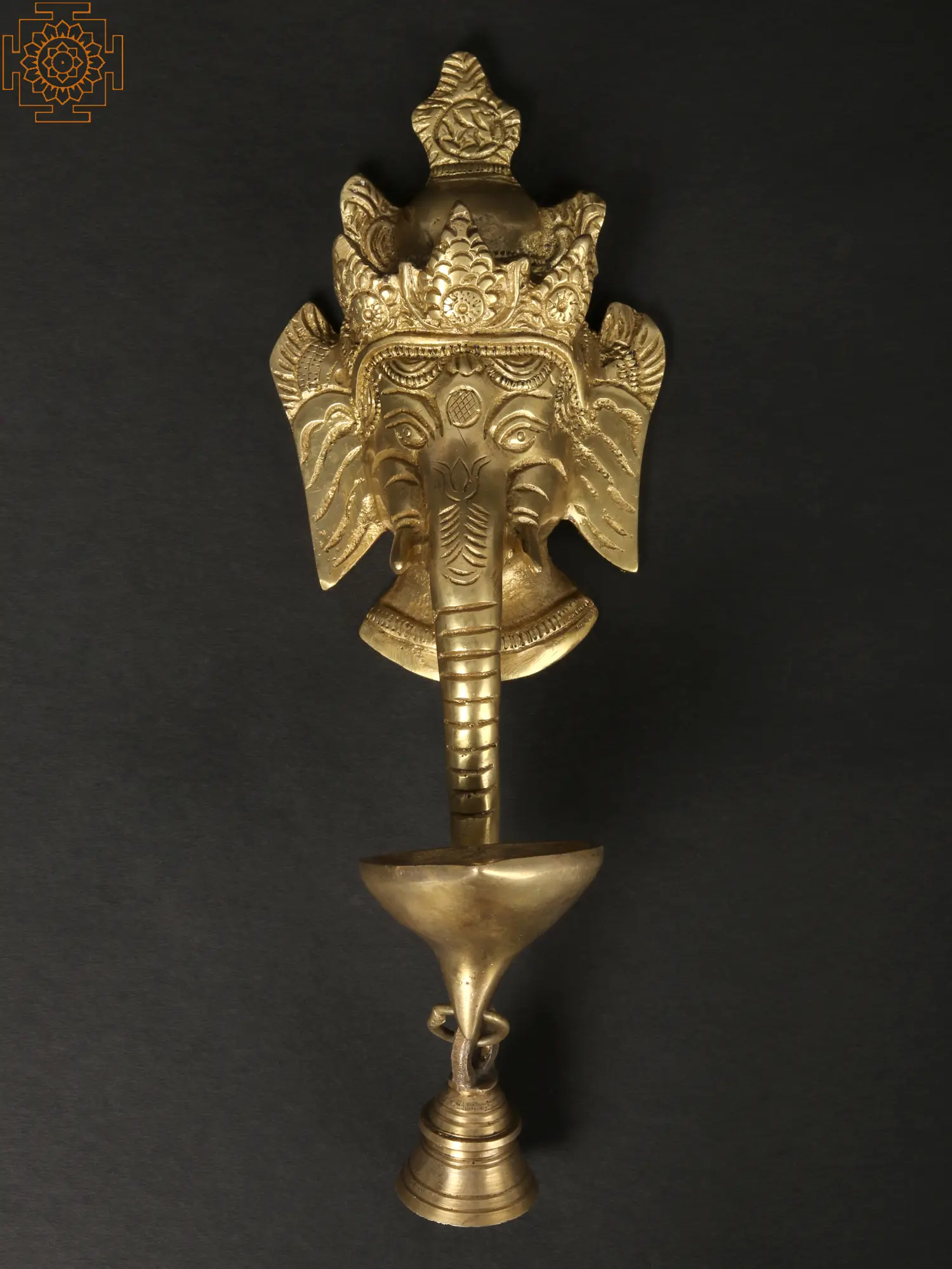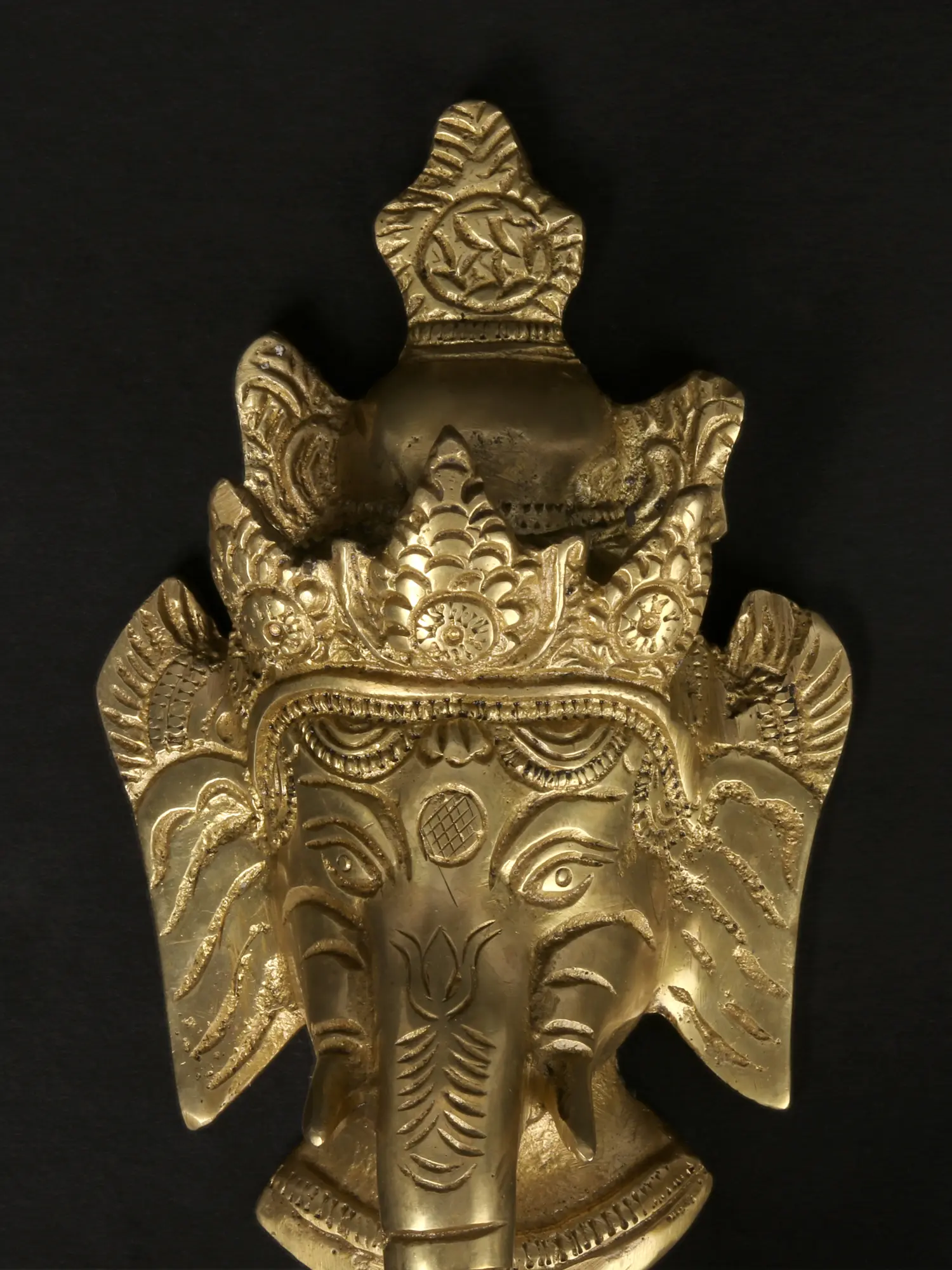 The statue crafted by skilled hands in India, this brass wall-hanging mask of Lord Ganesha exudes a sense of divine energy. Ganesha, the elephant-headed deity, symbolizes wisdom and the removal of obstacles. In his four hands, he holds his favourite modak sweet, symbolizing the sweetness of life, a noose to capture difficulties, an elephant goad for guidance, and bestows blessings with the fourth. The addition of a diya (lamp) and a bell adds to the charm, representing the illumination of knowledge and the calling of devotees to prayer. This piece is not just art; it's a spiritual journey.