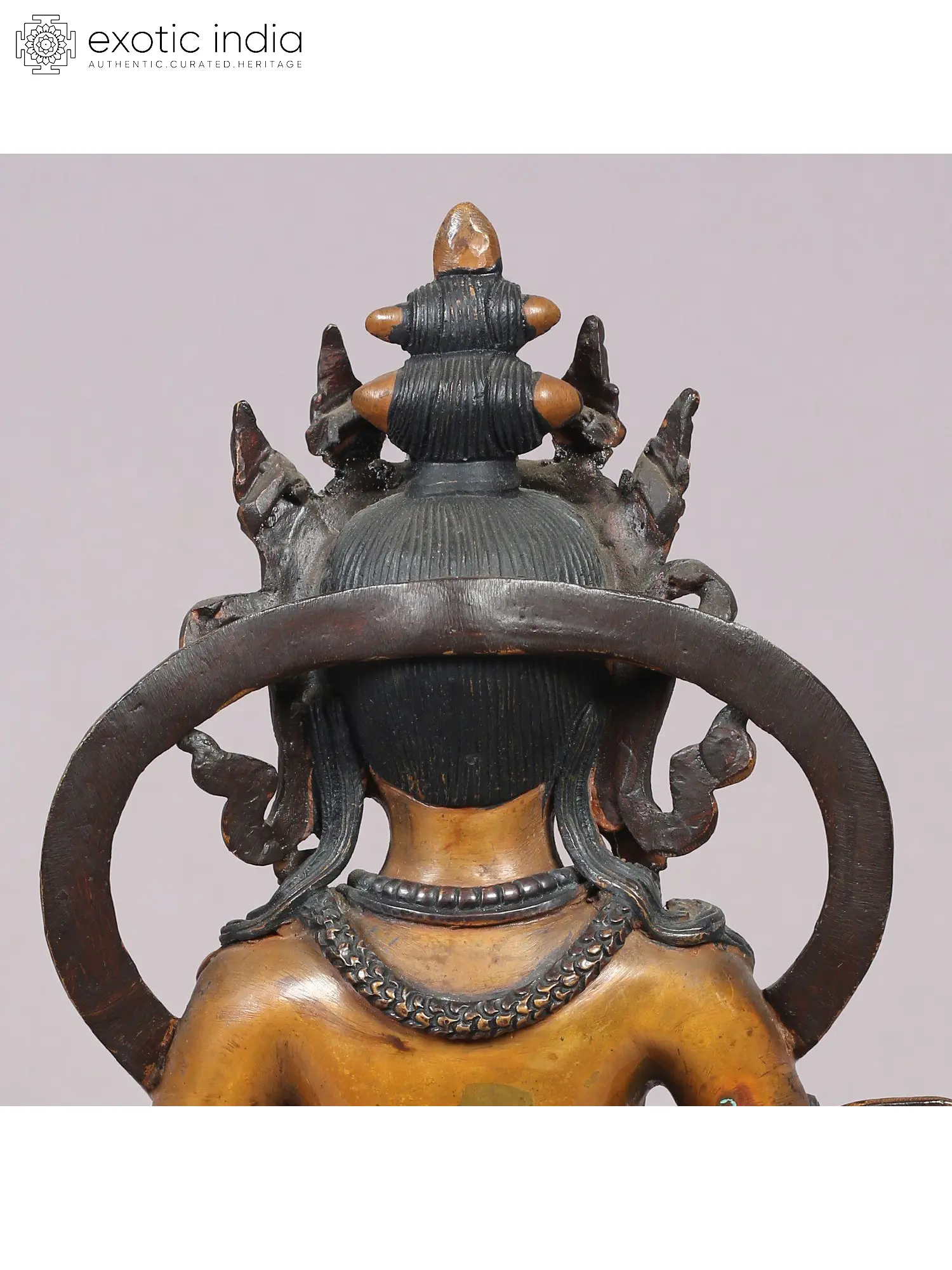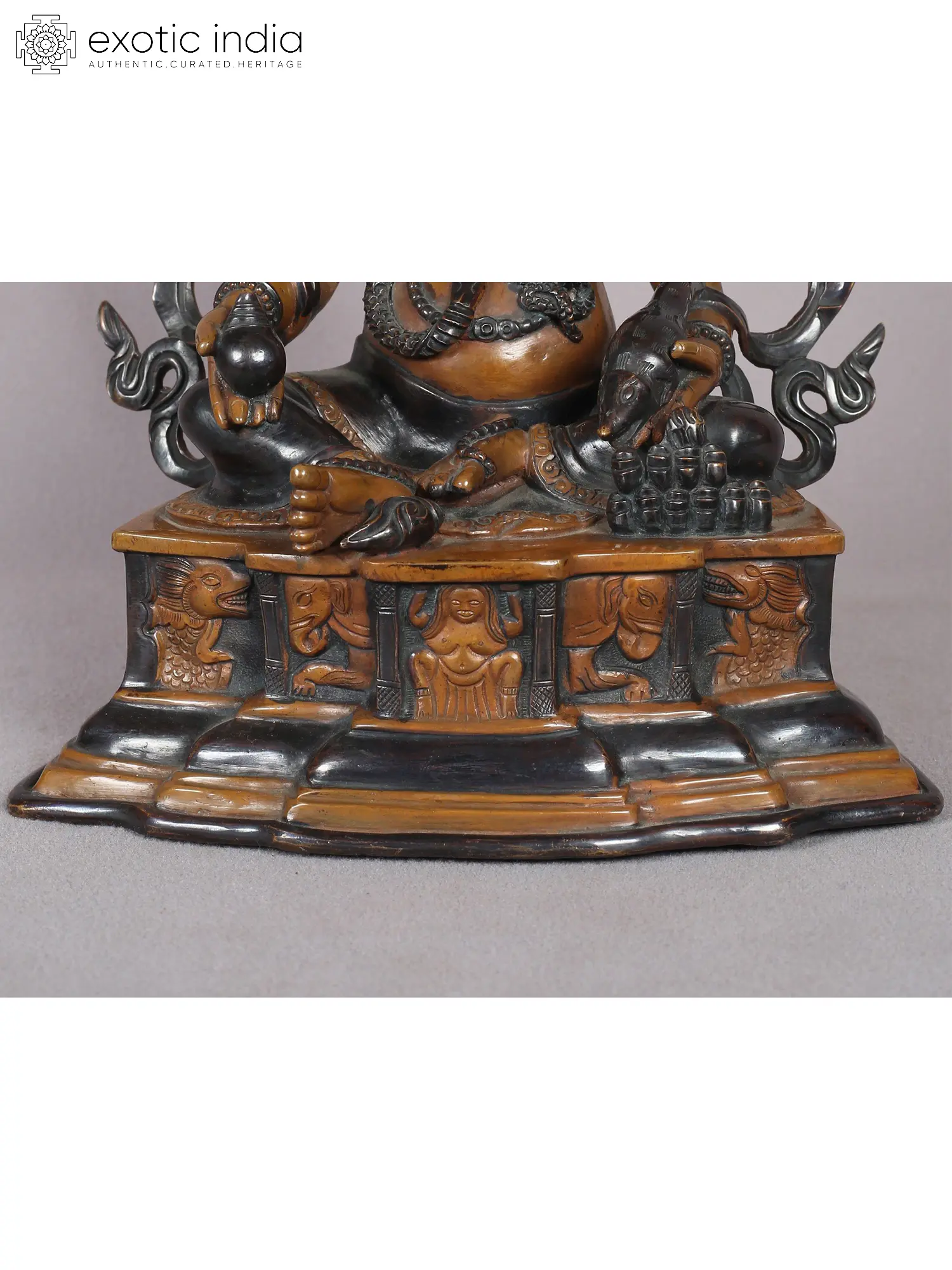 The depiction showcases Kubera as a plump figure with a large paunch, emphasizing his association with prosperity and abundance. The sculptor skillfully captures the fierce expressions of his face mask, adding to the realism of the portrayal. Seated in a distinctive posture on a moon disc, the sculpture is expertly crafted with a beautiful dark copper finish, reflecting the rich cultural tradition of Nepal. This sculpture serves as a divine representation, invoking the blessings and abundance associated with Kubera, the revered deity of wealth.