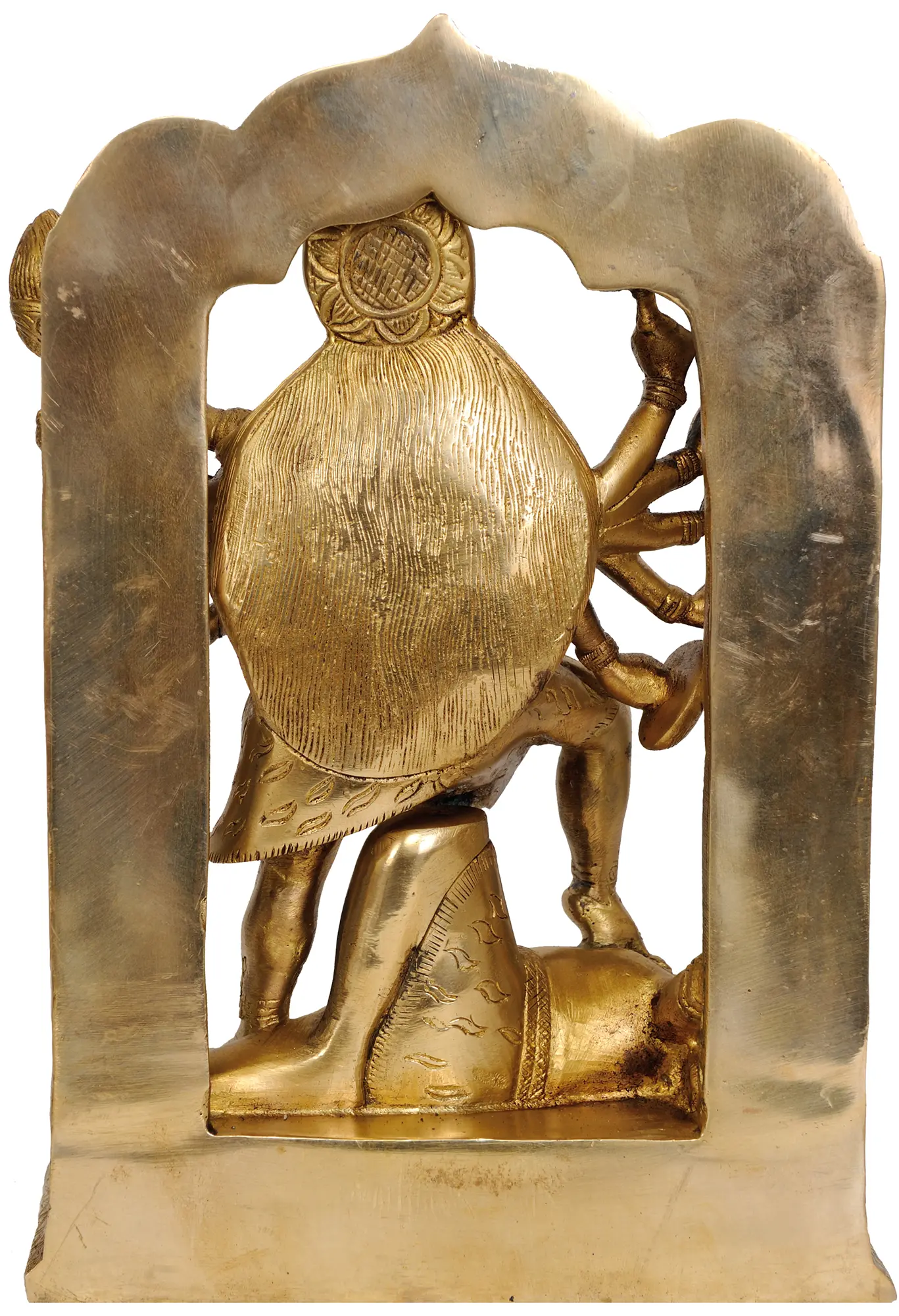 The multi-armed depiction of Mahakali is a central theme, with each limb and hand conveying a significant aspect of her divine might. She holds various potent weapons and symbols: a curved sword signifying the power to sever illusions and ego, a trident representing the three aspects of existence (creation, preservation, and destruction), and a severed head, symbolizing the vanquishing of ignorance and the ultimate triumph of consciousness. Her stance, often depicted with one foot resting upon a prostrate figure, traditionally represents the subjugation of ego and demonic forces, illustrating her role as a protector against darkness and negativity. The intricate details of her adornments, including the garland of skulls and the dynamic drapery of her skirt, further emphasize her terrifying yet protective nature. The radiant aureole behind her, intricately carved, suggests her cosmic power and boundless energy.