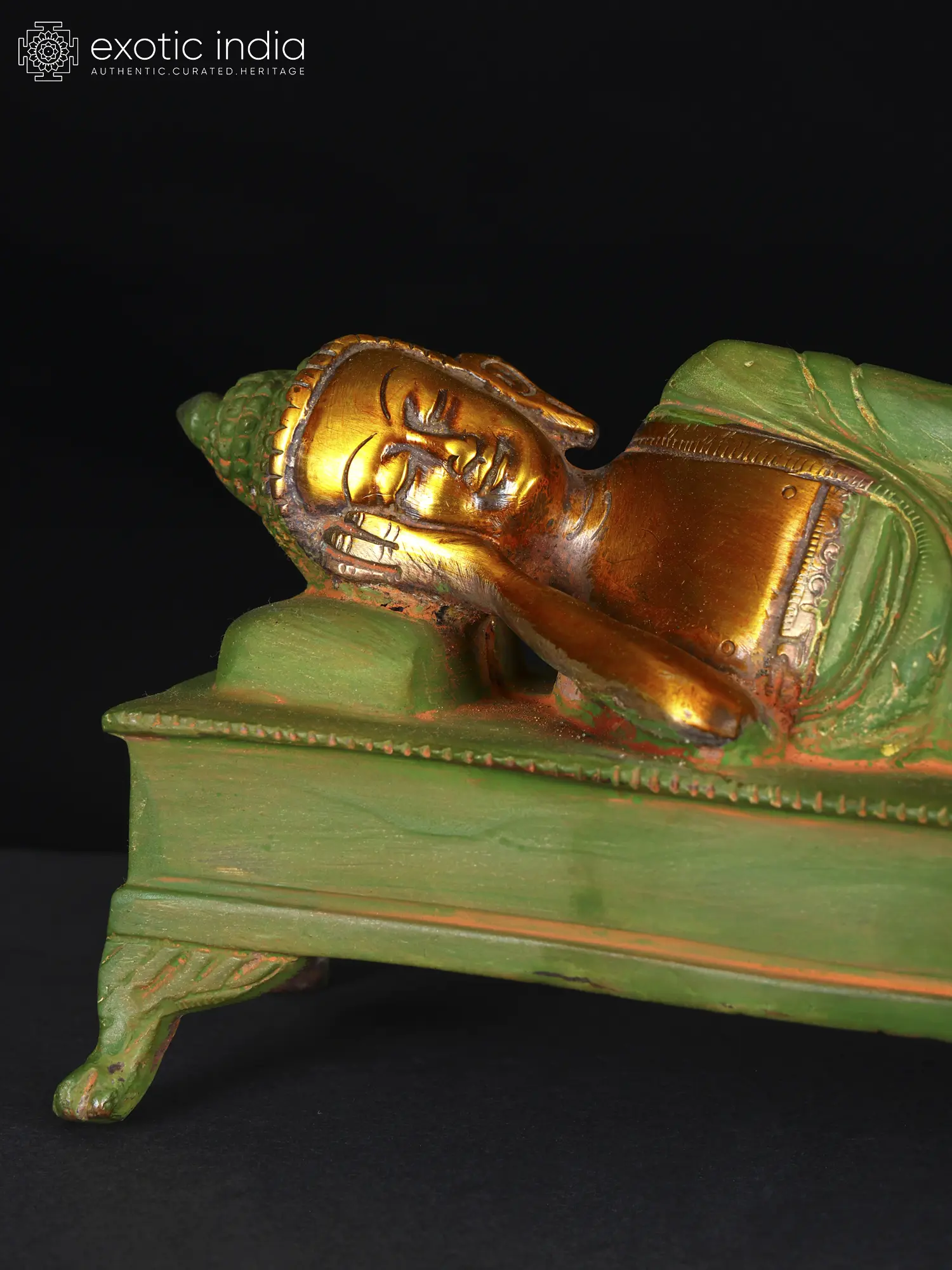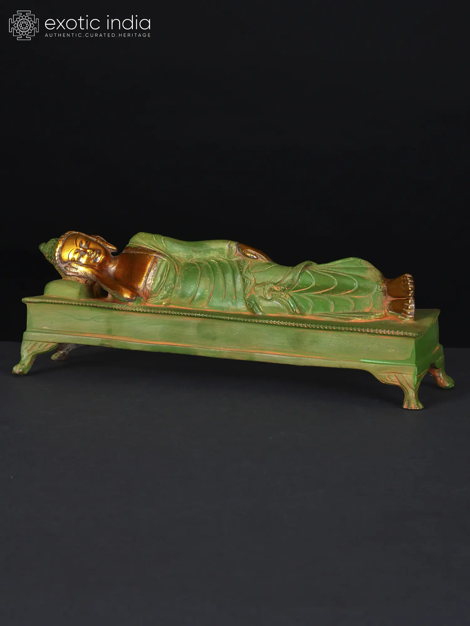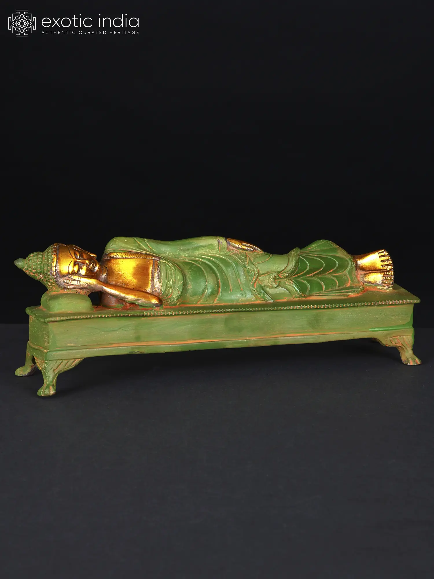 In this exquisite representation, the Mahaparinirvana Buddha reclines in tranquil repose, his physical form echoing the delicate balance between the impermanence of life and the enduring nature of enlightenment. The intricately carved contours of his form, from the gentle curve of his limbs to the serene expression upon his countenance, convey a sense of profound tranquillity — a testimony to the ultimate liberation attained through the journey of self-realisation.