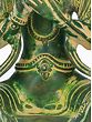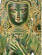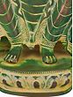 Shown with an extremely sweet and gentle countenance, Maiterya here holds in his right hand the stem of a lotus flower. The bloom of this blossom supports the Buddhist wheel of spiritual instruction. His left hand similarly bears a vase at the shoulder level, signifying immortality. Maitreya’s throne is tapering and edged; his feet resting on a lotus base. The folds of the dhoti clinging to his legs are rendered realistically.