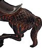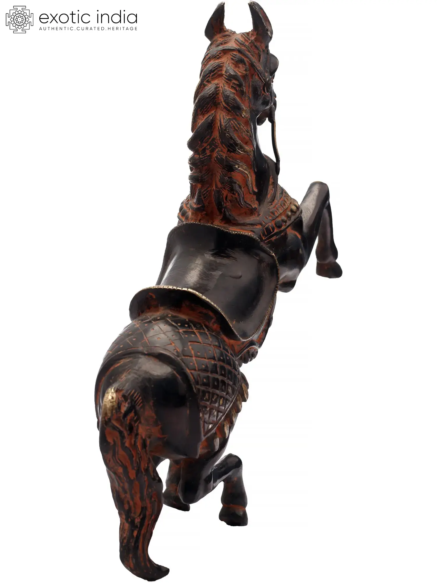 This magnificent brass sculpture captures the untamed spirit and noble bearing of a horse in mid-gallop. With its forelegs elegantly raised and its body poised for powerful movement, the piece evokes a sense of dynamism and freedom. The rich, dark patina, subtly highlighted with coppery undertones, gives the sculpture a vintage charm, suggesting a lineage of craftsmanship passed down through generations. Every detail, from the flowing mane and alert ears to the intricately adorned saddle and bridle, speaks of the artisan's dedication and skill.