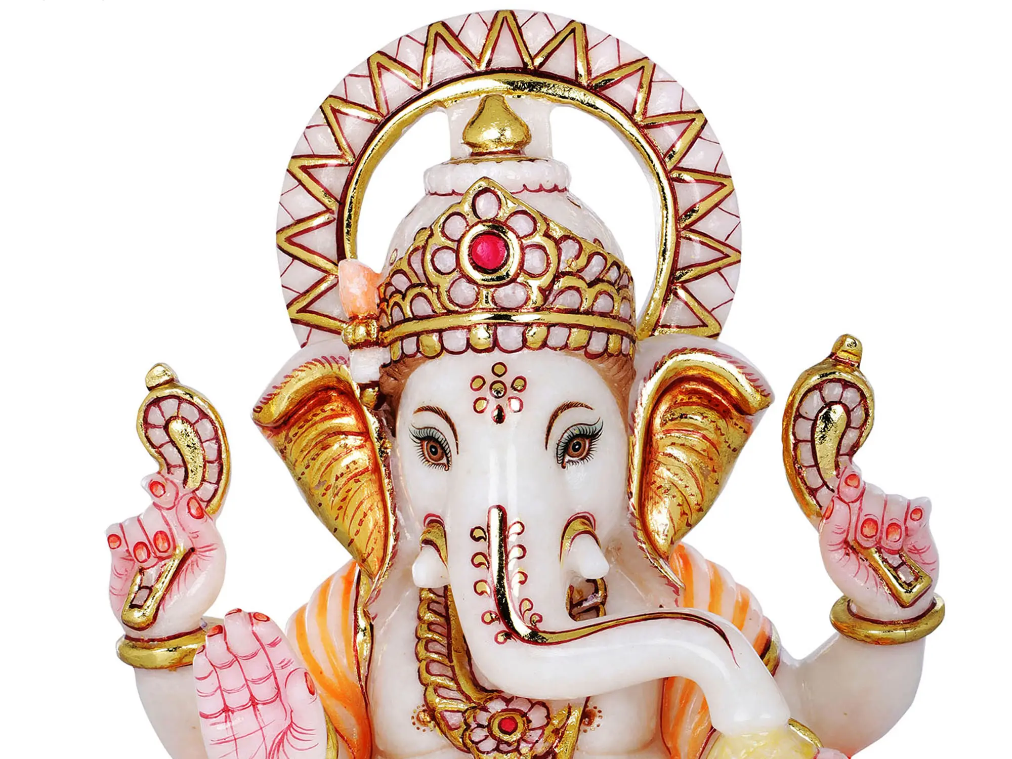 Invite divine blessings and remove obstacles with this exquisite white marble statue of Lord Ganesha. Each detail of this magnificent sculpture has been meticulously carved by skilled artisans, capturing the benevolent essence of the elephant-headed deity. Lord Ganesha, revered as the remover of hurdles and the god of wisdom, intellect, and good fortune, is depicted here in a posture of serenity and grace. The pristine white marble, a symbol of purity and divinity, serves as the perfect canvas for this sacred representation.
