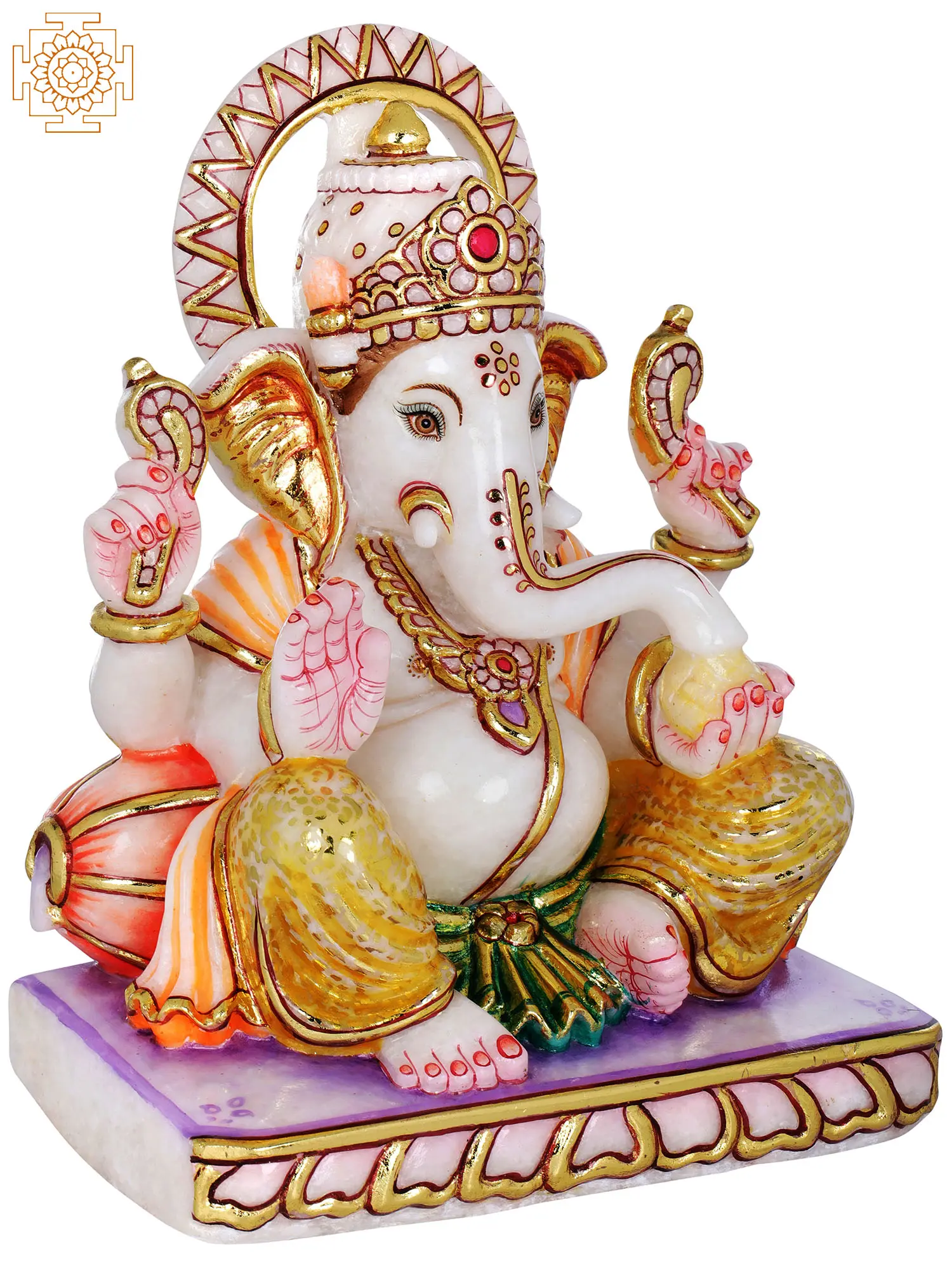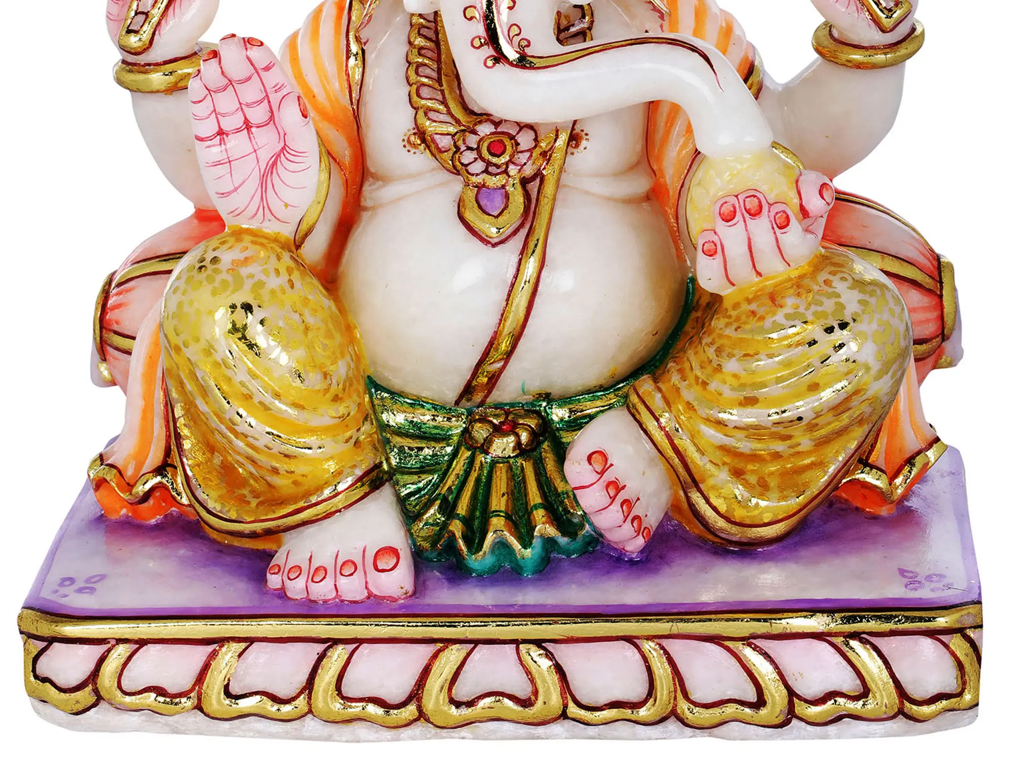This statue is a testament to the rich tradition of Indian craftsmanship. The smooth, cool touch of the marble is complemented by the vibrant, hand-painted details that bring Ganesha to life. His iconic elephant head, symbolizing strength and wisdom, is rendered with delicate features, while his large ears represent his ability to listen intently to the prayers of his devotees. The graceful curves of his trunk, often depicted holding a sweet, represent the sweetness of spiritual realization. The intricate crown and ornamental jewels adorning his form signify his divine status and regal presence. Each hand is posed in a mudra, or symbolic gesture, further enhancing the spiritual significance of the piece. The vibrant hues of orange, gold, and pink are applied with precision, creating a visually stunning and spiritually uplifting work of art.