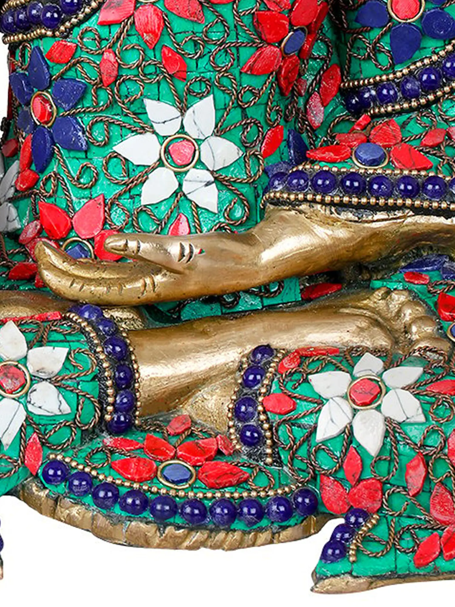 Crafted in India by skilled artisans, this 11-inch statue is a testament to the enduring traditions of Buddhist art. The use of brass, a metal associated with purity and divinity, lends the sculpture a timeless quality. The detailed inlay work, featuring a mosaic of stones and vibrant colors, transforms the statue into a living tapestry of healing energy. Each jewel is meticulously placed, creating a visual symphony that captivates the eye and soothes the soul. The robes are a particularly striking element, adorned with flowing patterns that suggest the dynamic nature of healing, constantly in motion, ever present. The presence of the Medicine Buddha is believed to bring health, longevity, and spiritual well-being to those who invoke his name.